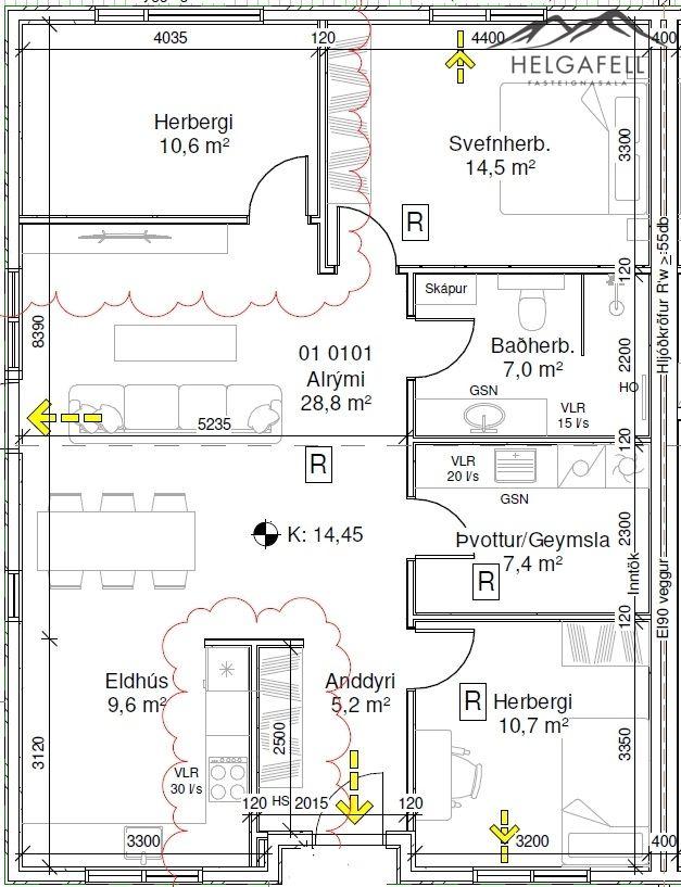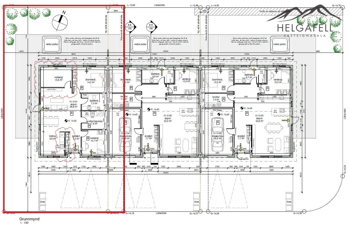 Hitalögn: Ísteyptar hitalagnir eru í öllum gólfum og verður tengigrind fyrir gólfhita frágengin. Stýringar og annar búnaður gólfhita fylgir ekki.