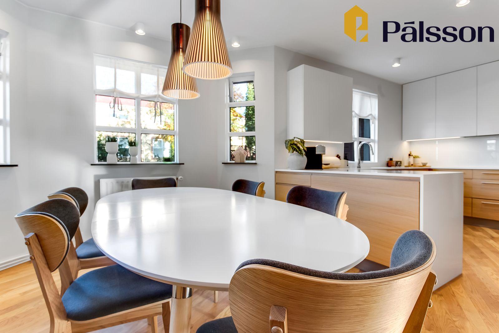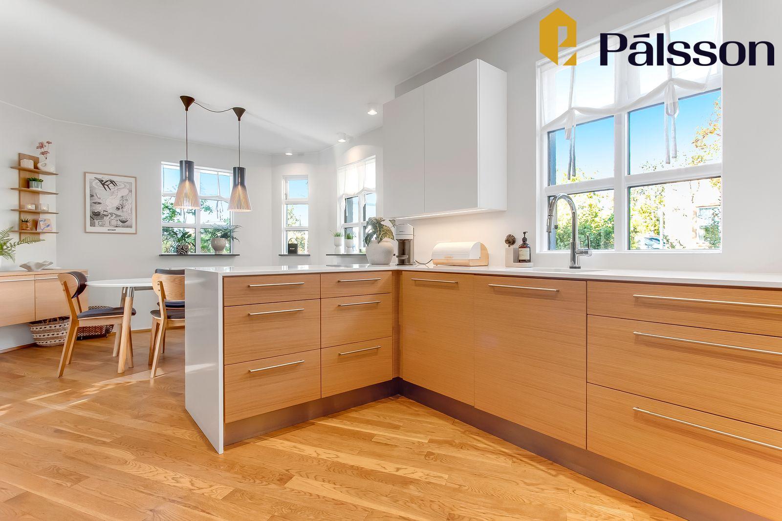 Eldhús endurnýjað 2019 – afar rúmgott með vönduðu helluborði, viftu, tveimur ofnum, góðri innréttingu og borðkrók. Parket á gólfi og gluggar sem hleypa inn fallegri birtu