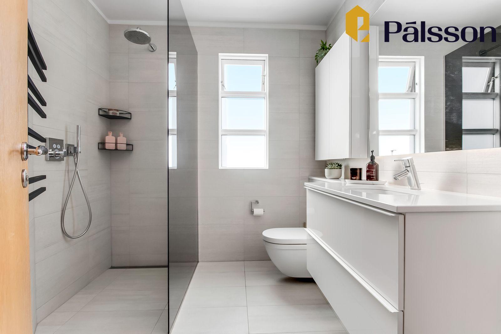 Baðherbergi endurnýjað 2019 – flísalagt, gólfhiti, handklæðaofn, sturta, upphengt salerni, innrétting og gluggi