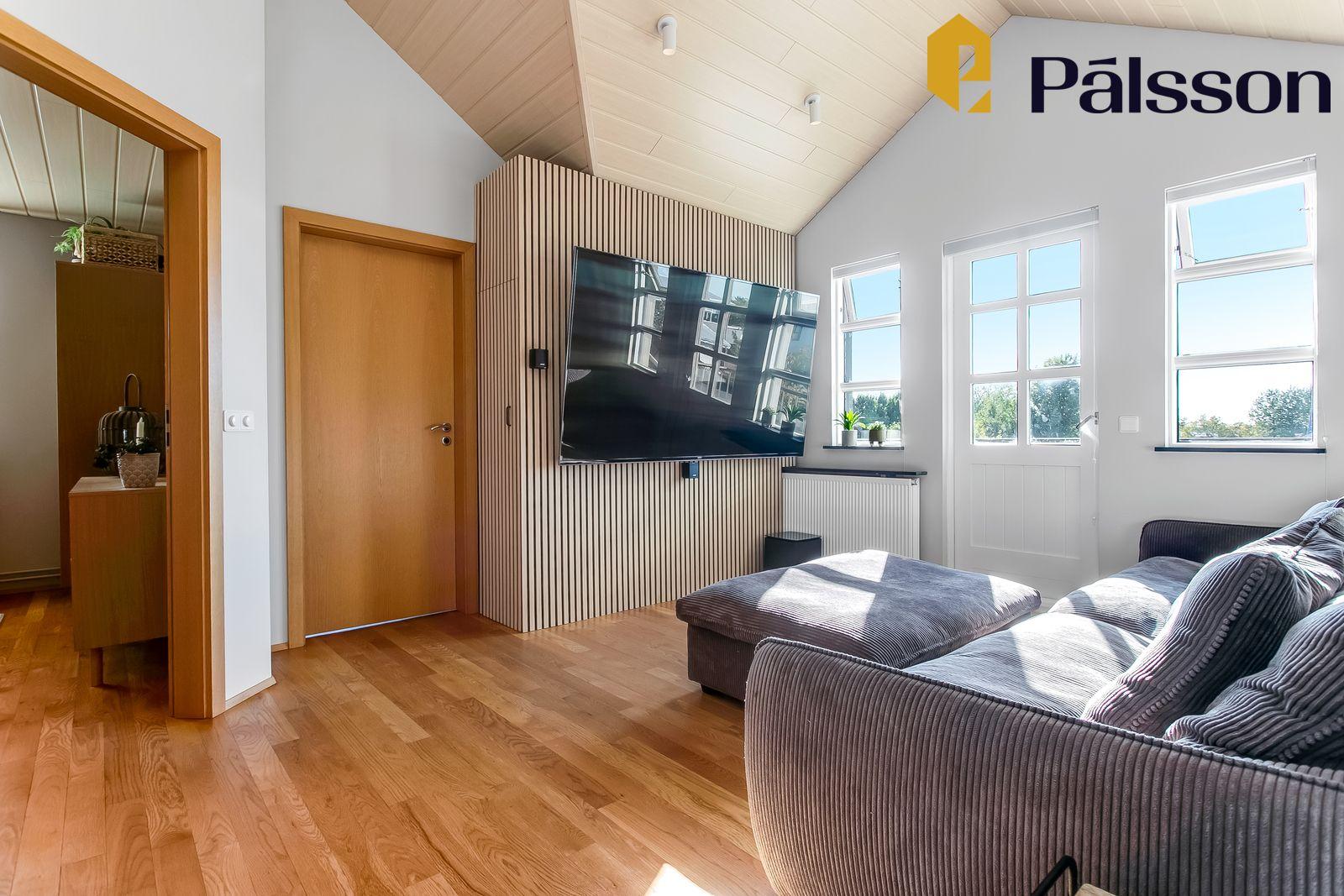 Sjónvarpshol með parketi á gólfi, suðurgluggum og útgengi á svalir til suðvesturs