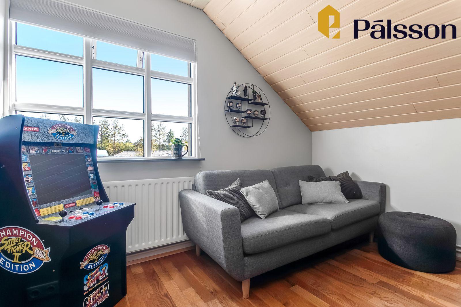 Stofa björt og rúmgóð með parketi á gólfi, arni og gluggum á tvo vegu. Tvær hurðir út í garðinn – önnur tvöföld. Útgengt á stóran sólpall með háum skjólveggjum, markísu og heitum potti