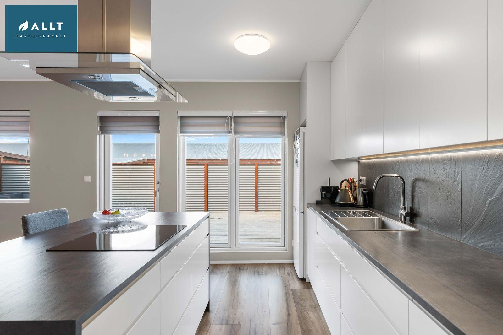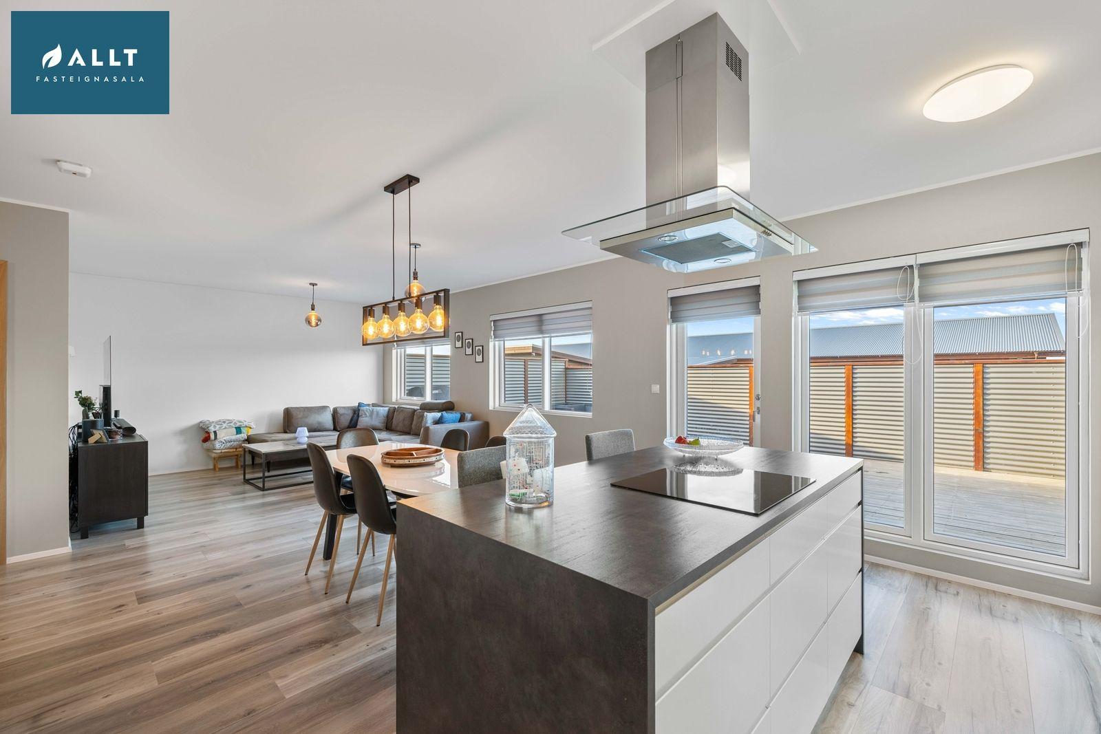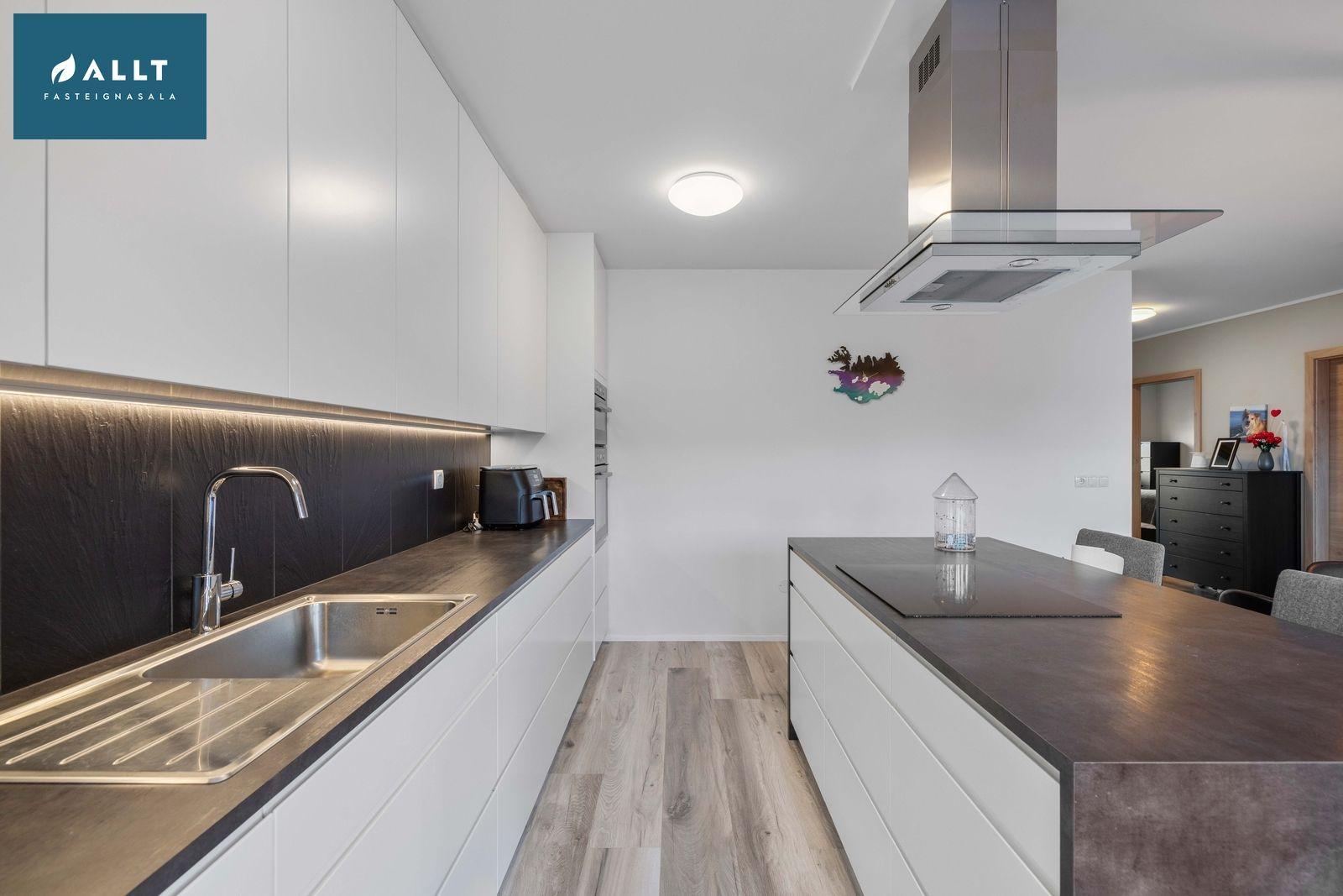 Eldhús er opið og bjart með parket á gólfi og fallegri hvítri eldhúsinnréttingu og eyju. Bakarofn, vaskur, helluborð og háfur.