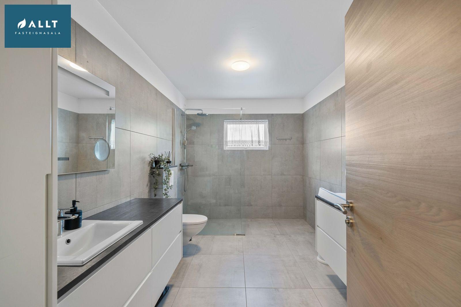Baðherbergi er flísalagt í hólf og gólf, góða hvíta baðinnrétingu, walk in sturtum og aðstöðu fyrir þvottavél og þurrkara.