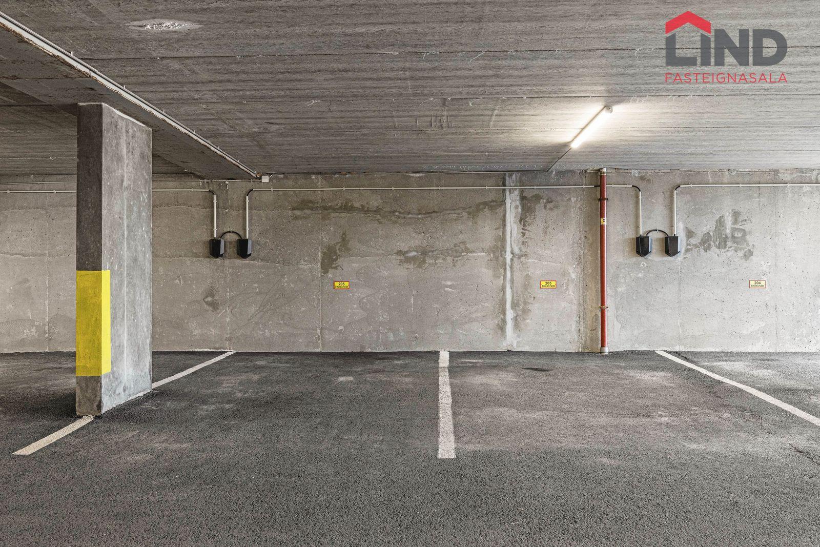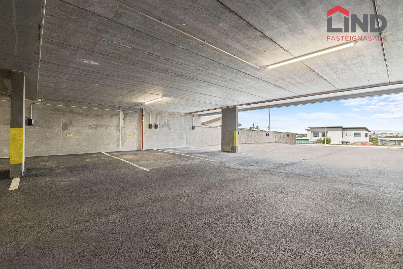 Bílastæði, tvö merkt stæð í bílskýli, merkt 01B006 og 01B007. Stæðin eru hlið við hlið og búið að leggja fyrir hleðslustöðvum.