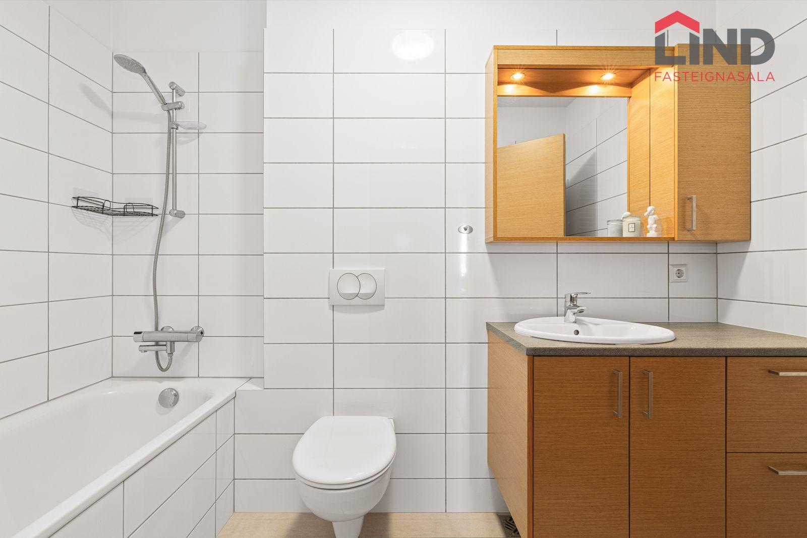 Baðherbergi, flísalagt með ljósri innréttingu, upphengdu salerni og baðkari með sturtustöng.
