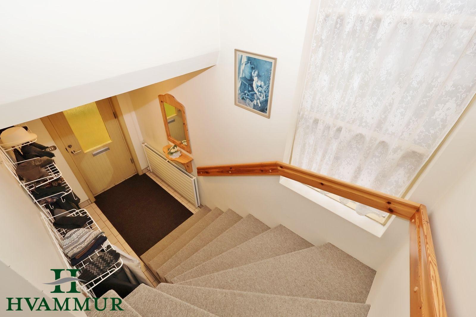 Forstofa er með flísum á gólfi. Úr forstofu er gengið upp steyptan og teppalagðan stiga. Eldhús, vel um gengin upprunaleg innrétting með góðu skápa- og bekkjarplássi. Rúmgóður borðkrókur og dúkur á gólfum. Gengið er inn í eldhúsi af holi og úr stofunni. Stofa er með ljósu plast parketi á gólfi og gluggum til þriggja átta. Hol hefur nýst sem sjónvarpshol og þar er ljóst plast parket á gólfi. Svefnherbergin eru eru þrjú, tvö barnaherbergi með spónaparketi á gólfi og annað með fataskáp og hjónaherbergi með ljósu plast parketi, tvöföldum skáp og hurð út á steyptar suðvestur svalir. Baðherbergi er með flísum á gólfi, upprunalegri innréttingu, wc, handklæðaofni, baðkari með sturtutækjum og opnanlegum glugga. Þvottahús og búr eru inn af eldhúsinu, þar er lakkað gólf, skolvaskur, hillur og opnanlegur gluggi. Steyptur stigi er úr þvottahúsinu og niður að bakinngangi.