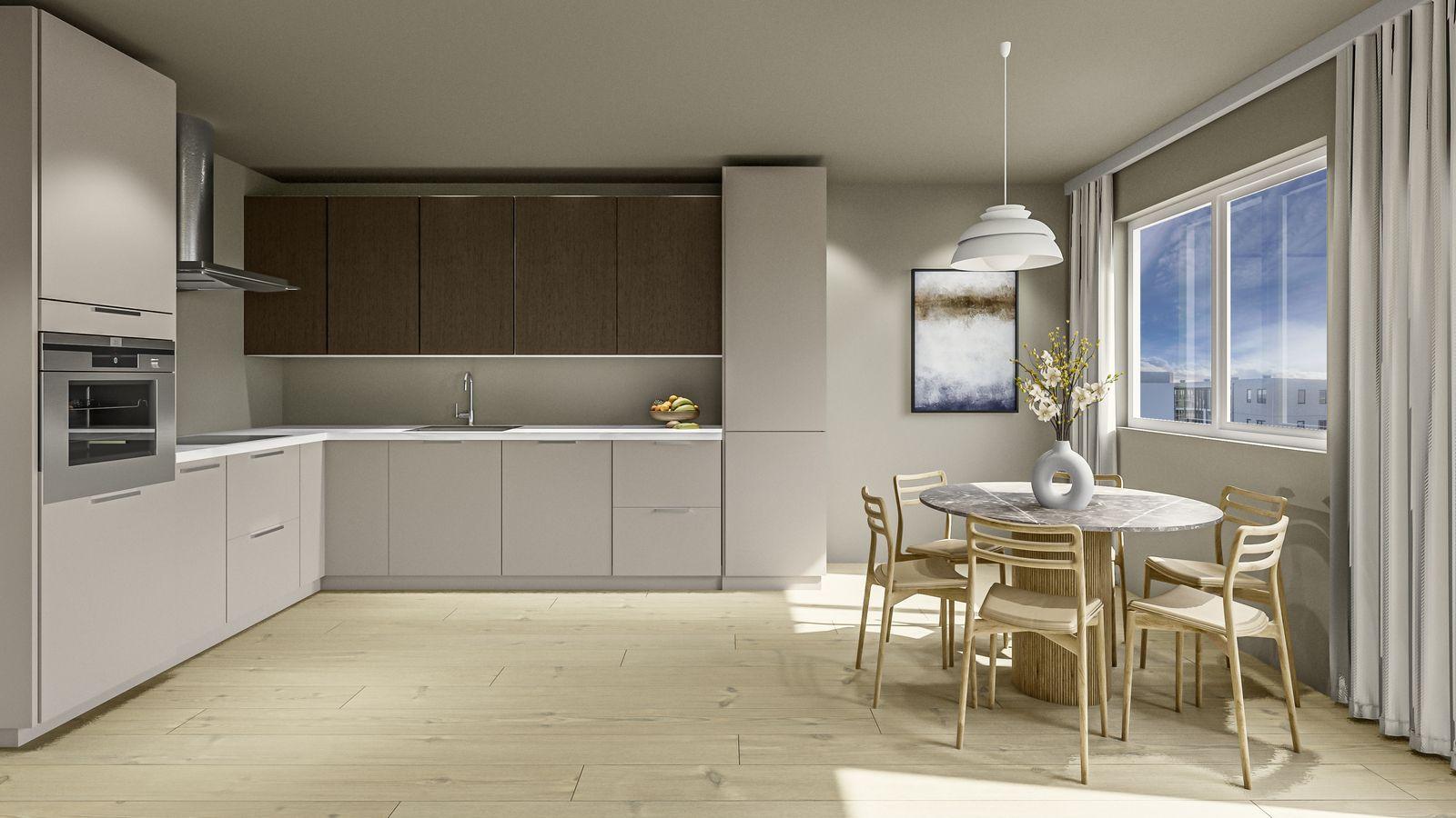 Eldhús/stofa: Alrými, eldhúsinnrétting er tvítóna, með dökkri viðaráferð á efri skápum og ljósum neðri skápum. Heimilistækin eru frá Ormsson, helluborð, ofn, háfur, innbyggð uppþvottavél og ísskápur. Úr alrými er útgengi á skjólgóðar svalir.