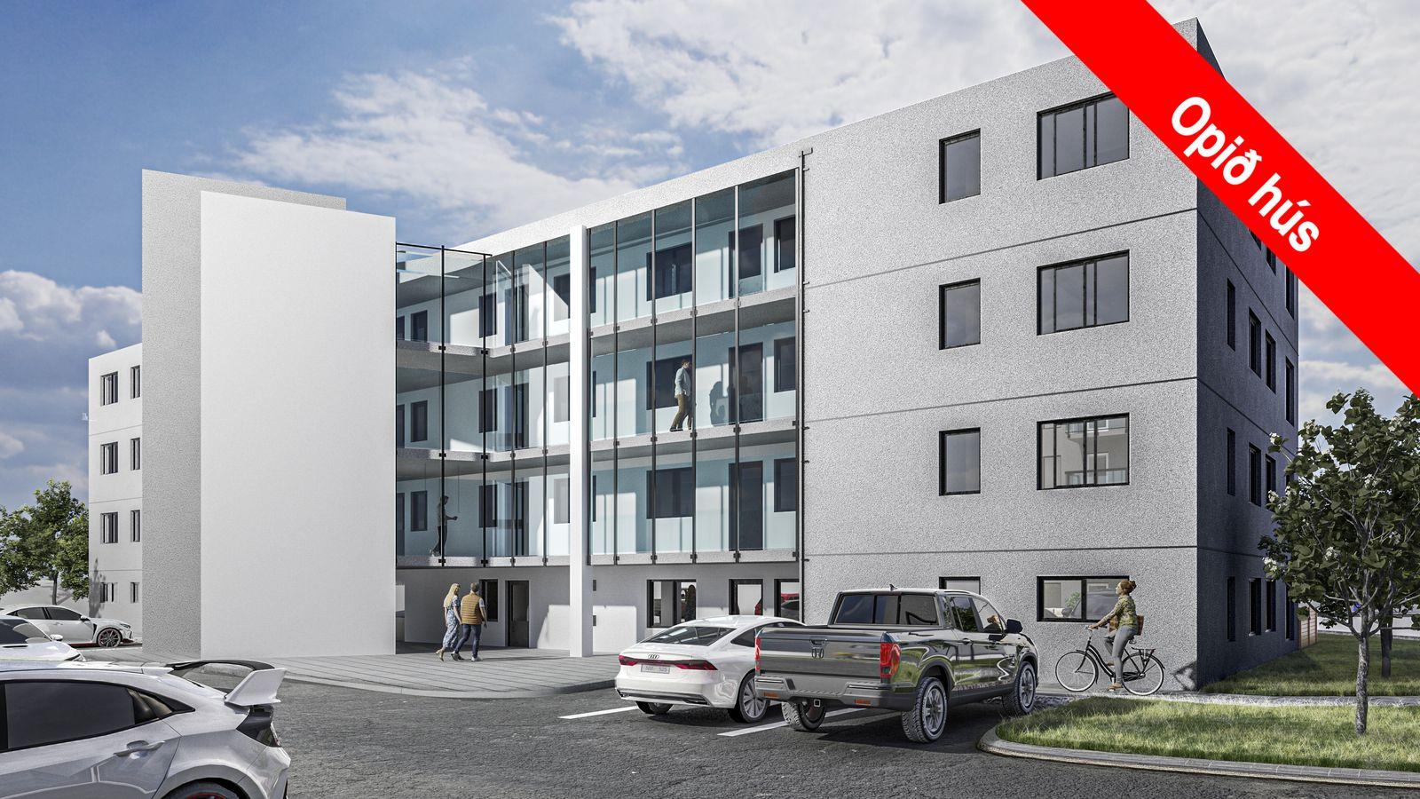 Gimli fasteignasala kynnir 4ra herbergja endaíbúð á þriðju hæð með sérinngangi af svölum í vönduðu nýju lyftuhúsi. Eignin verður tilbúin til afhendingar í byrjun árs 2026. Íbúðin sem er 98,9 fm að stærð (4,6 fm geymsla innan íbúðar) skilast fullfrágengin án gólfefna á meginrýmum en gólf votrýma verða flísalögð. Gluggar og svalahurðir eru ál/tré frá Gluggatækni ehf. Innréttingar og skápar frá HTH. Eldhúsinnrétting er tvítóna, með dökkri viðaráferð á efri skápum og ljósum neðri skápum. Aðrar innréttingar eru ljósar. Heimilistæki eru frá Ormsson, helluborð, ofn, háfur og innbyggð uppþvottavél. Innihurðir eru með mattri hvítri áferð og eru yfirfelldar. Gólf á baðherbergi er flísalagt og veggir flísalagðir að hluta, flísar frá Álfaborg. Á baði er upphengt salerni, sturta, vegleg vaskinnrétting, speglaskápur og innrétting fyrir þvottavél og þurrkara. Húsið er byggt úr forsteyptum einingum með staðsteyptum milliplötum.