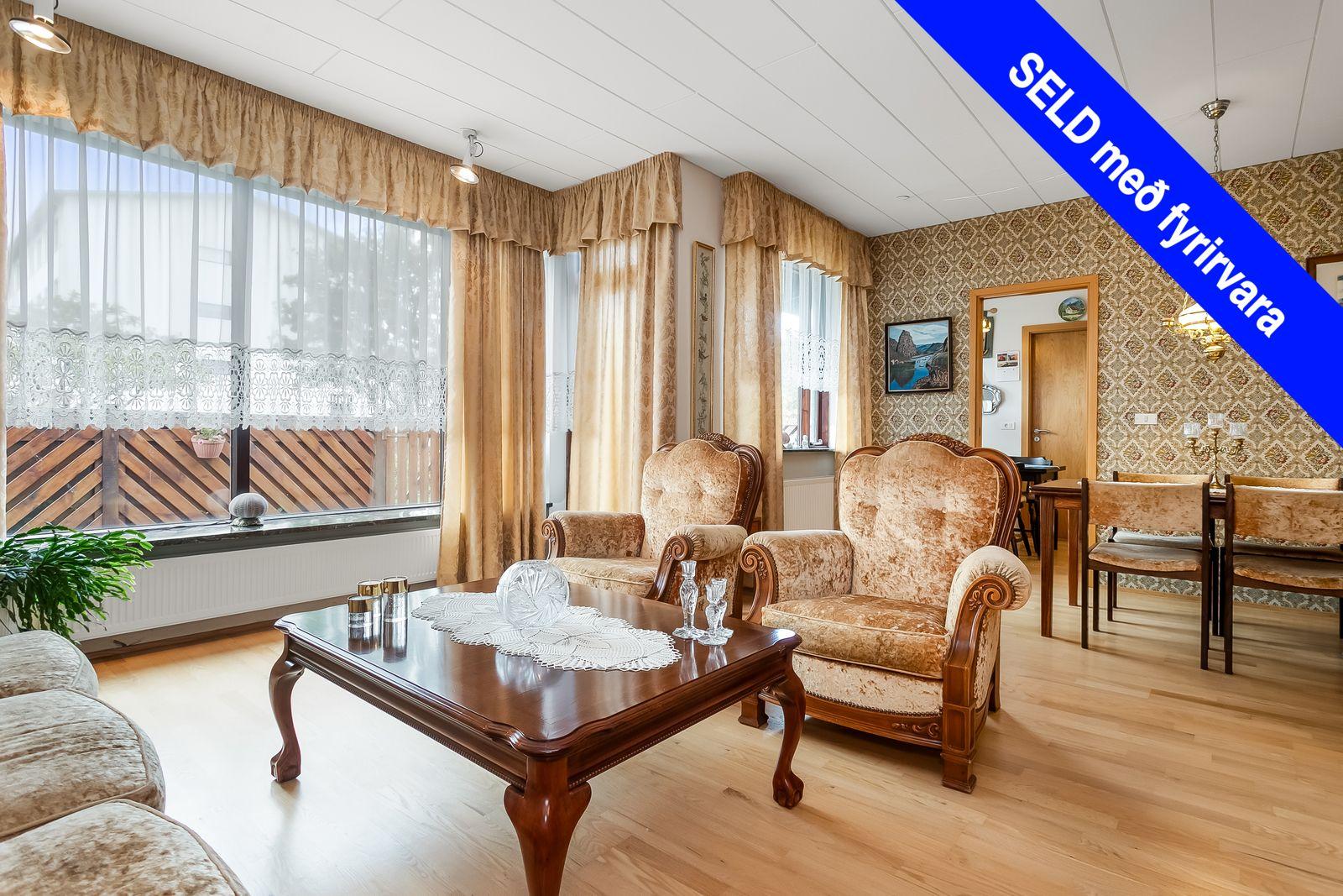 Gólfefni: Parket er á gólfum, nema á baðherbergi, forstofu og gestasnyrtingu þar sem eru flísar, og málað gólf í þvottaherbergi.