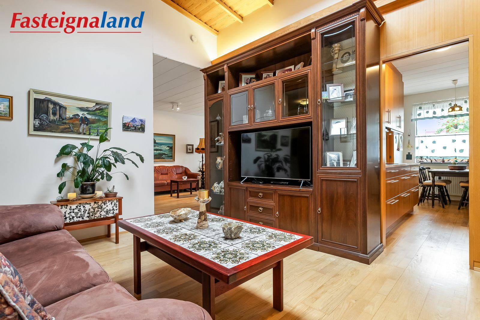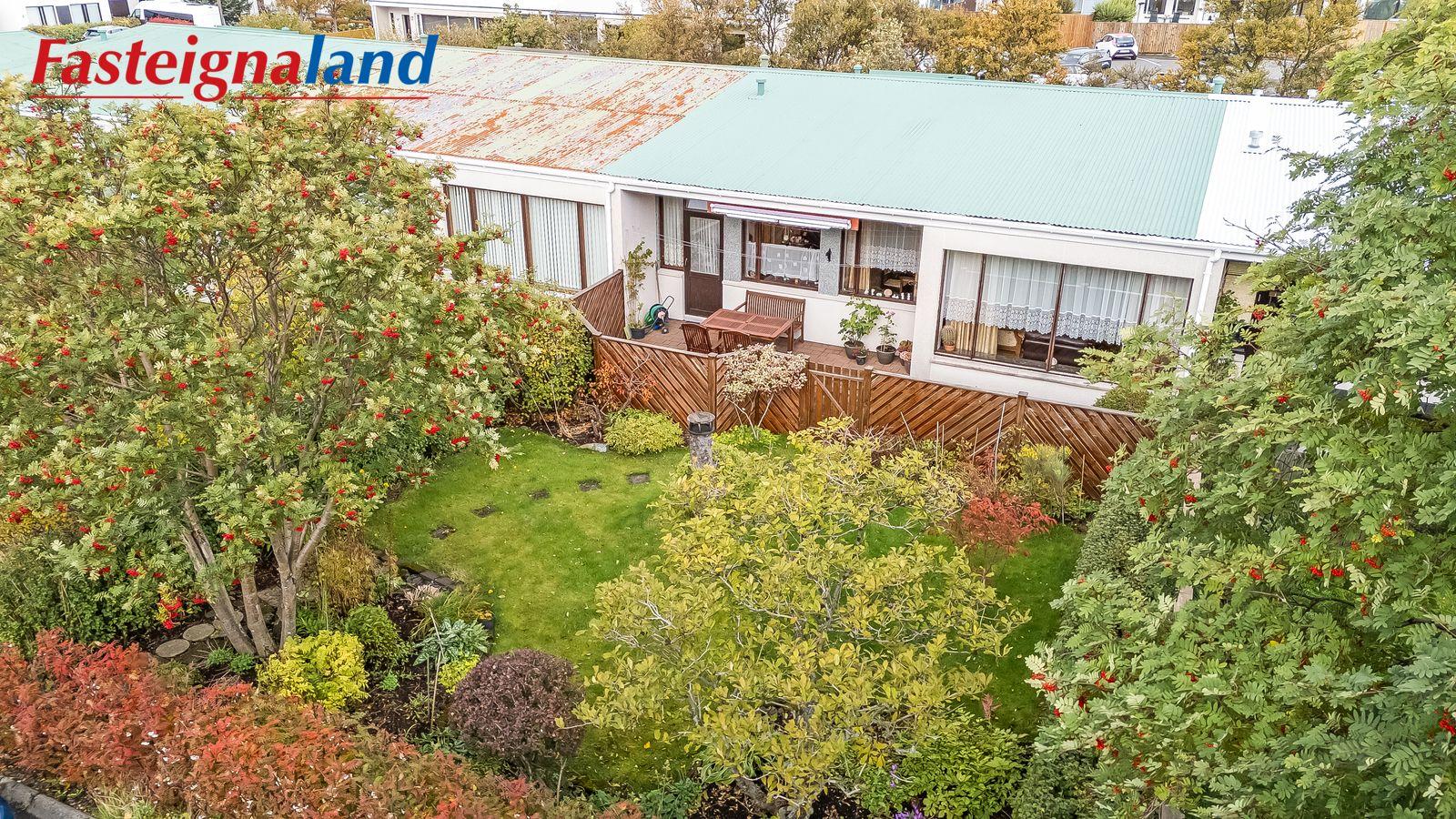 Nánari lýsing: Komið er inn í forstofu með fataskáp og er gestasnyrting þar inn af. Inn af forstofu er sjónvarpshol með þakglugga og hátt til lofts. Sofa og borðstofa með útgengi út á verönd og garð. Lóðin er falleg og velhirt fyrir framan og aftan hús. Í björtu eldhúsi er eikarinnrétting með flísum á milli efri og neðri skápa og góðri borðaðstöðu. Opið er frá eldhúsi inn í borðstofu. Inn af eldhúsi er þvottaherbergi með útgengí út á baklóð. Inn af þvottaherbergi er góð geymsla með hillum. Hjónaherbergi er með góðum fataskáp. Tvö svefnherbergi eru til viðbótar og er annað þeirra með fataskáp. Mögulegt að bæta við herbergi þar sem borðstofa er í dag. Endurnýjað flísalagt baðherbergi, falleg ný innrétting, walk inn sturta , handklæðaofn, upphengt salerni.