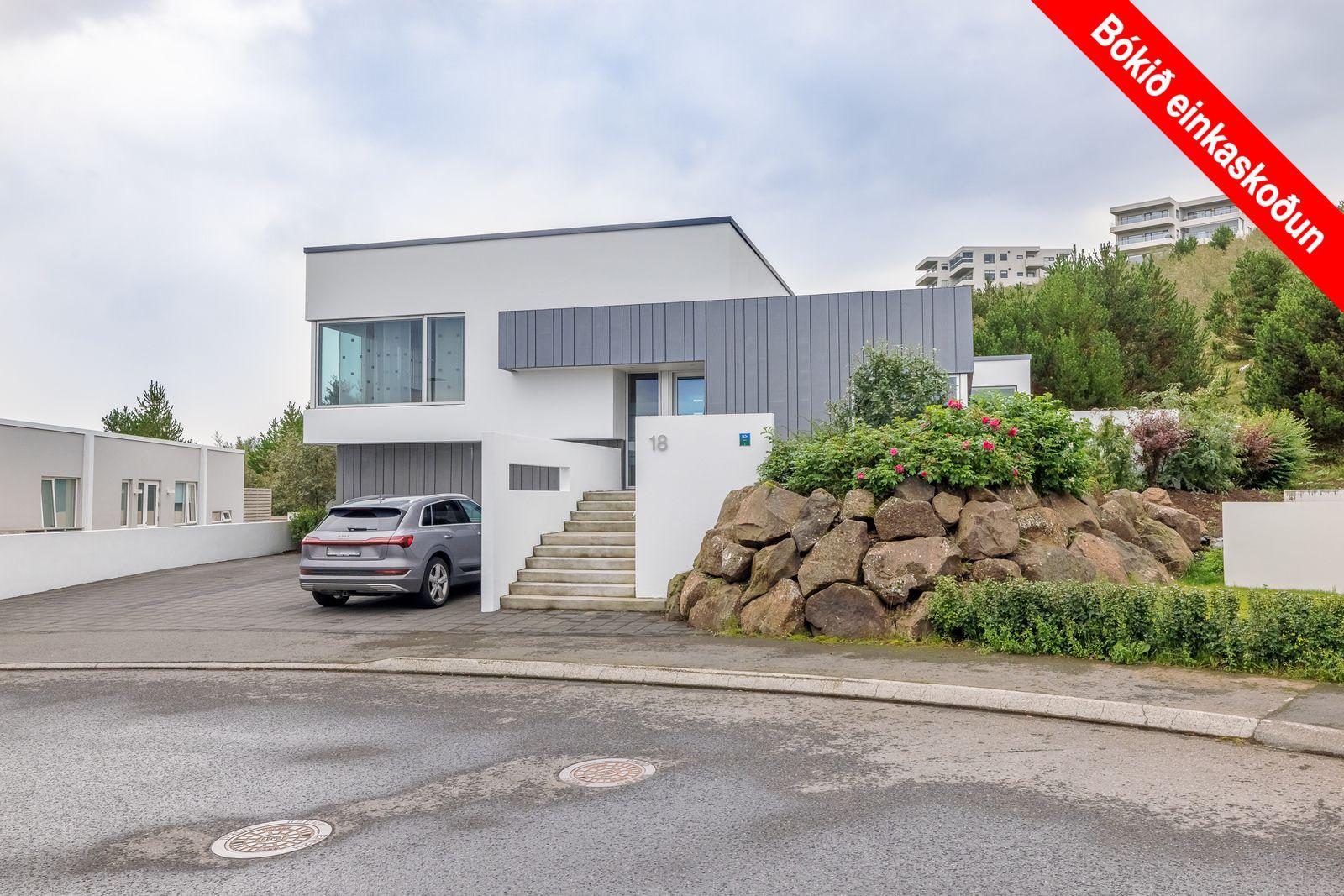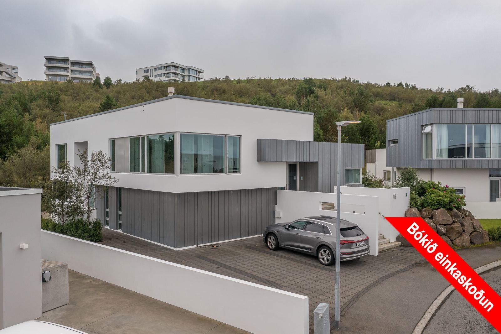 Húsið Örvasalir 18 er einbýlishús sem stendur á fallegri lóð í jaðri byggðar ofan við golfvöll GKG. Ofan við húsið er ósnortið skógi vaxið land en norðan megin blasir við fallegt útsýni yfir borgina. Við hönnun hússins var leitast við að taka mið af þeim möguleikum sem lóðin bíður upp á og leitast við ð tengja saman innra og ytra rými. Húsið situr á landinu á fjórum pöllum og lagar sig að formi landsins. Gengið er inn í húsið á miðpalli. þar sem finna má eldhús, borðstofa, skrifstofu og forstofuherbergi. Millipallur tengist bakgarði sem snýr í suður með ósnortið skógi vaxið land allt í kring. Eldhús og borðstofa tengjast því vel útivistarsvæðum ofan við húsið. Á efsta palli hússins eru stofur og hjónaherbergi sem njóta fallegs útsýnis yfir borgina en á neðri pöllum hússins eru barnaherbergi, bílskúr og geymslurými. Efnisval hússins að utan er einfalt og látlaust. Hvítum múruðum flötum er telft saman við sinkklædd form. Hönnun innra rýmis hússins endurspeglar látlaust og stílhreint ytra byrði hússins. Innréttingar eru spónlagðar með eik og á gólfum er eikarparket og gráar steinflísar. Einstakt hús á einstökum stað.