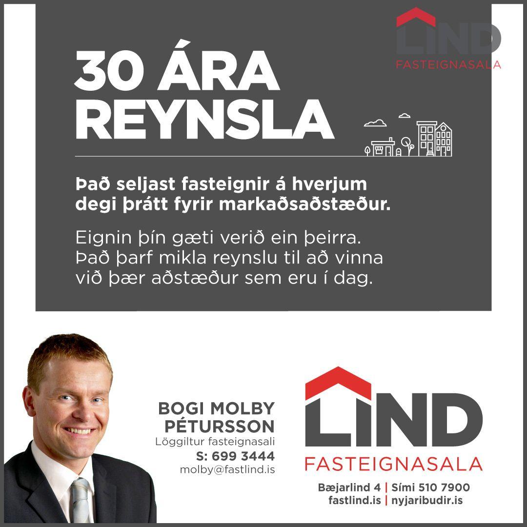 Allar frekari upplýsingar um eignina og skoðunartíma veitir: Bogi Molby Pétursson 6993444 / Molby@fastlind.is -Vegna mikillar eftirspurnar vantar allar tegundir eigna á skrá. -Hafðu samband og ég verðmet eignina þína. Gjöld sem kaupandi þarf að standa straum af vegna kaupanna: 1. Stimpilgjald af kaupsamningi - 0,4% (fyrstu kaup), 0,8%(einstaklingar) 1.6% (lögaðilar) af heildarfasteignamati. 2. Lántökugjald af veðskuldabréfi mishátt milli lánastofnuna. Nánari upplýsingar á t.d. heimasíðu lánastofnana. 3. Þinglýsingargjald af kaupsamningi, veðskuldabréfi, mögulegu veðleyfi o.fl. - kr. 2.700 af hverju skjali. 4. Umsýslugjald til fasteignasölu 74.900.kr