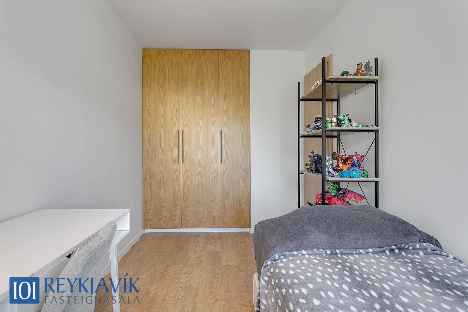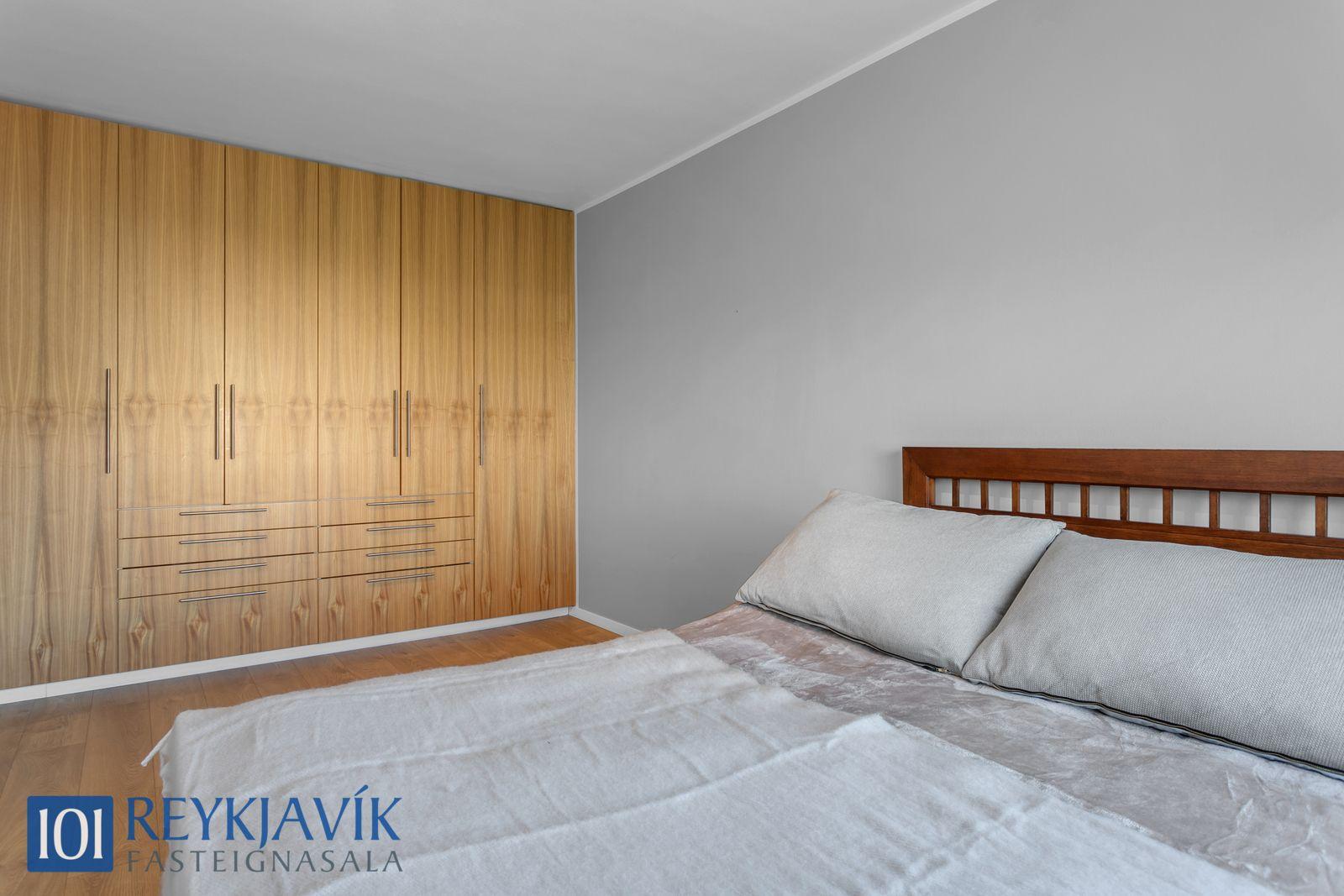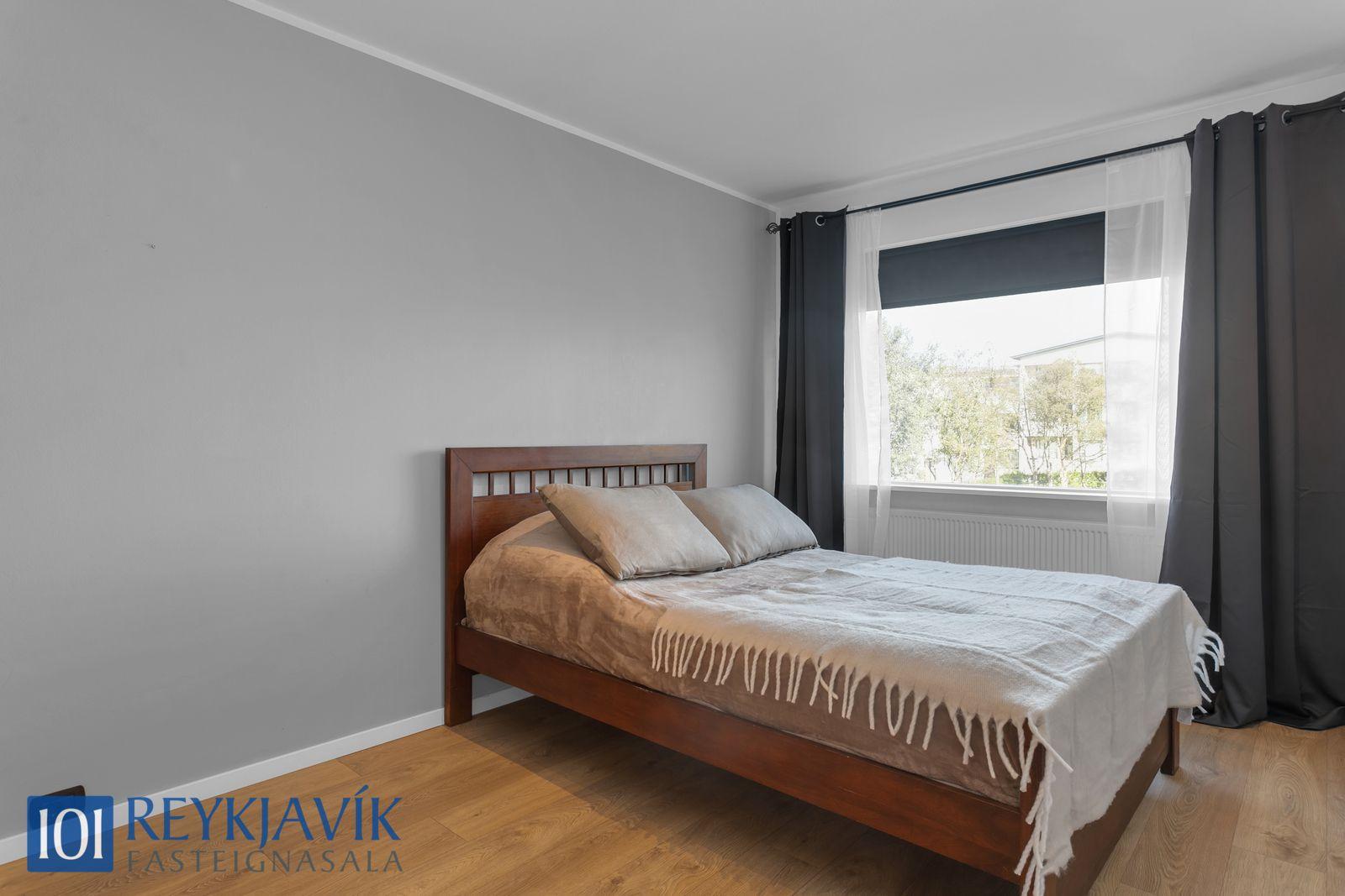 Herbergi snúa í norður að grænu sameiginlegu svæði bakatil við húseign. Einkar gott skápapláss er í innbyggðum skápum herbergja. Tvö parketlögð svefnherbergi hlið við hlið á gangi, bæði með innbyggðum skápum.