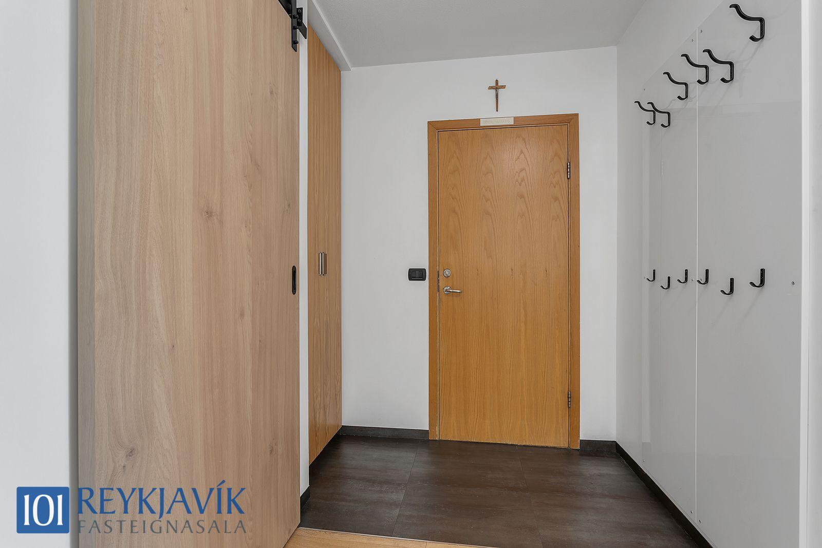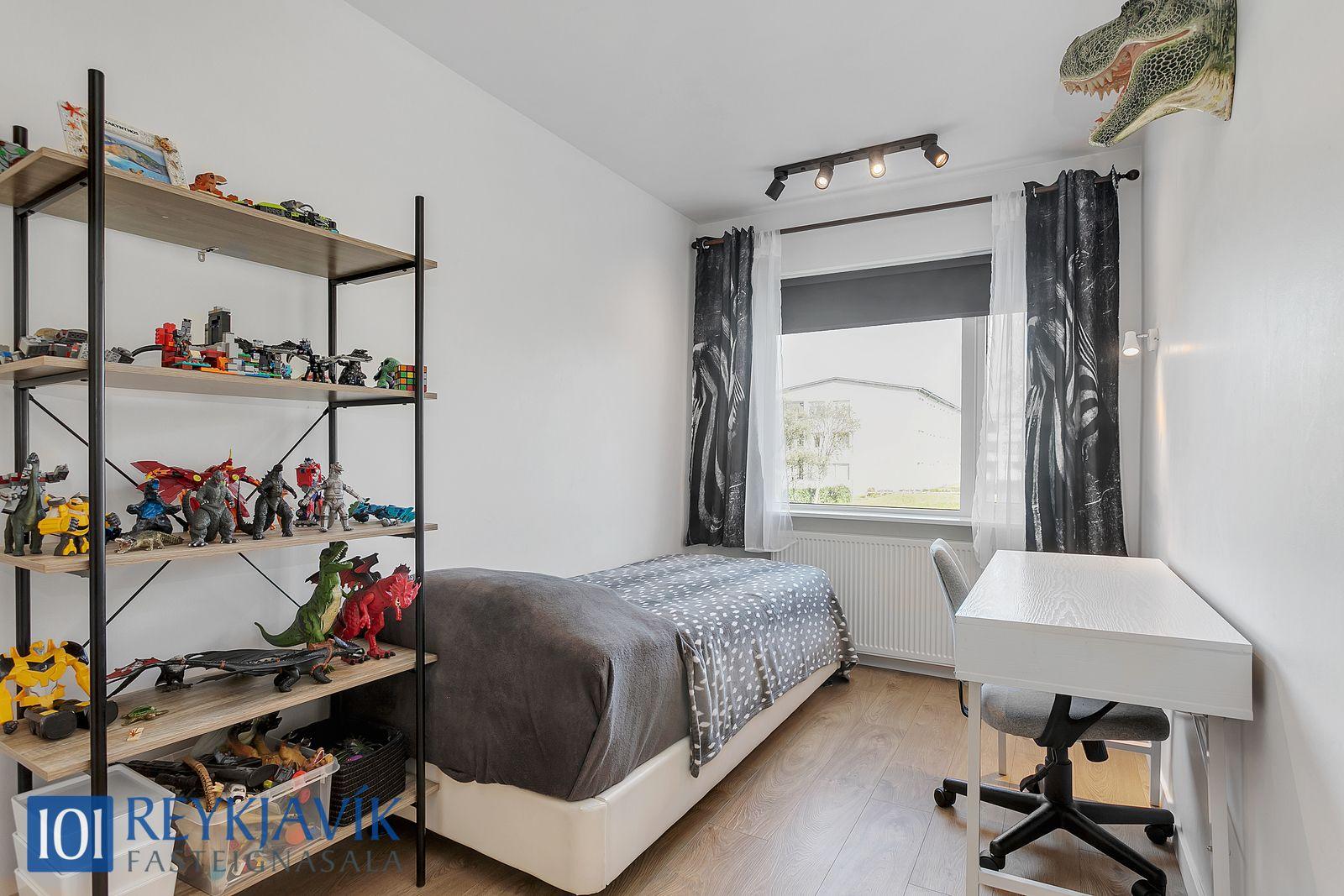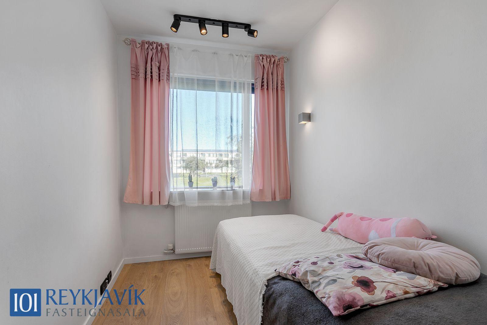 Herbergi snúa í norður að grænu sameiginlegu svæði bakatil við húseign. Einkar gott skápapláss er í innbyggðum skápum herbergja. Tvö parketlögð svefnherbergi hlið við hlið á gangi, bæði með innbyggðum skápum.