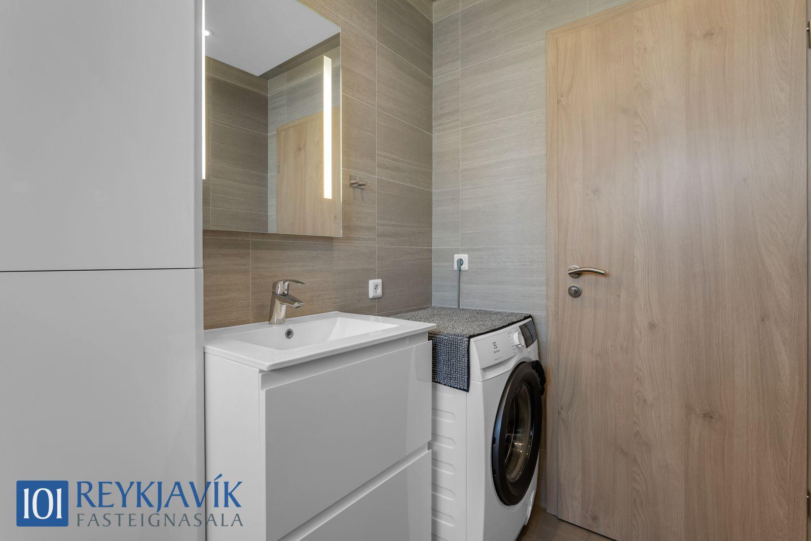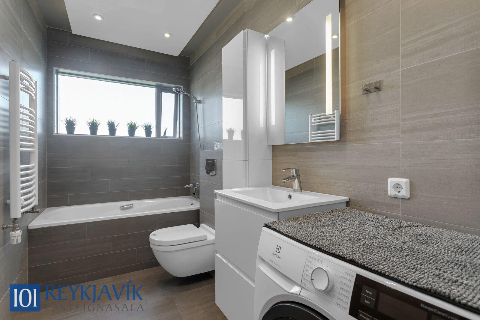Hiti í flísalögðu gólfi. Baðinnrétting hvítlökkuð og með skúffum og handlaug, rúmgóður baðskápur við hlið innréttingar, spegill með innbyggðri lýsingu fyrir ofan handlaug. Baðkar/sturta og handklæðaofn. Niðurtekið loft að hluta með
