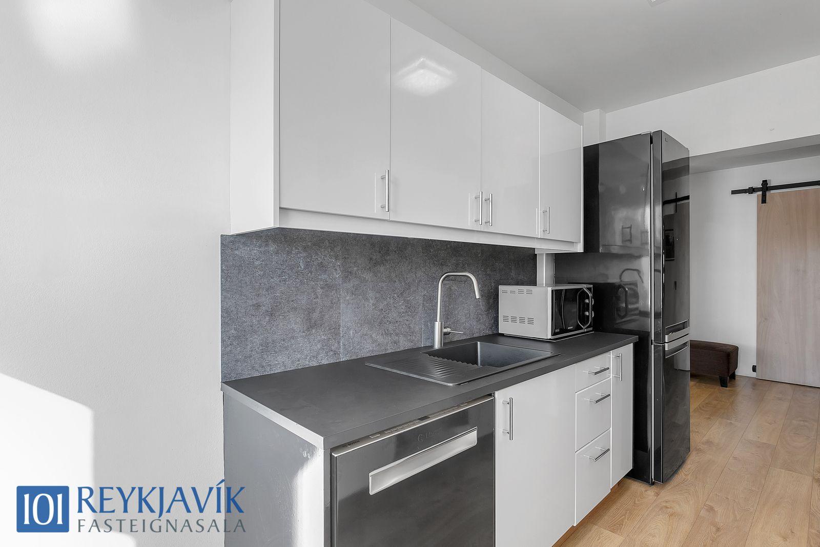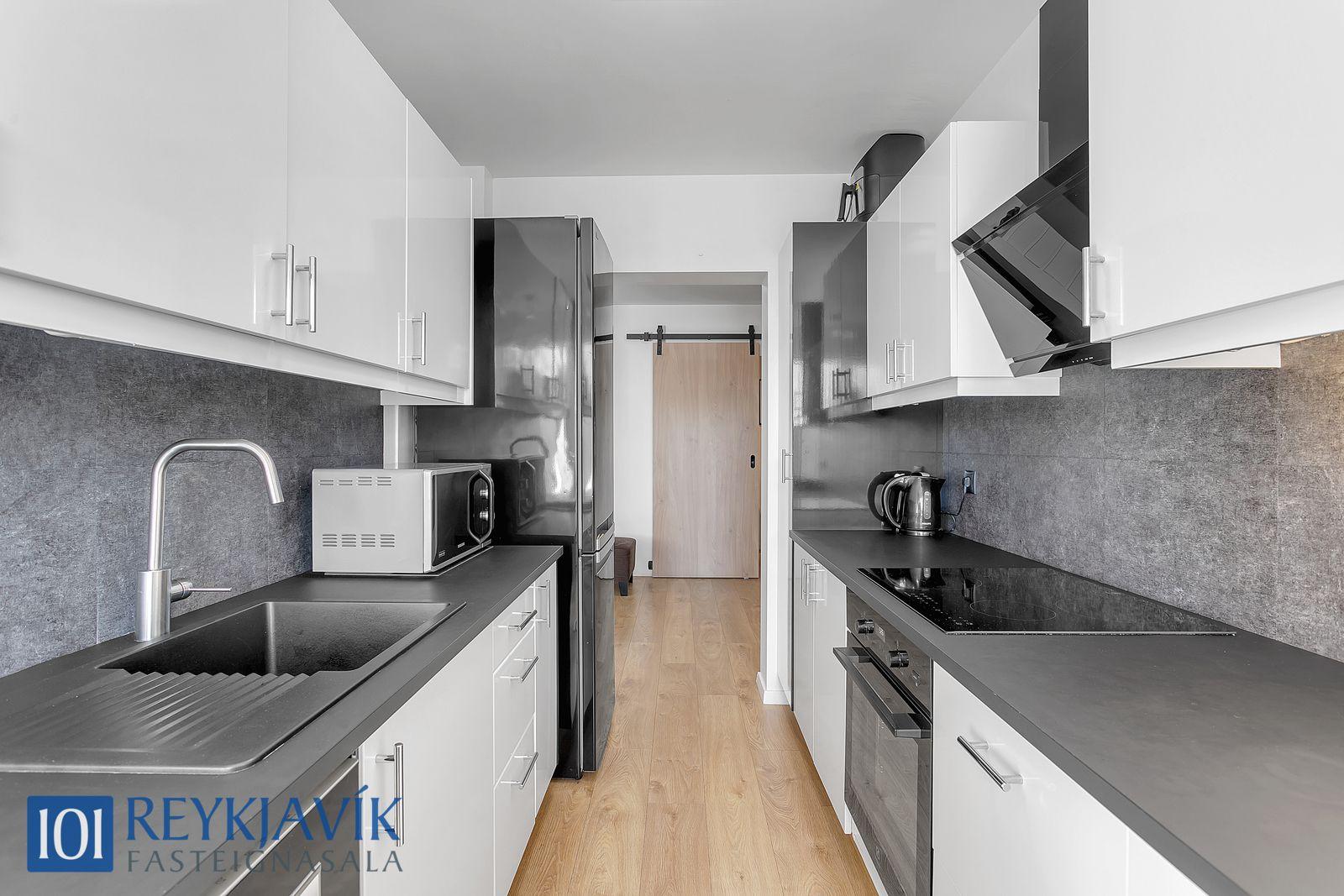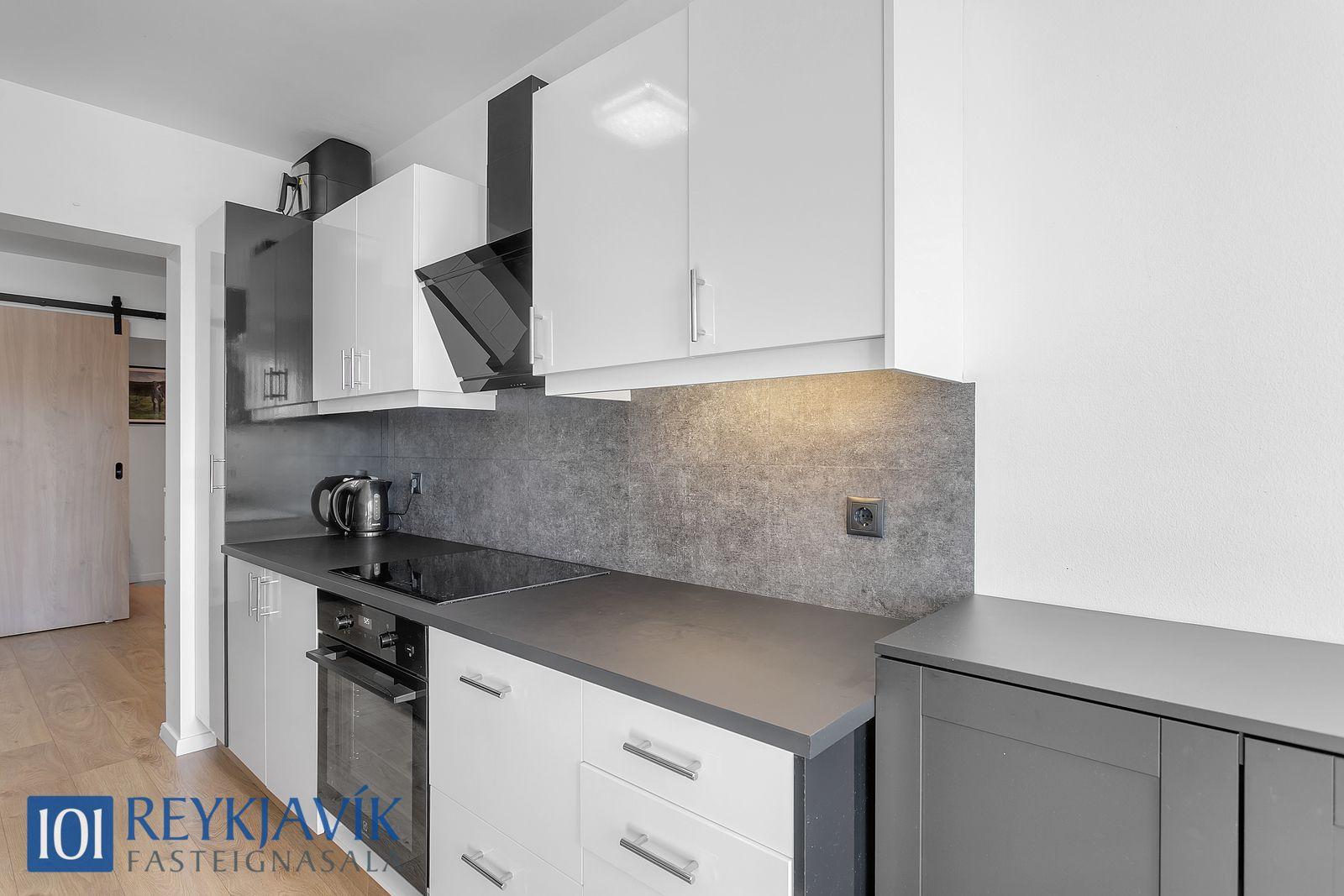 Eldhús er á vinstri hönd frá forstofu með útsýni að nærumhverfi til suðurs. Innrétting hefur verið yfirfarin, ytrabyrði sprautulakkað af fagfólki, ný borðplata og tæki.