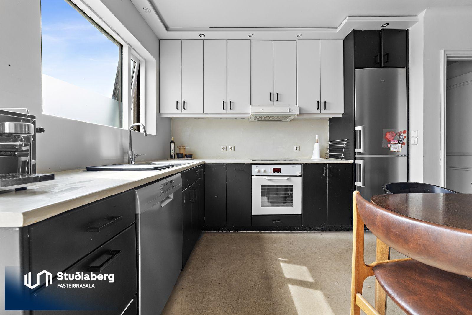 Eldhús / borðstofa: Rúmgott eldhús með steyptu gólfi, svört eldhúsinnrétting með ofn, helluborði og viftu, hvítir efri skápar.