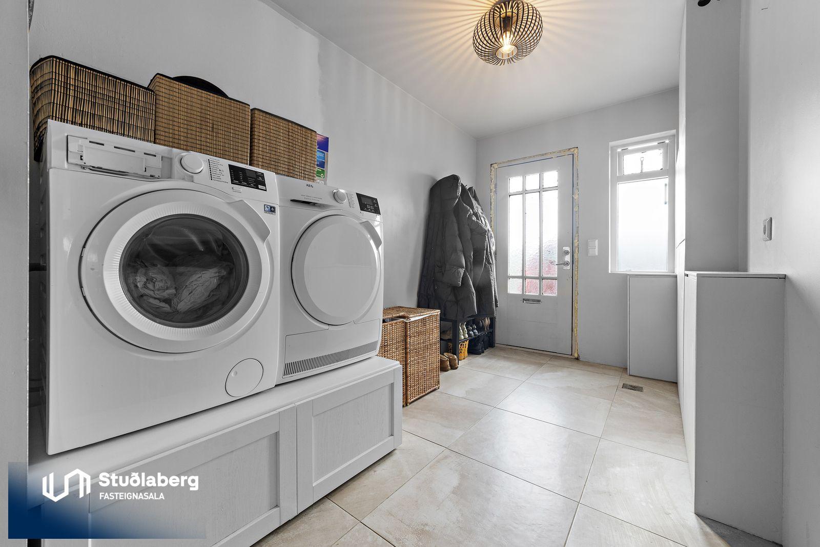 Forstofa/ þvottahús: hefur flísar á gólfi, góð innrétting fyrir þvottavél og þurrkara í vinnuhæð.