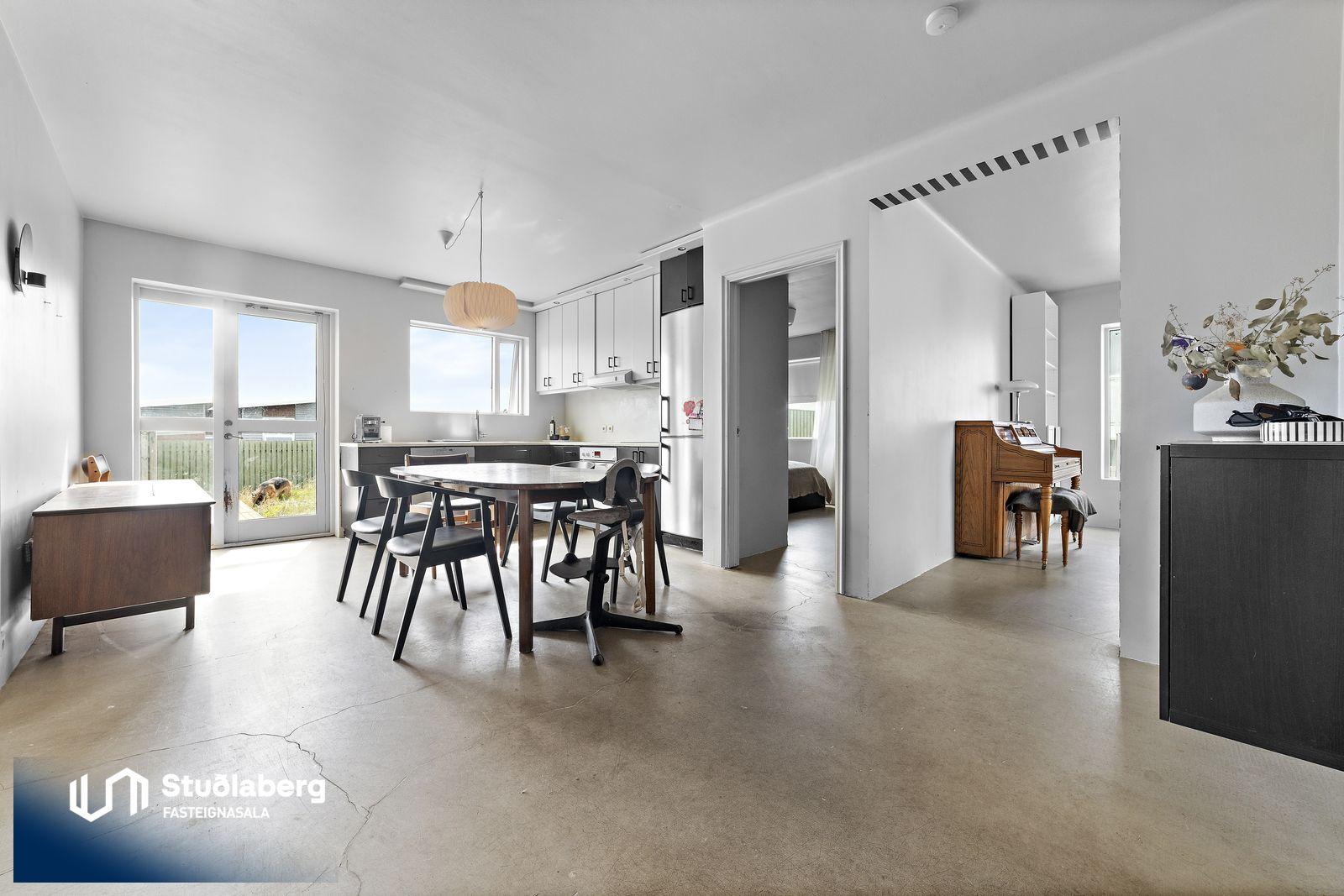 Eignin skiptist í: anddyri, tvö svefnherbergi, baðherbergi, stofu, borðstofu, eldhús og herbergi í bílskúrnum með salerni og sturtu.