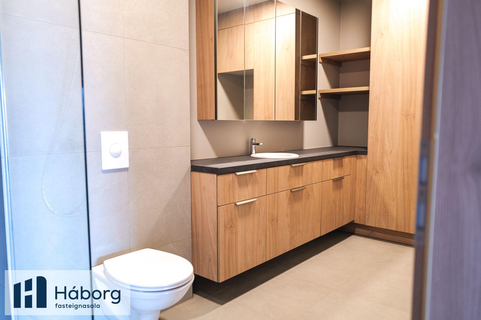 Baðherbergi, gólf er flísalagt og veggir að hluta. Vaskinnrétting er eikarlituð, speglaskápur með Led ljósum. Sturta, upphengt salerni, Grohe blöndunartæki. Þvottaaðstaða er á baðherbergi. Hiti er í gólfum á baðherbergi.