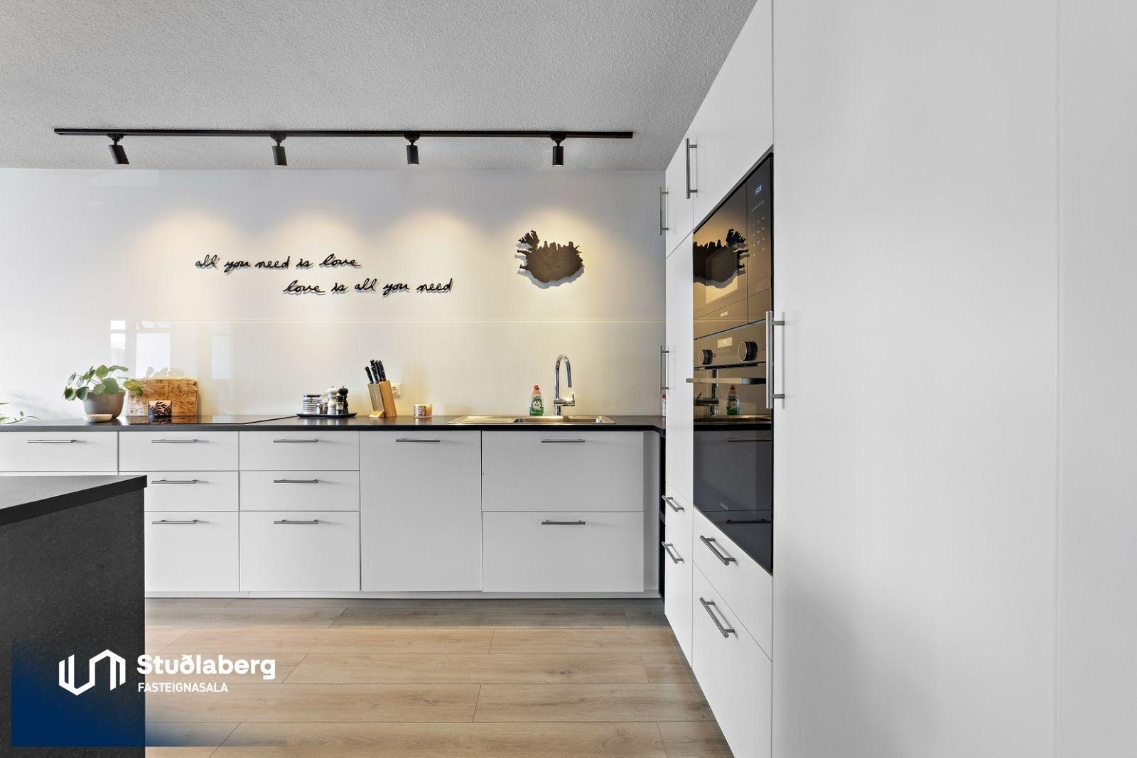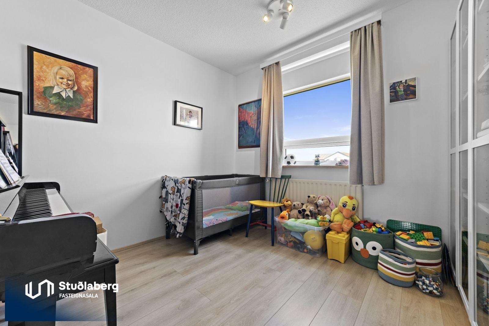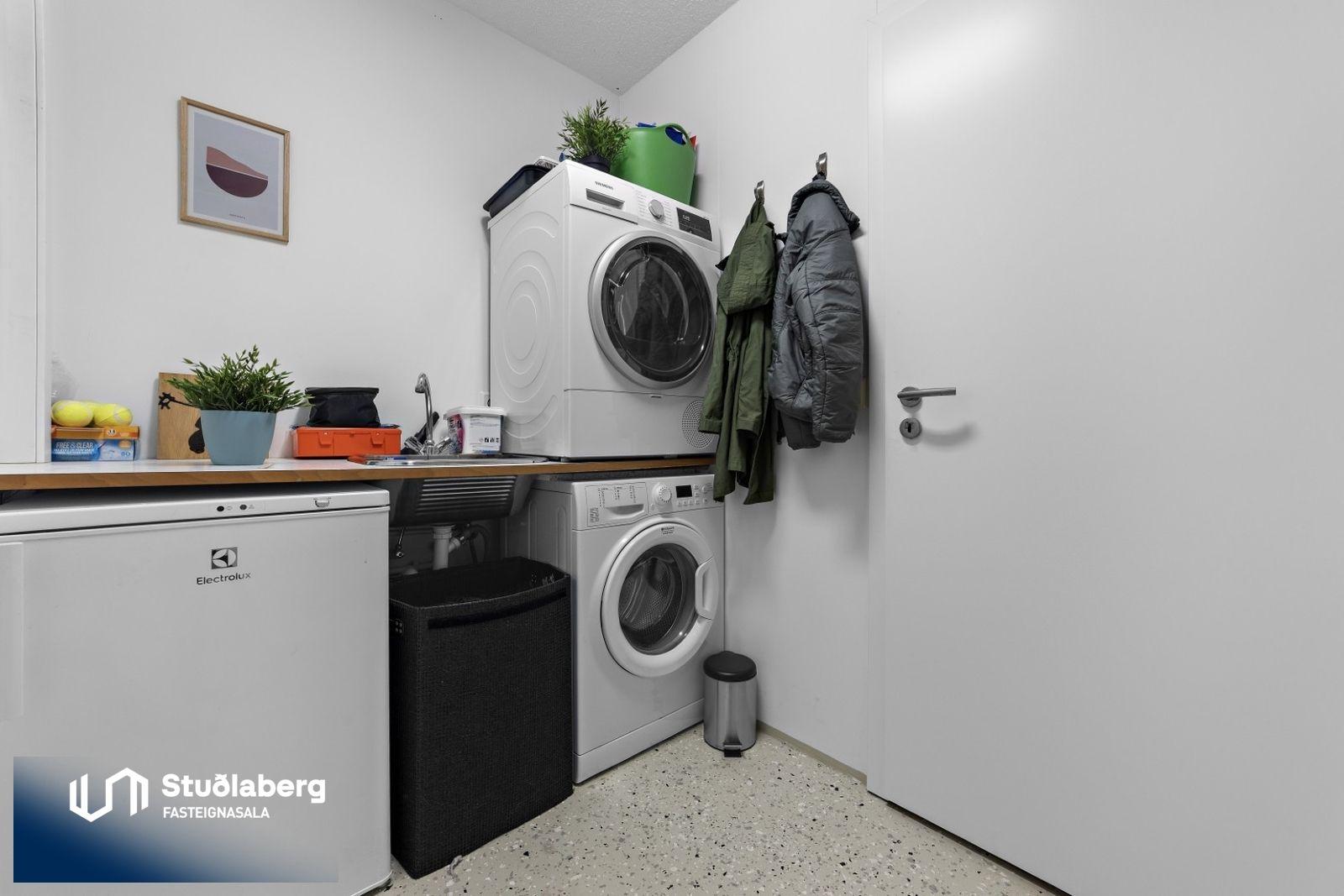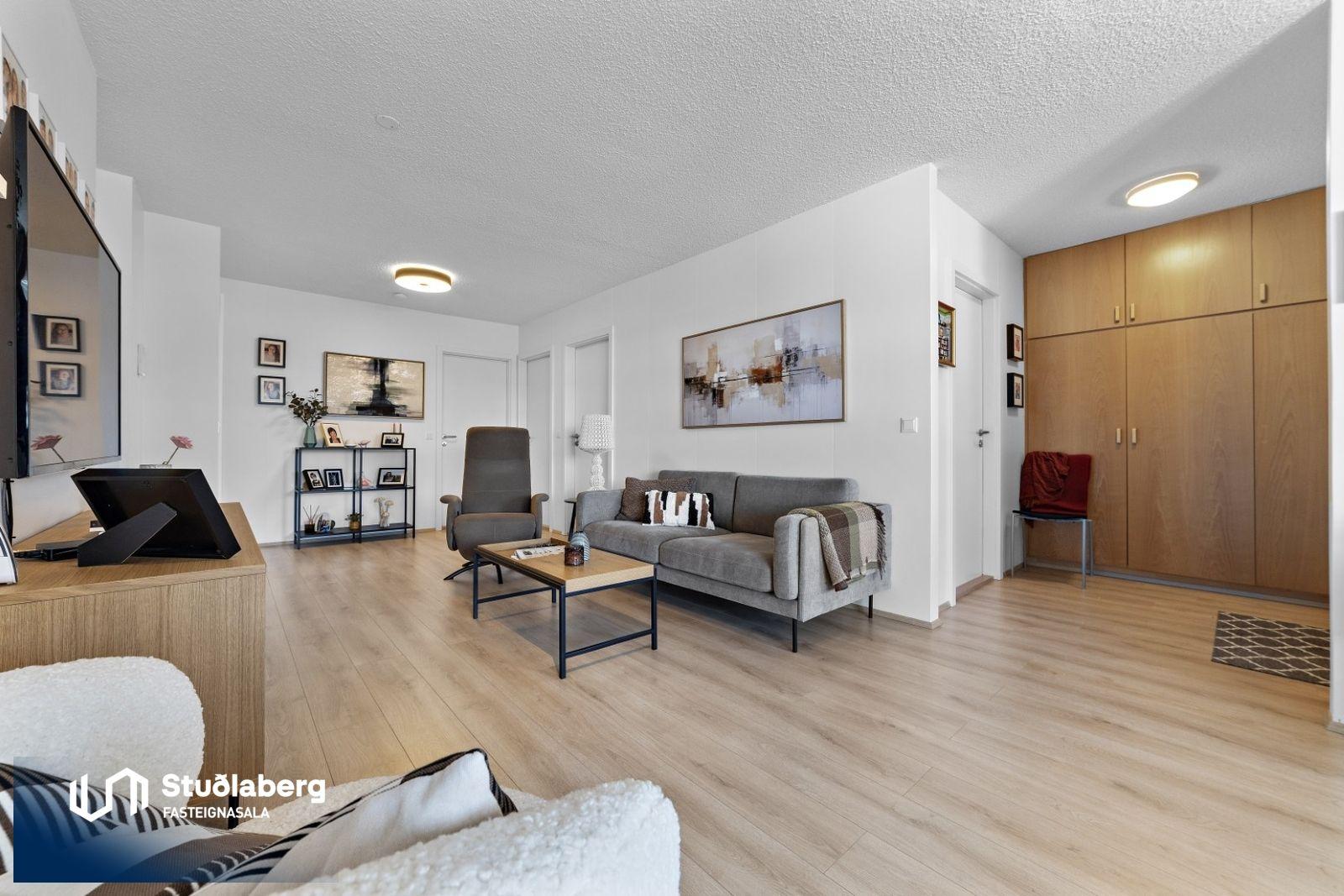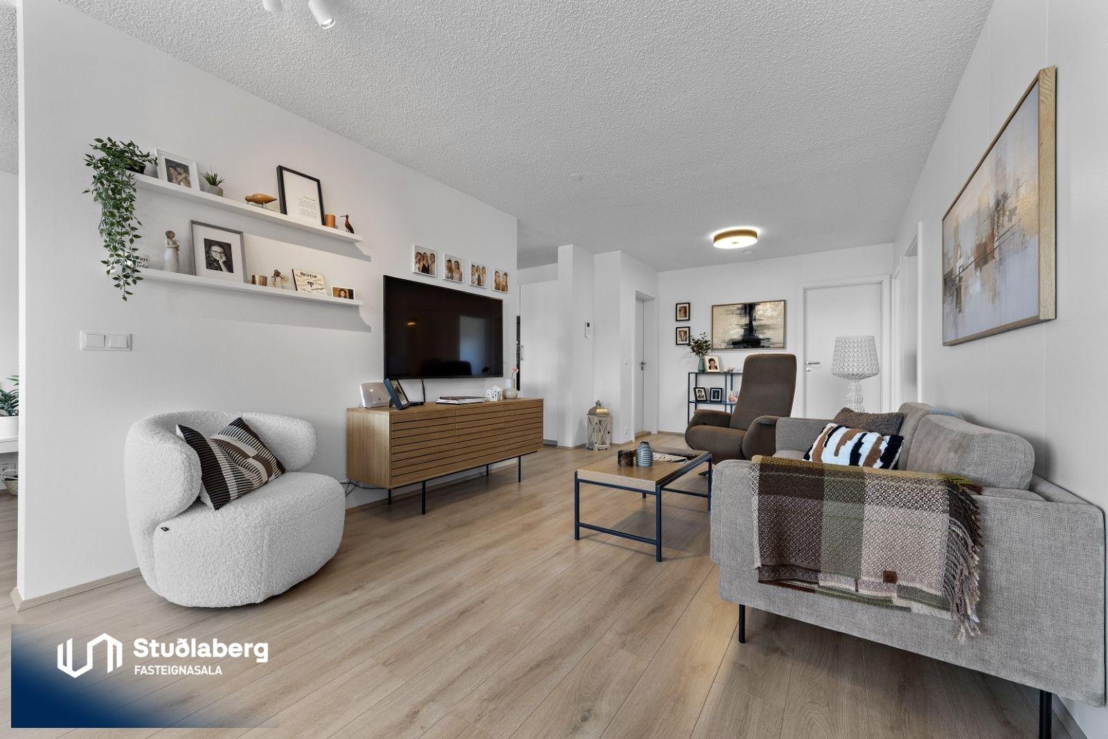 Forstofa er parketlögð og þar er góður skápur Þvottahús/geymsla er inn af forstofu, þar er málað gólf og hillur á vegg. Hol er parketlagt. Stofa er parketlögð og hurð er út á svalir frá stofu. Í eldhúsi er parket á gólfi, þar er góð hvít innrétting, ofn og helluborð. Opið er inn í eldhús bæði frá holi og stofu. Herbergin eru þrjú og eru þau öll parketlögð. Svalir eru út frá hjónaherbergi Á baðherbergi eru flísar bæði á gólfi og á veggjum, þar er beyki-innrétting og baðkar með sturtuaðstöðu.