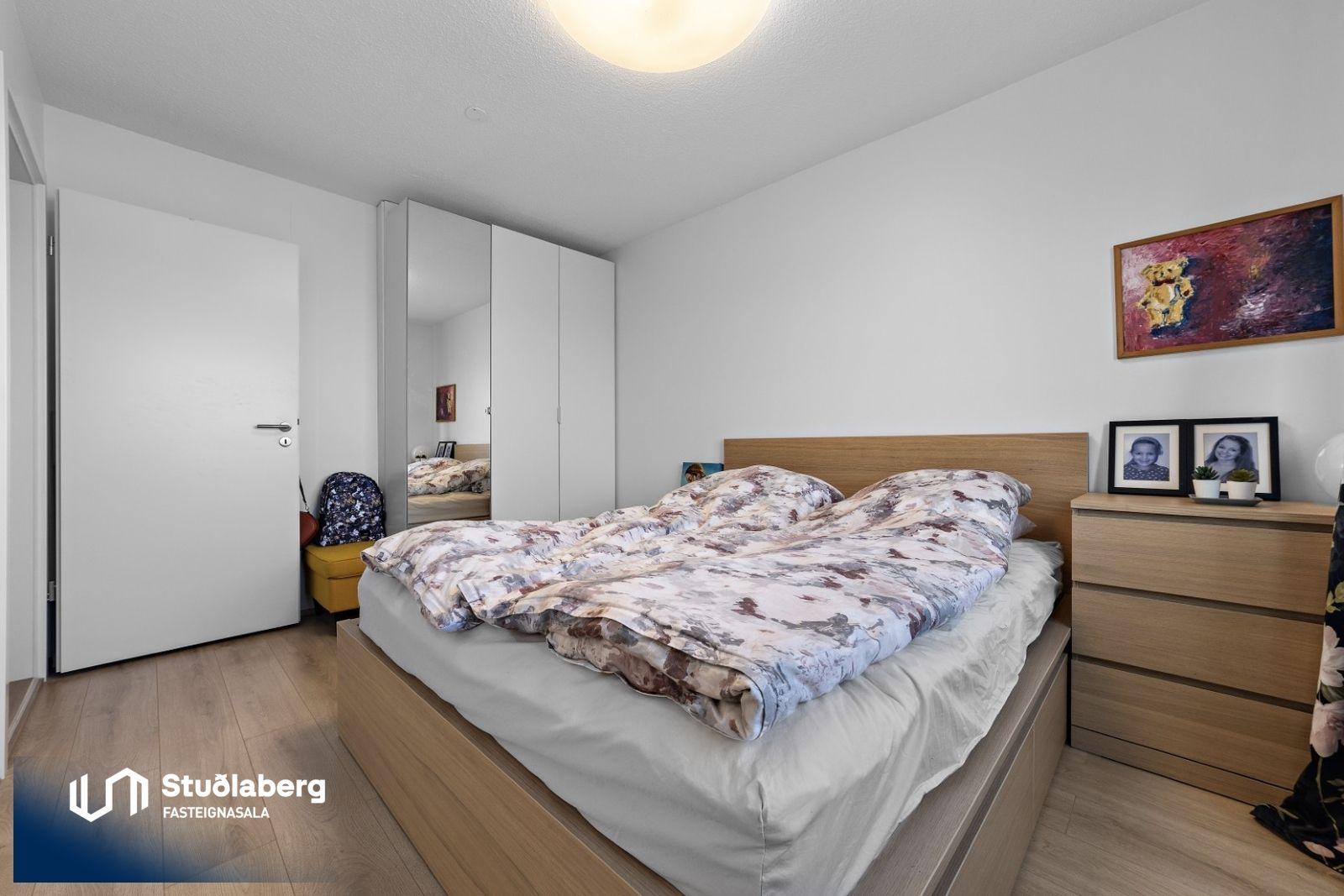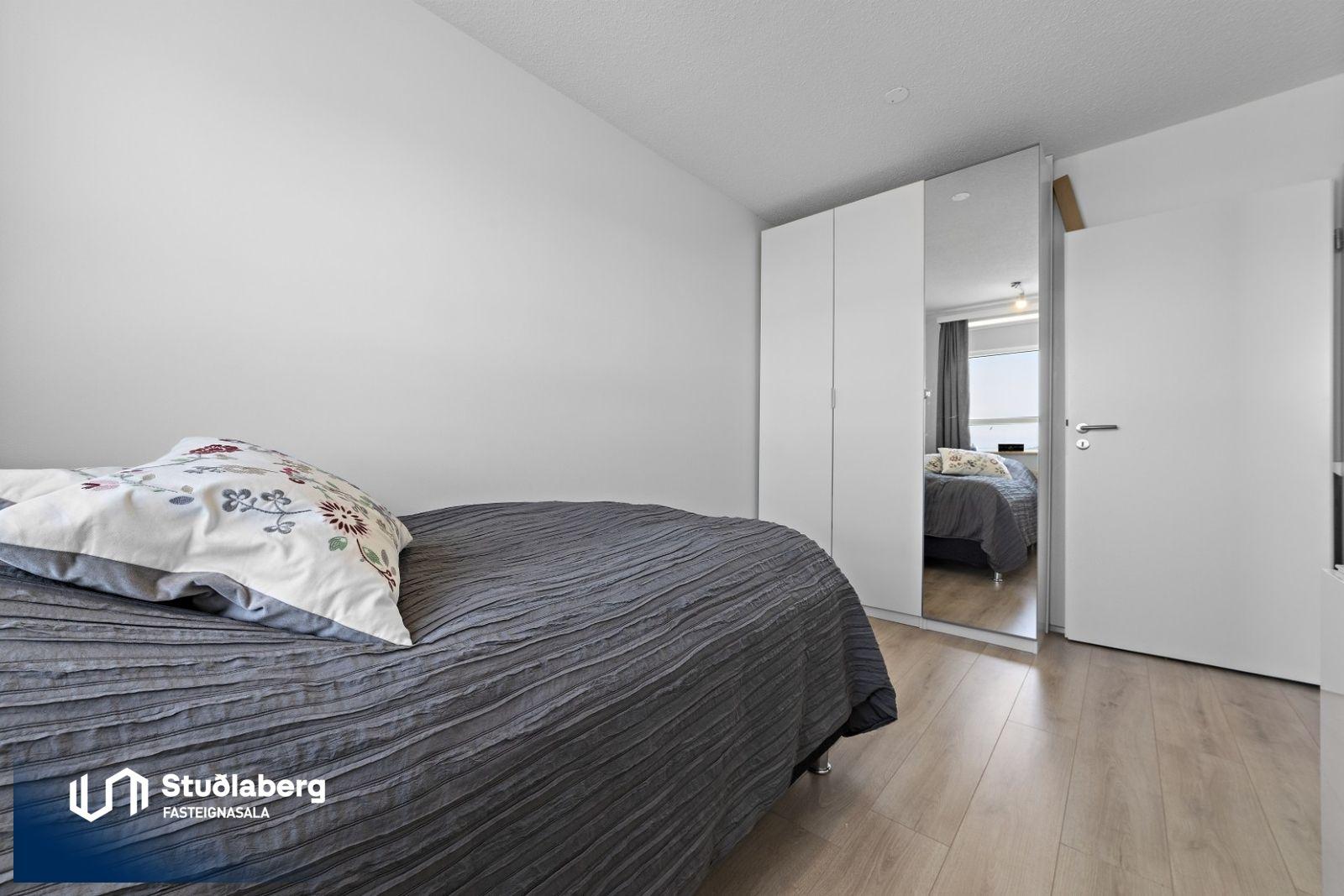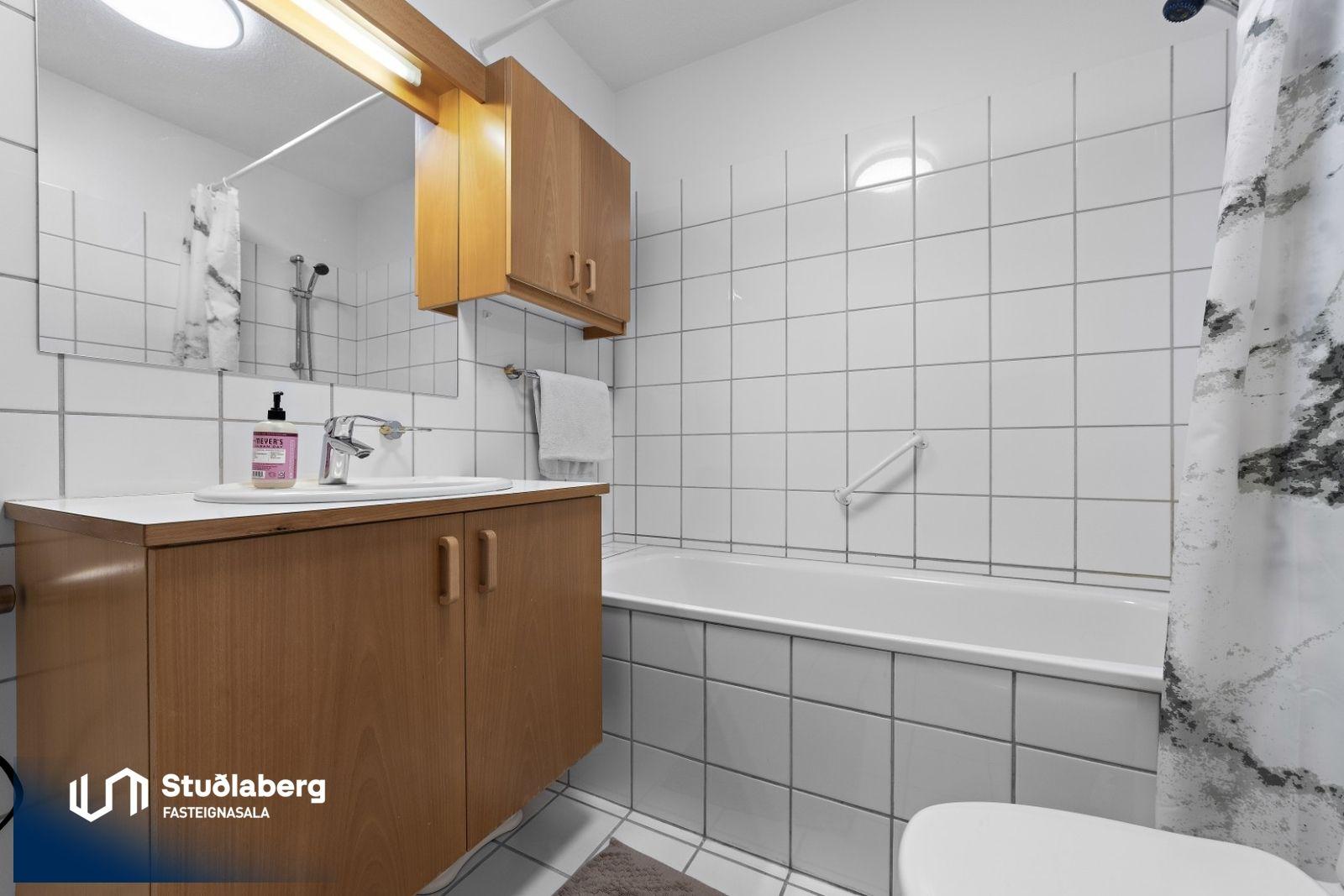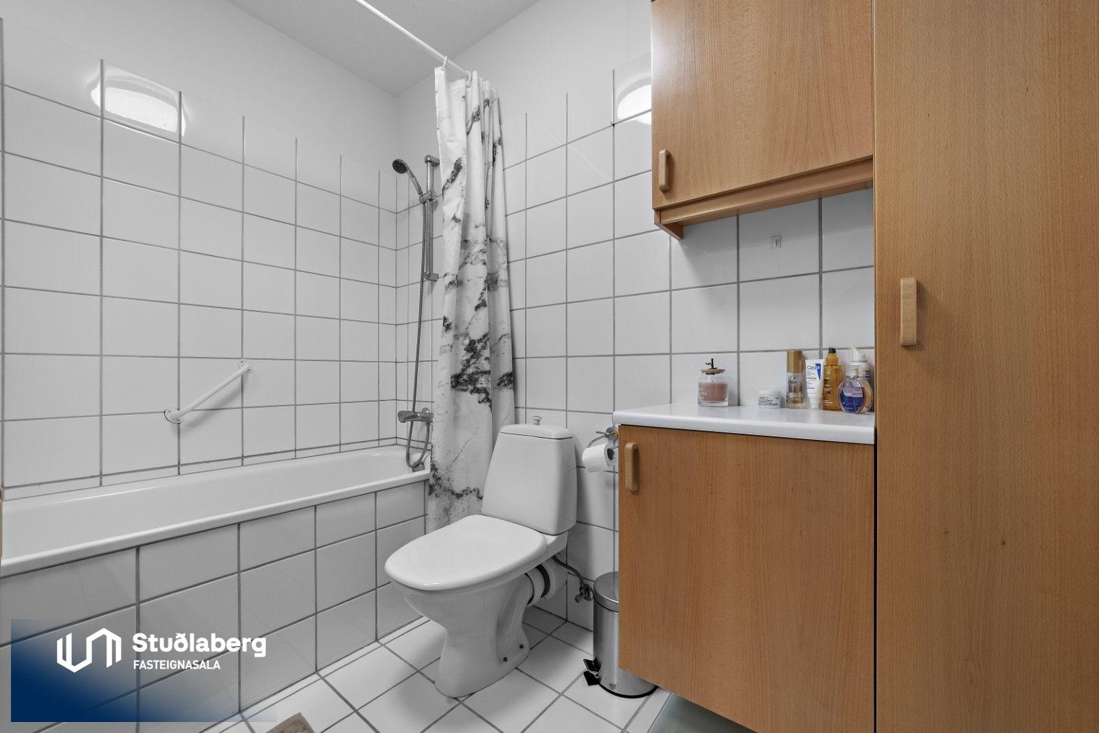 Forstofa er parketlögð og þar er góður skápur Þvottahús/geymsla er inn af forstofu, þar er málað gólf og hillur á vegg. Hol er parketlagt. Stofa er parketlögð og hurð er út á svalir frá stofu. Í eldhúsi er parket á gólfi, þar er góð hvít innrétting, ofn og helluborð. Opið er inn í eldhús bæði frá holi og stofu. Herbergin eru þrjú og eru þau öll parketlögð. Svalir eru út frá hjónaherbergi Á baðherbergi eru flísar bæði á gólfi og á veggjum, þar er beyki-innrétting og baðkar með sturtuaðstöðu.