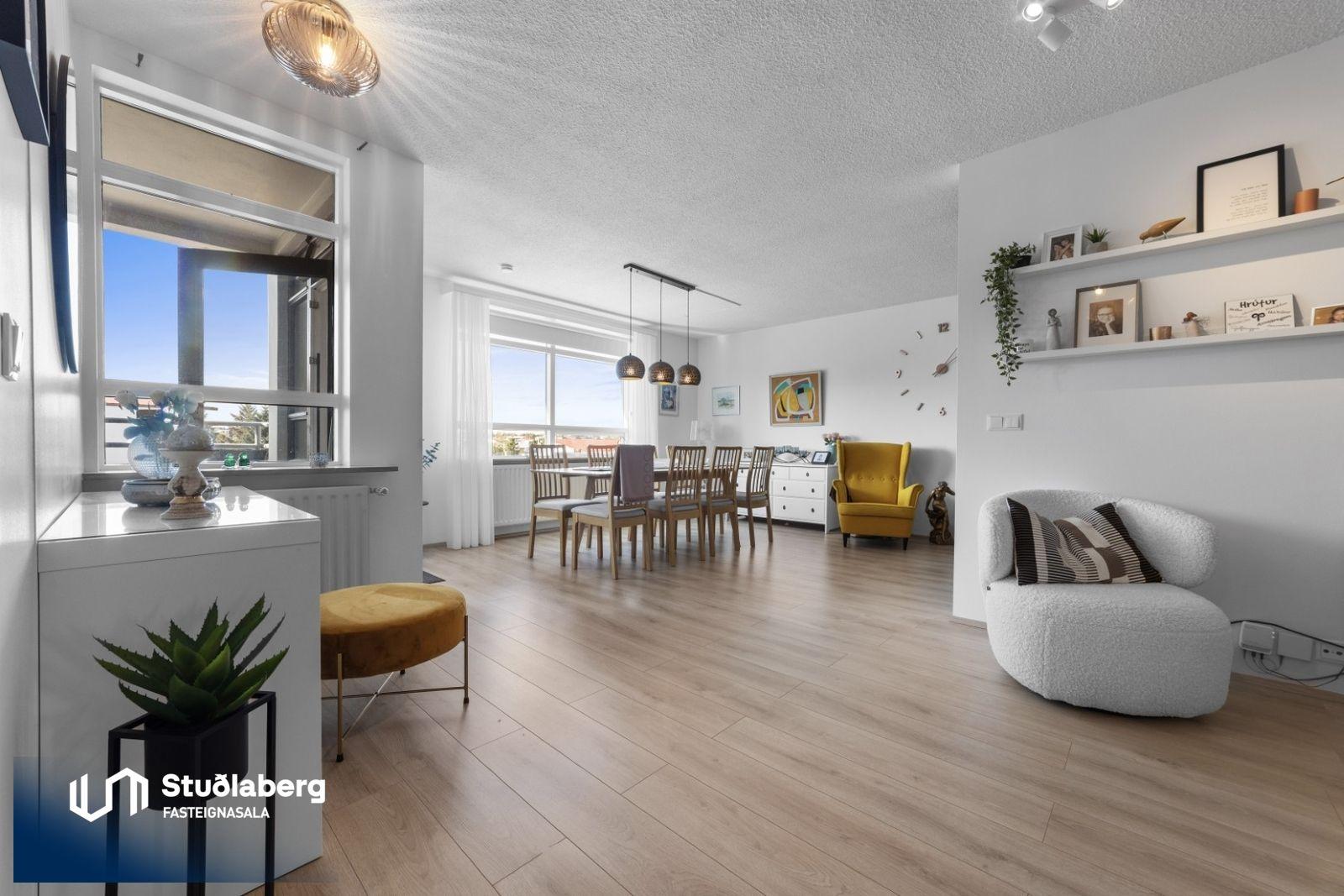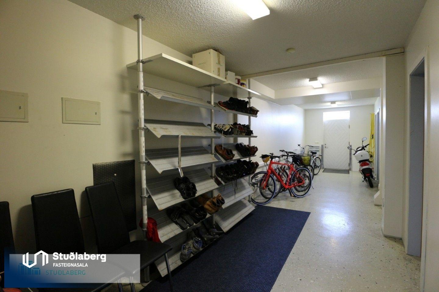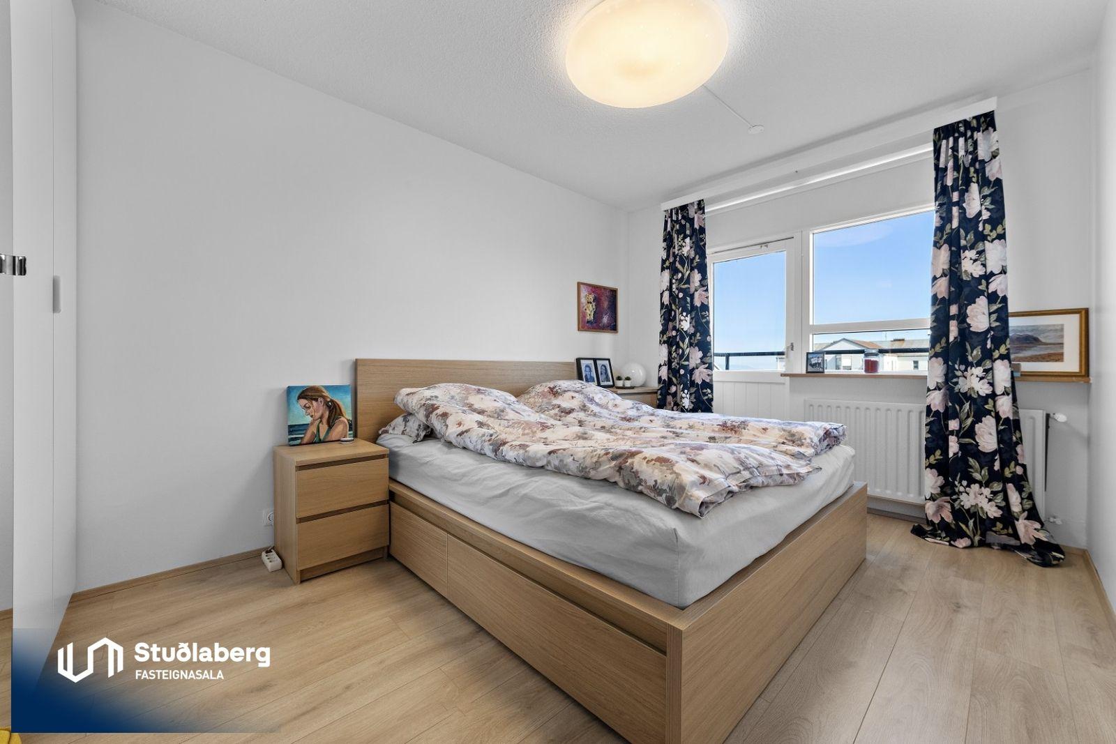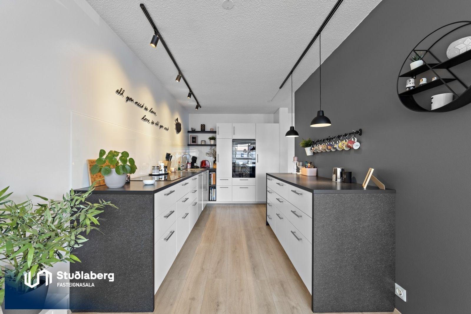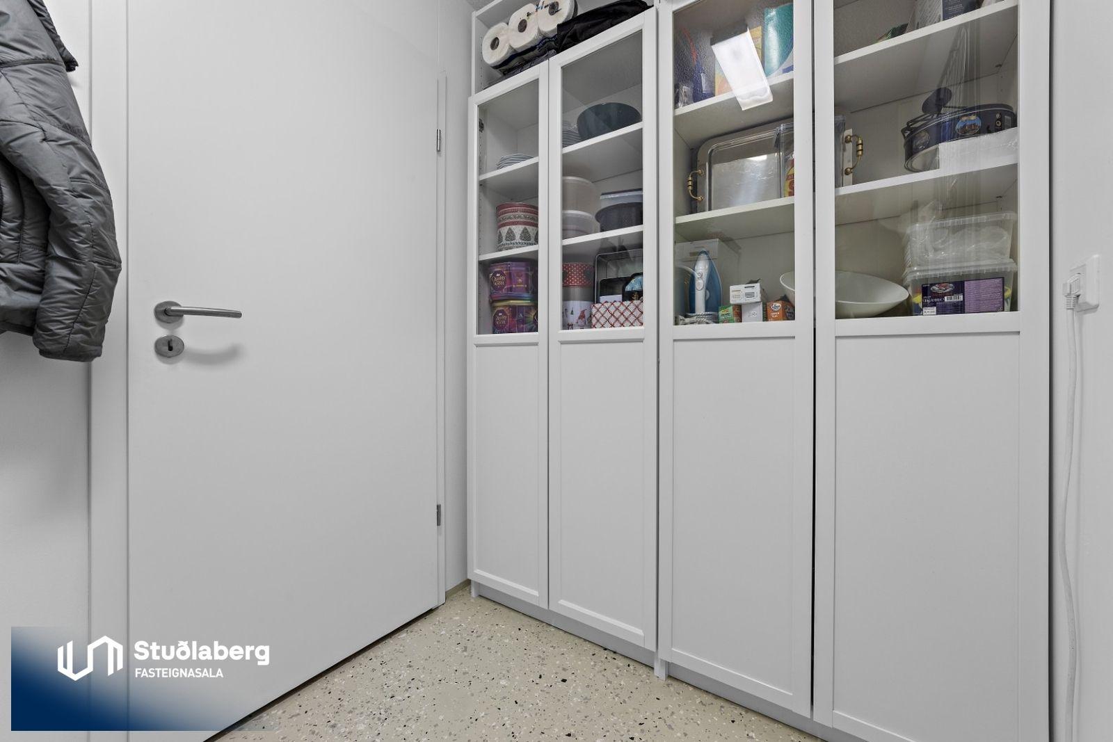 Forstofa er parketlögð og þar er góður skápur Þvottahús/geymsla er inn af forstofu, þar er málað gólf og hillur á vegg. Hol er parketlagt. Stofa er parketlögð og hurð er út á svalir frá stofu. Í eldhúsi er parket á gólfi, þar er góð hvít innrétting, ofn og helluborð. Opið er inn í eldhús bæði frá holi og stofu. Herbergin eru þrjú og eru þau öll parketlögð. Svalir eru út frá hjónaherbergi Á baðherbergi eru flísar bæði á gólfi og á veggjum, þar er beyki-innrétting og baðkar með sturtuaðstöðu.