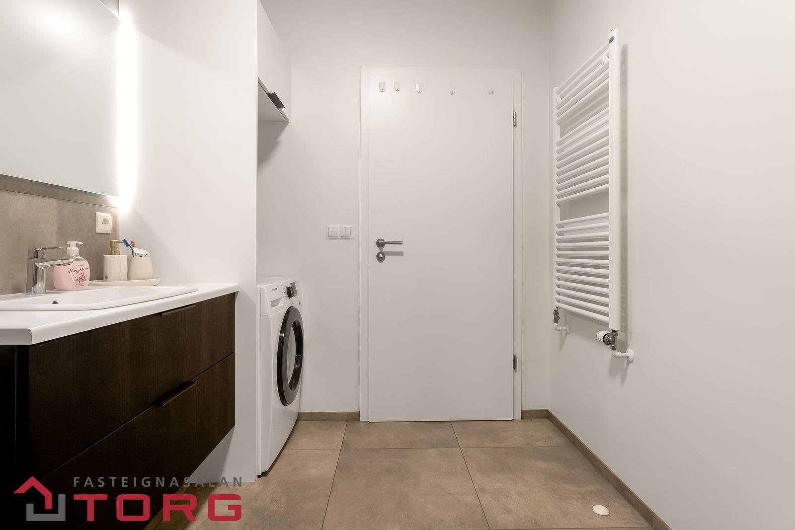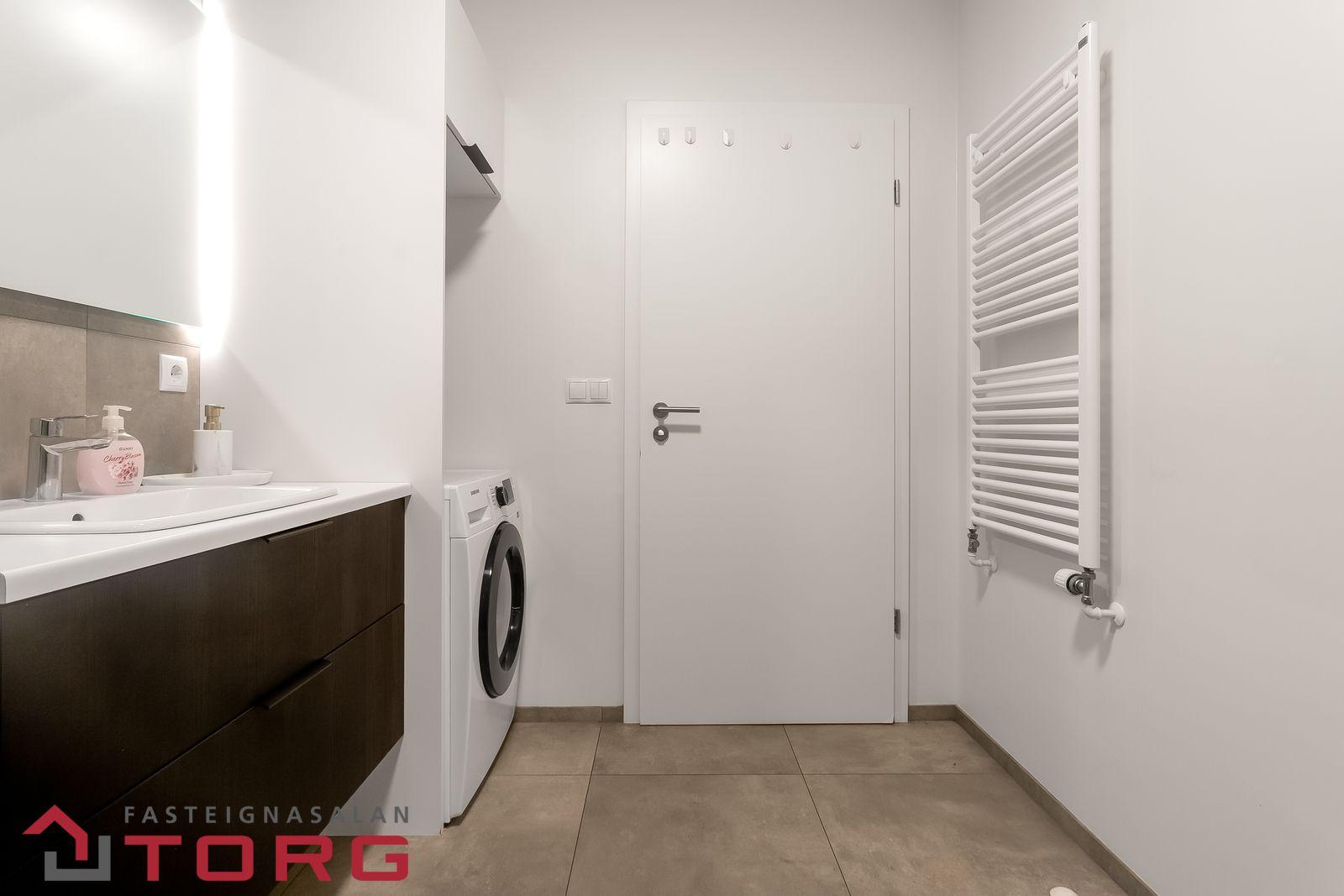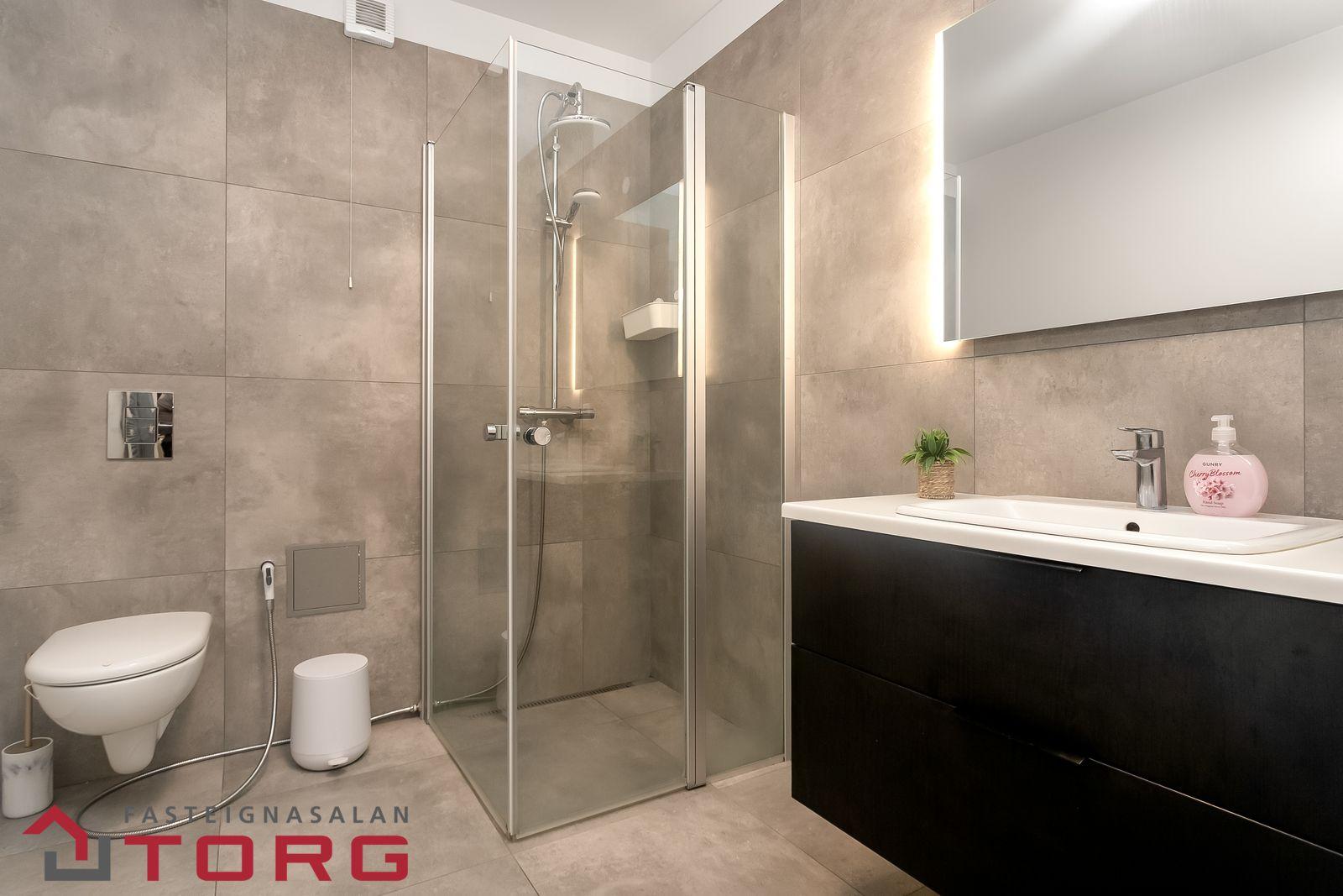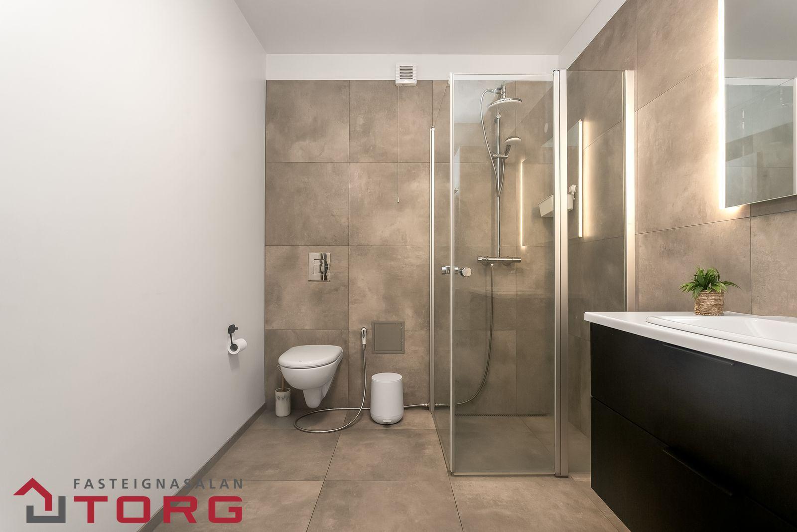Baðherbergi er með dökkri innéttingu og efri speglaskáp, sturtu, upphengdu salerni, handklæðaofn og tengi fyrir þvottavél og þurrkara.