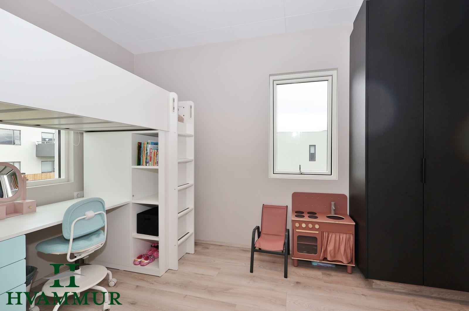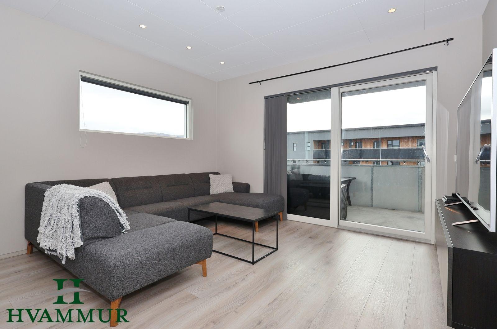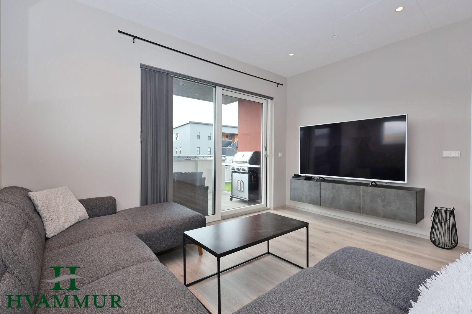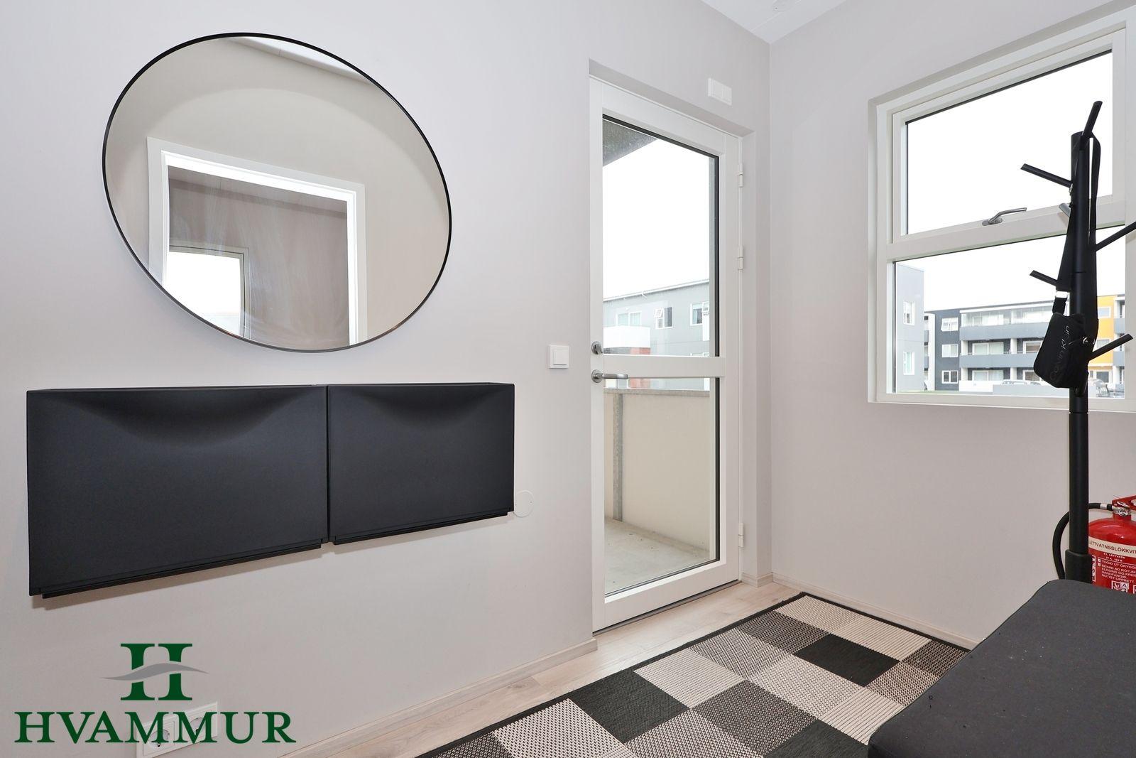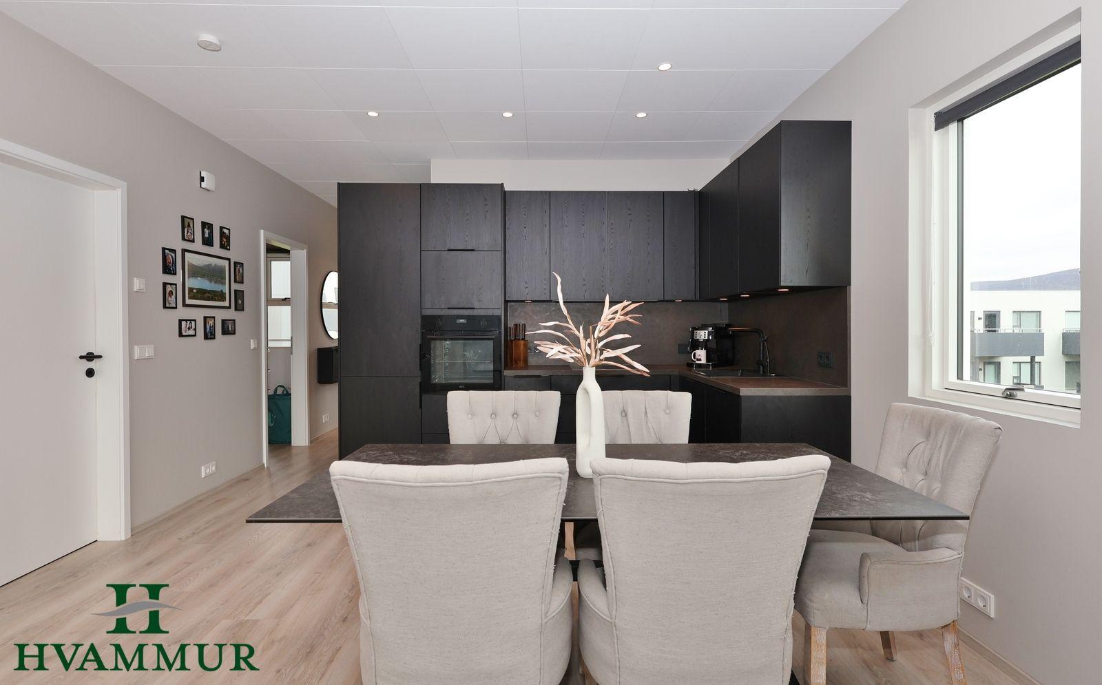 Forstofa er með harðparketi á gólfi og tvöföldum fataskáp. Eldhús, vönduð L-laga svört plastlögð innrétting (Nero oak) með grárri borðplötu og svörtum vask. Mjúklokun er á skúffum og skápum. Uppþvottavél og ísskápur með frysti eru innbyggð í innréttingu og fylgja með við sölu eignar. Stofa og eldhús eru í opnu rými með ljósu harðparketi á gólfi og gluggum til tveggja átta. Úr stofu er rennihurð út á steypta suður verönd, skráð 9,0 m² að stærð. Veröndin er með galvinseruðu járn handriði og klætt með plast plötum. Baðherbergi, vönduð svört plastlögð innrétting með grárri borðplötu og speglaskápur fyrir ofan. Stæði er í innréttingu fyrir þvottavél og þurrkara í vinnuhæð. Upphengt wc og walk-in sturta. Gráar flísar eru á gólfi og hluta veggja. Svefnherbergin eru tvö, bæði með harðparketi á gólfi og fataskápum. Stærð herbergja er skv. teikningum 9,1 og 11,8 m². Geymsla innan íbúðar er skv. teikningum 8,3 m² að stærð og er notuð sem þriðja svefnherbergið í dag, þar er harðparket á gólfi og fataskápur. Í sameigninni á jarðhæðinni er sér geymsla, skráð 4,9 m² að stærð og sameiginleg hjóla- og vagnageymsla. Epoxy efni er á gólfi. Annað - Innréttingar og skápar er plastlagðar, Nero oak og eru frá www.gks.is - Gólfefni, ljóst harðparket er á öllum rýmum að baðherbergi undanskildu þar eru gráar flísar. - Innihurðar eru yfirfelldar hvítar. - Hljóðdempandi plötur í öllum loftum nema á baðherbergi. - Innfelld led-lýsing í loftum. - Stéttar við aðalinngang eru steyptar og með hitalögnum í. - Húsið er steypt og einangrað að utan og klætt með gráu báruðu stáli og timbri við innganga.