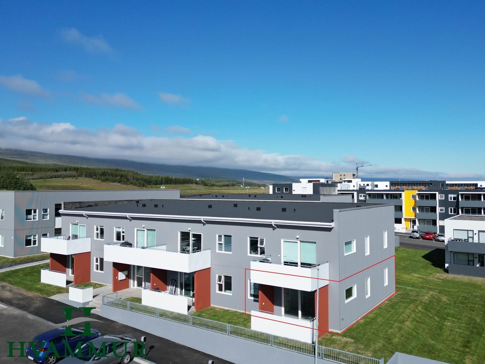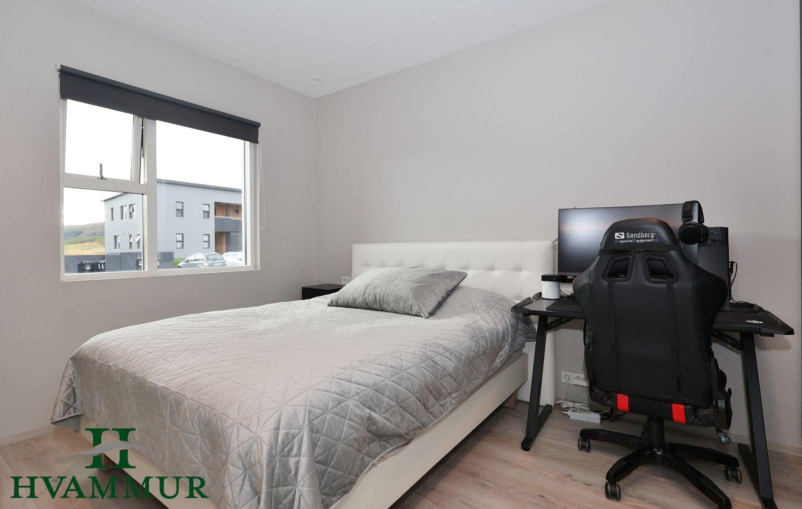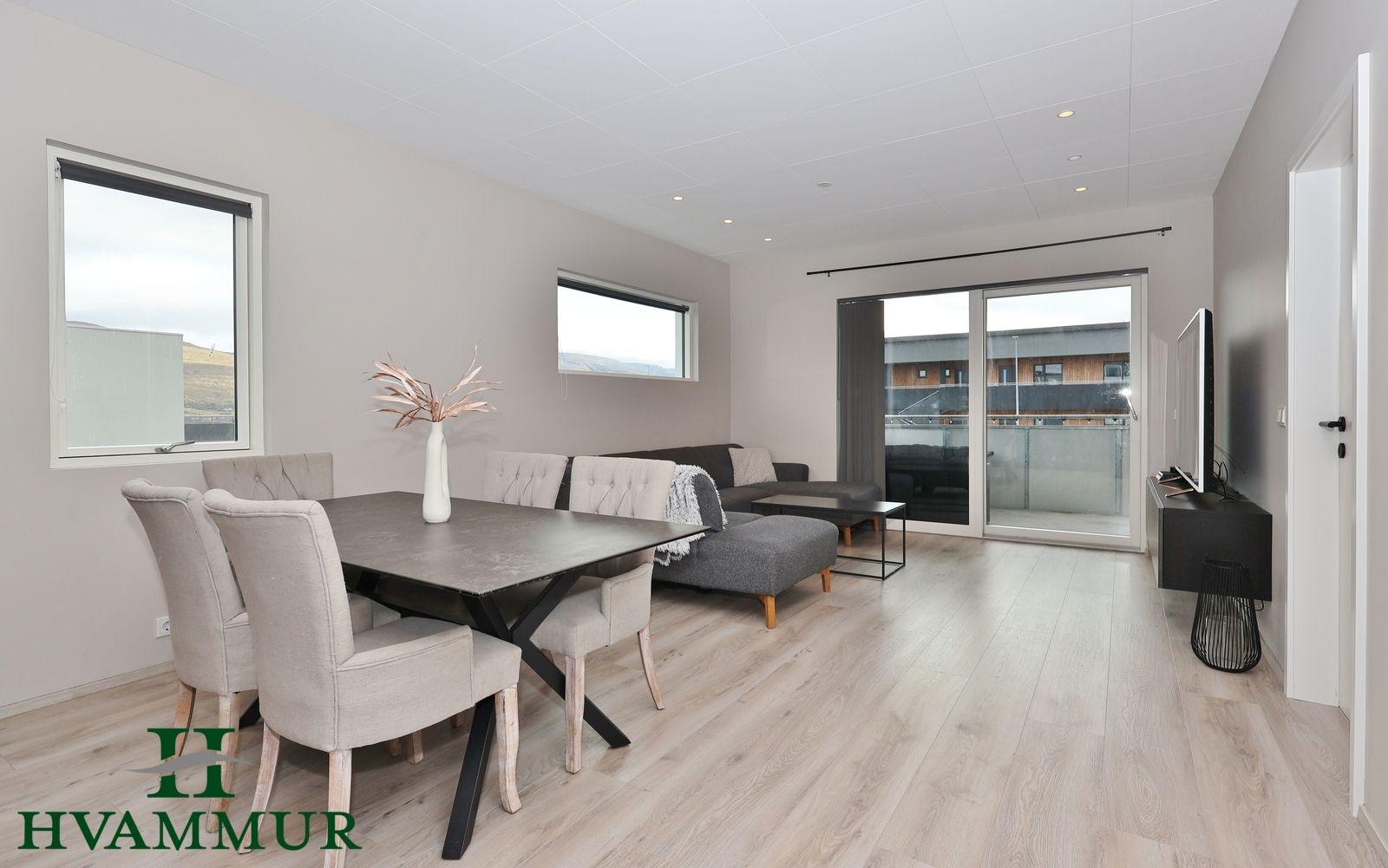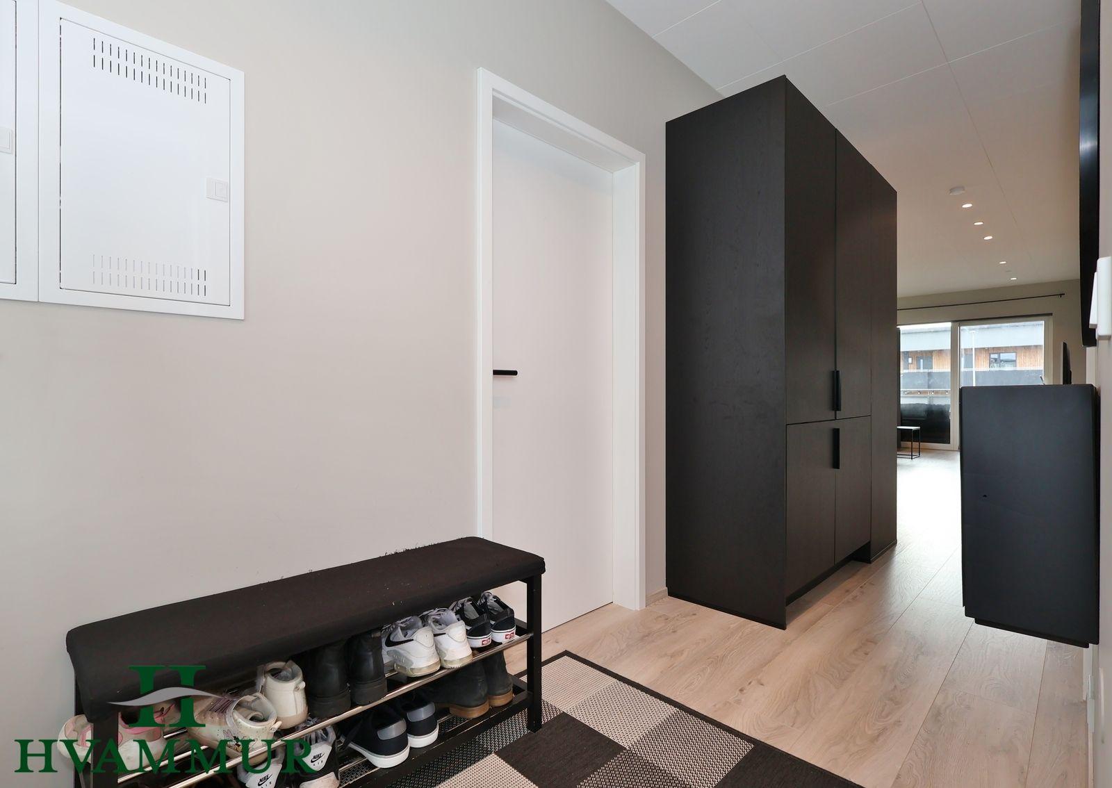 Forstofa er með harðparketi á gólfi og tvöföldum fataskáp. Eldhús, vönduð L-laga svört plastlögð innrétting (Nero oak) með grárri borðplötu og svörtum vask. Mjúklokun er á skúffum og skápum. Uppþvottavél og ísskápur með frysti eru innbyggð í innréttingu og fylgja með við sölu eignar. Stofa og eldhús eru í opnu rými með ljósu harðparketi á gólfi og gluggum til tveggja átta. Úr stofu er rennihurð út á steypta suður verönd, skráð 9,0 m² að stærð. Veröndin er með galvinseruðu járn handriði og klætt með plast plötum. Baðherbergi, vönduð svört plastlögð innrétting með grárri borðplötu og speglaskápur fyrir ofan. Stæði er í innréttingu fyrir þvottavél og þurrkara í vinnuhæð. Upphengt wc og walk-in sturta. Gráar flísar eru á gólfi og hluta veggja. Svefnherbergin eru tvö, bæði með harðparketi á gólfi og fataskápum. Stærð herbergja er skv. teikningum 9,1 og 11,8 m². Geymsla innan íbúðar er skv. teikningum 8,3 m² að stærð og er notuð sem þriðja svefnherbergið í dag, þar er harðparket á gólfi og fataskápur. Í sameigninni á jarðhæðinni er sér geymsla, skráð 4,9 m² að stærð og sameiginleg hjóla- og vagnageymsla. Epoxy efni er á gólfi. Annað - Innréttingar og skápar er plastlagðar, Nero oak og eru frá www.gks.is - Gólfefni, ljóst harðparket er á öllum rýmum að baðherbergi undanskildu þar eru gráar flísar. - Innihurðar eru yfirfelldar hvítar. - Hljóðdempandi plötur í öllum loftum nema á baðherbergi. - Innfelld led-lýsing í loftum. - Stéttar við aðalinngang eru steyptar og með hitalögnum í. - Húsið er steypt og einangrað að utan og klætt með gráu báruðu stáli og timbri við innganga.