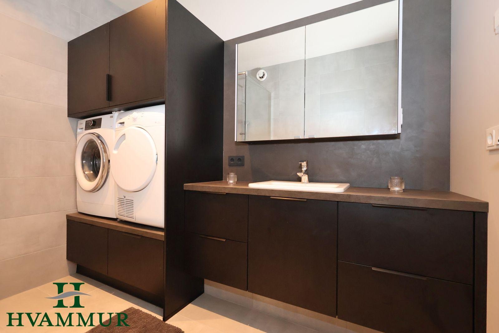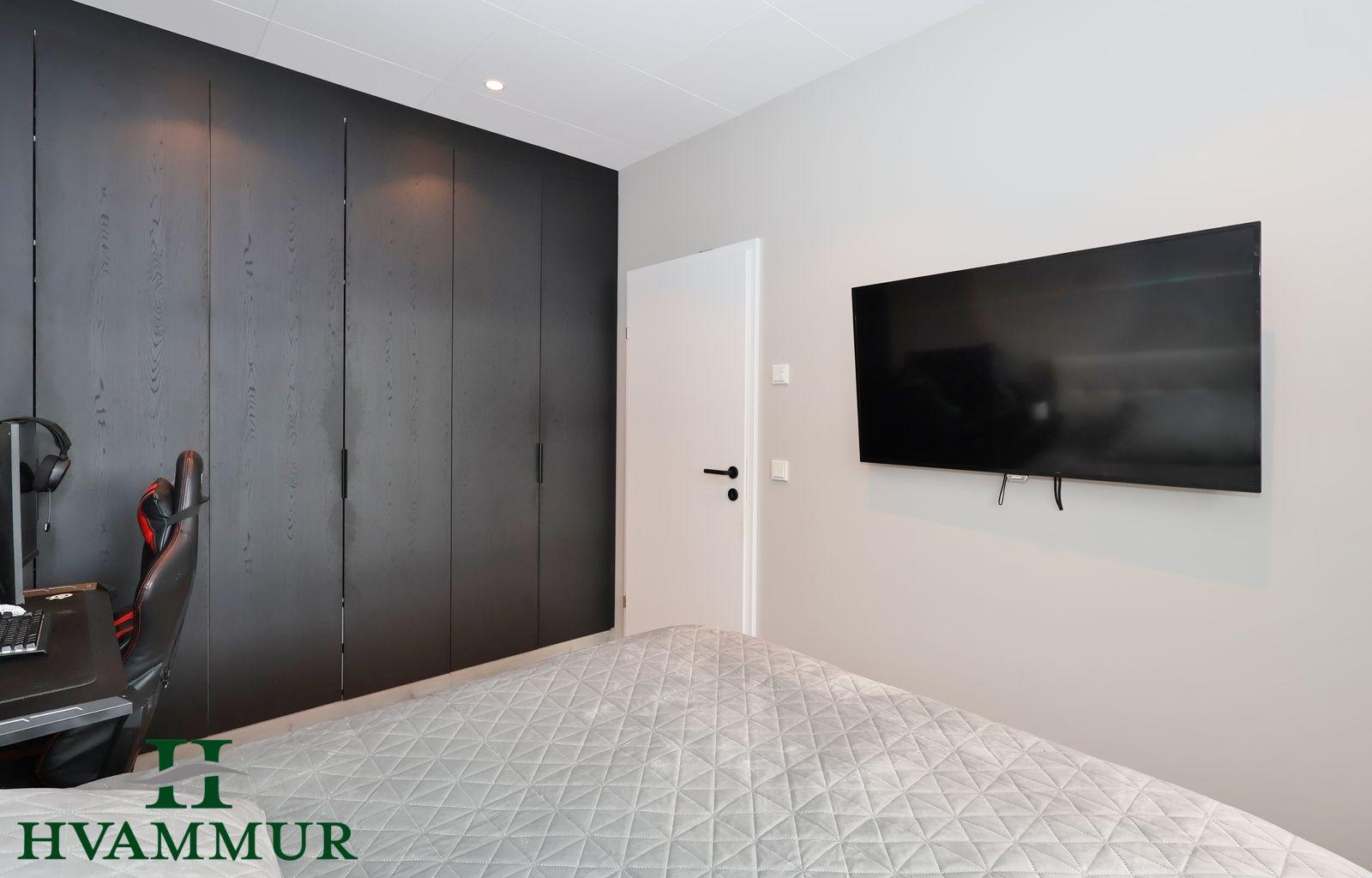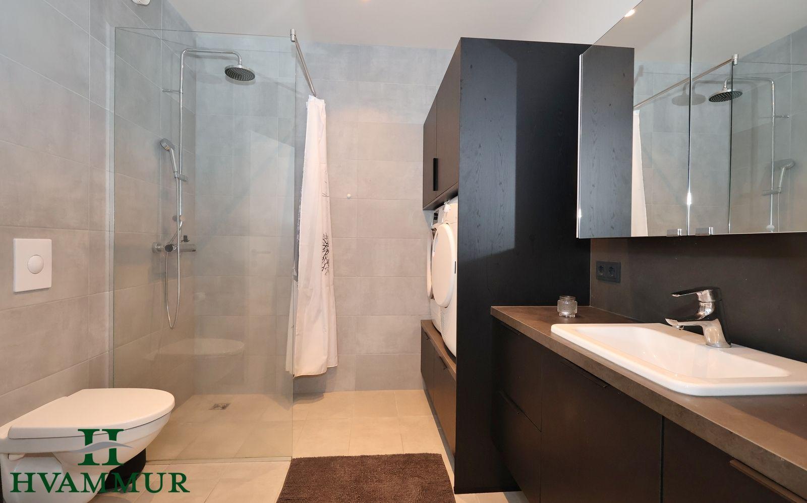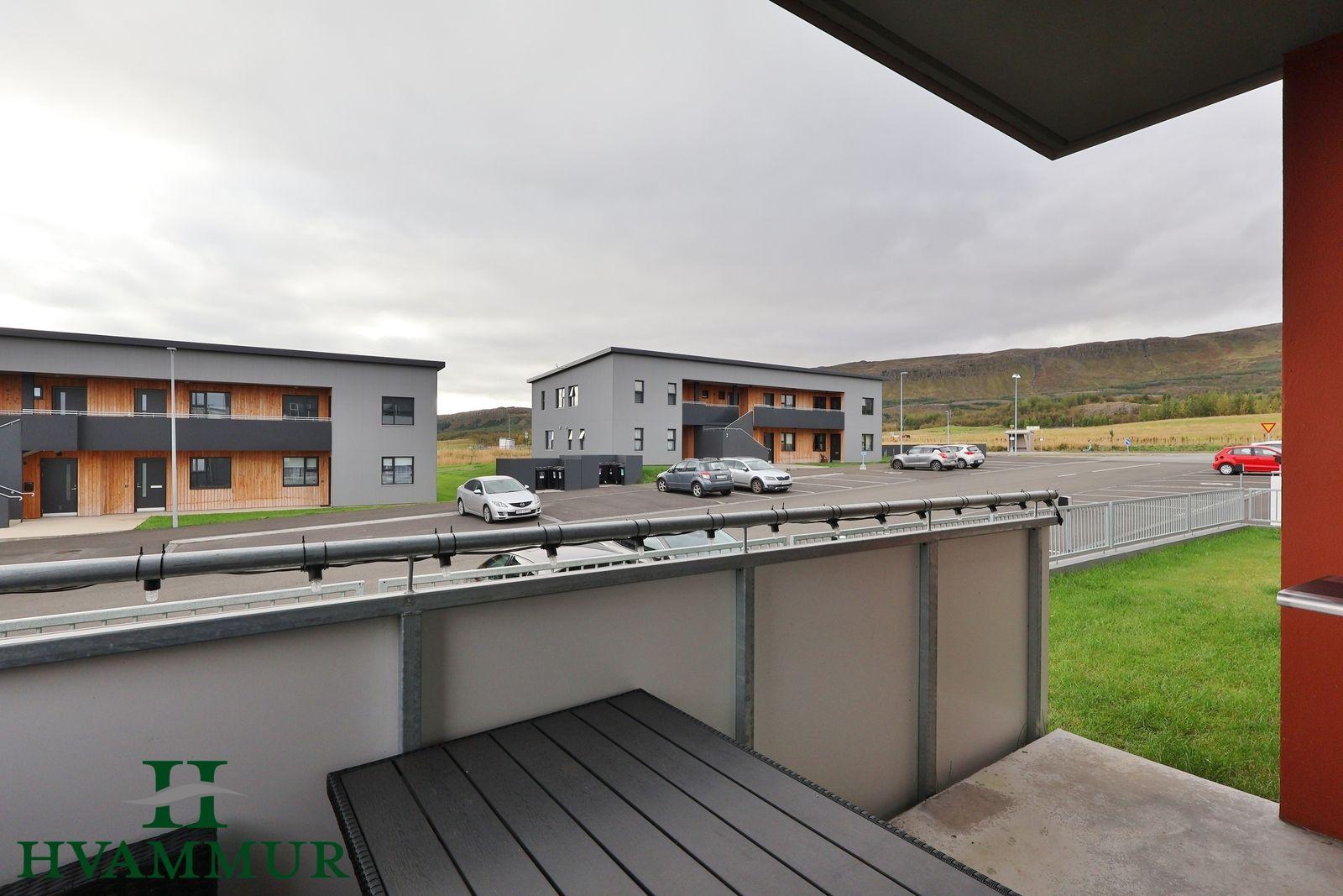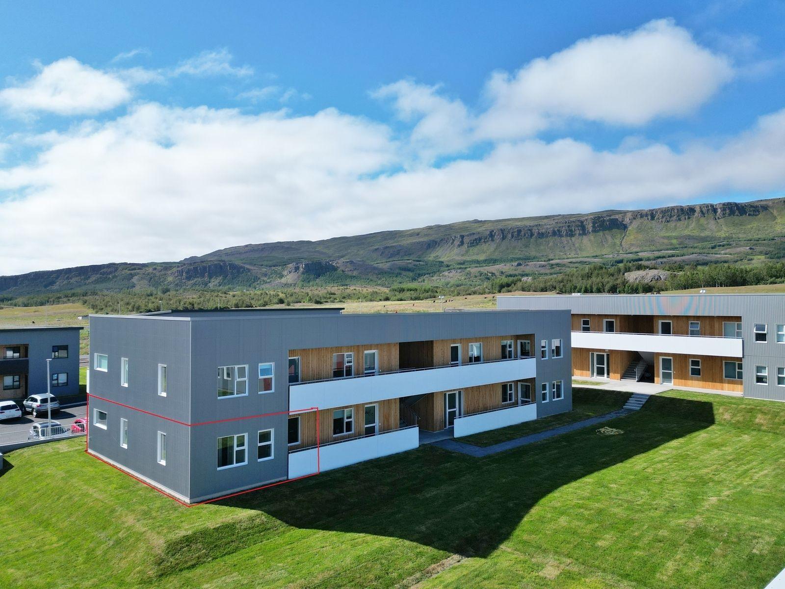 Forstofa er með harðparketi á gólfi og tvöföldum fataskáp. Eldhús, vönduð L-laga svört plastlögð innrétting (Nero oak) með grárri borðplötu og svörtum vask. Mjúklokun er á skúffum og skápum. Uppþvottavél og ísskápur með frysti eru innbyggð í innréttingu og fylgja með við sölu eignar. Stofa og eldhús eru í opnu rými með ljósu harðparketi á gólfi og gluggum til tveggja átta. Úr stofu er rennihurð út á steypta suður verönd, skráð 9,0 m² að stærð. Veröndin er með galvinseruðu járn handriði og klætt með plast plötum. Baðherbergi, vönduð svört plastlögð innrétting með grárri borðplötu og speglaskápur fyrir ofan. Stæði er í innréttingu fyrir þvottavél og þurrkara í vinnuhæð. Upphengt wc og walk-in sturta. Gráar flísar eru á gólfi og hluta veggja. Svefnherbergin eru tvö, bæði með harðparketi á gólfi og fataskápum. Stærð herbergja er skv. teikningum 9,1 og 11,8 m². Geymsla innan íbúðar er skv. teikningum 8,3 m² að stærð og er notuð sem þriðja svefnherbergið í dag, þar er harðparket á gólfi og fataskápur. Í sameigninni á jarðhæðinni er sér geymsla, skráð 4,9 m² að stærð og sameiginleg hjóla- og vagnageymsla. Epoxy efni er á gólfi. Annað - Innréttingar og skápar er plastlagðar, Nero oak og eru frá www.gks.is - Gólfefni, ljóst harðparket er á öllum rýmum að baðherbergi undanskildu þar eru gráar flísar. - Innihurðar eru yfirfelldar hvítar. - Hljóðdempandi plötur í öllum loftum nema á baðherbergi. - Innfelld led-lýsing í loftum. - Stéttar við aðalinngang eru steyptar og með hitalögnum í. - Húsið er steypt og einangrað að utan og klætt með gráu báruðu stáli og timbri við innganga.