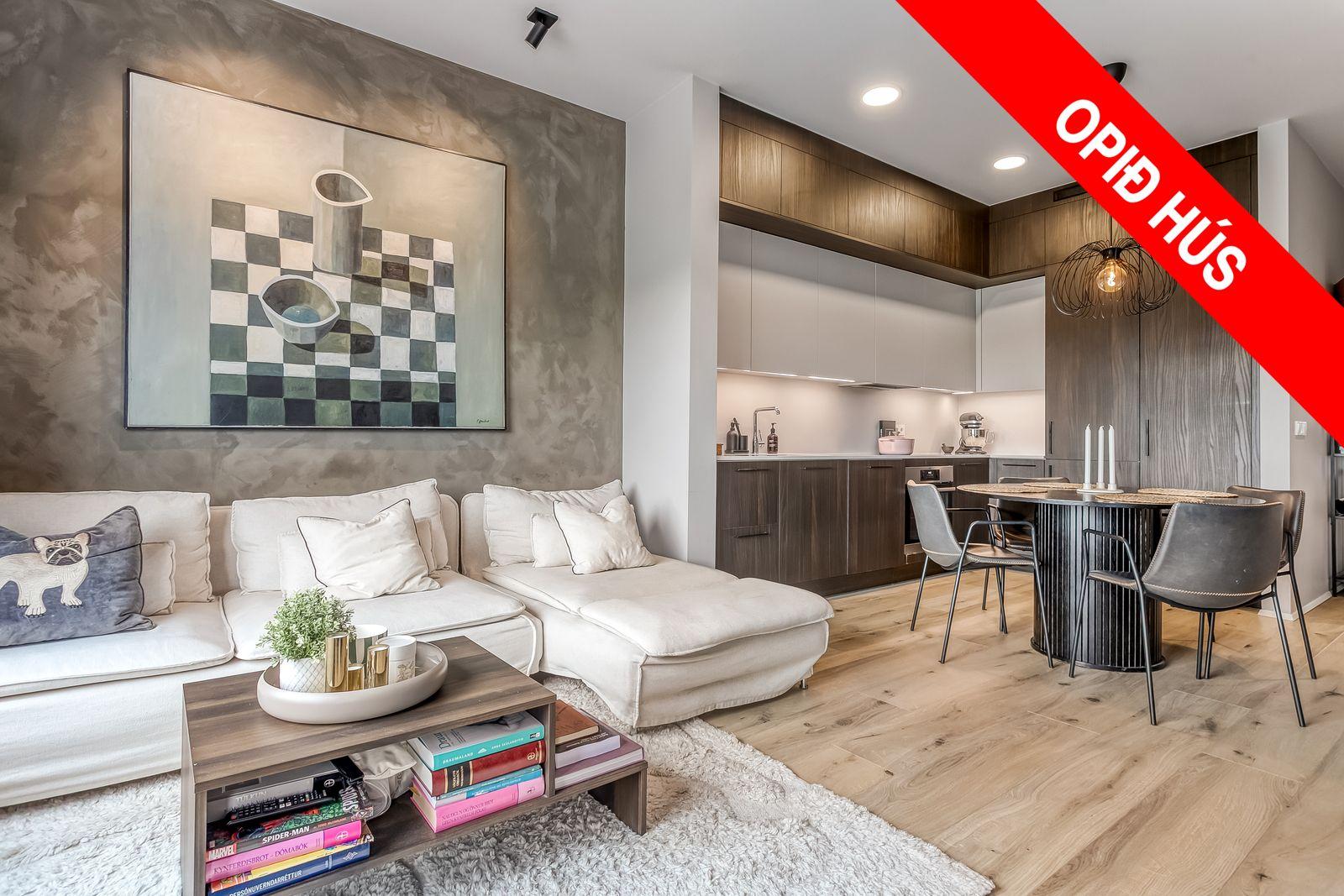 FRÁBÆR KAUP - Domusnova og Ingunn Björg löggiltur fasteignasali kynna einstaklega fallega, bjarta og vel skipulagða 3 herbergja endaíbúð á 3. hæð í einu fallegasta fjölbýlishúsi borgarinnar.  Íbúðin er skemmtilega hönnuð með vönduðum sérsmíðuðum innréttingum sem ná til lofts, quartz stein ná borðplötum, undirlímdir vaskar, vönduð hreinlætis og blöndunartæki, falleg og vönduð gólfefni,  harpðarket á alrými og herbergjum, flísar á gólfi baðherbergis og hluta veggja. Aukin lofthæð ( 280 ) sm.  Svalir með svalalokun út frá stofu sem snúa til suðurs. Einstök fjalla og sjávarsýn er frá húsinu. Afar snyrtileg lóð með fallegum lággróðri, hellulagðir / steyptir göngustígar sem að hluta til eru með snjóbræðslukerfi, falleg kvöldlýsing er á lóðinni.