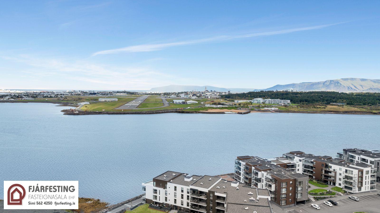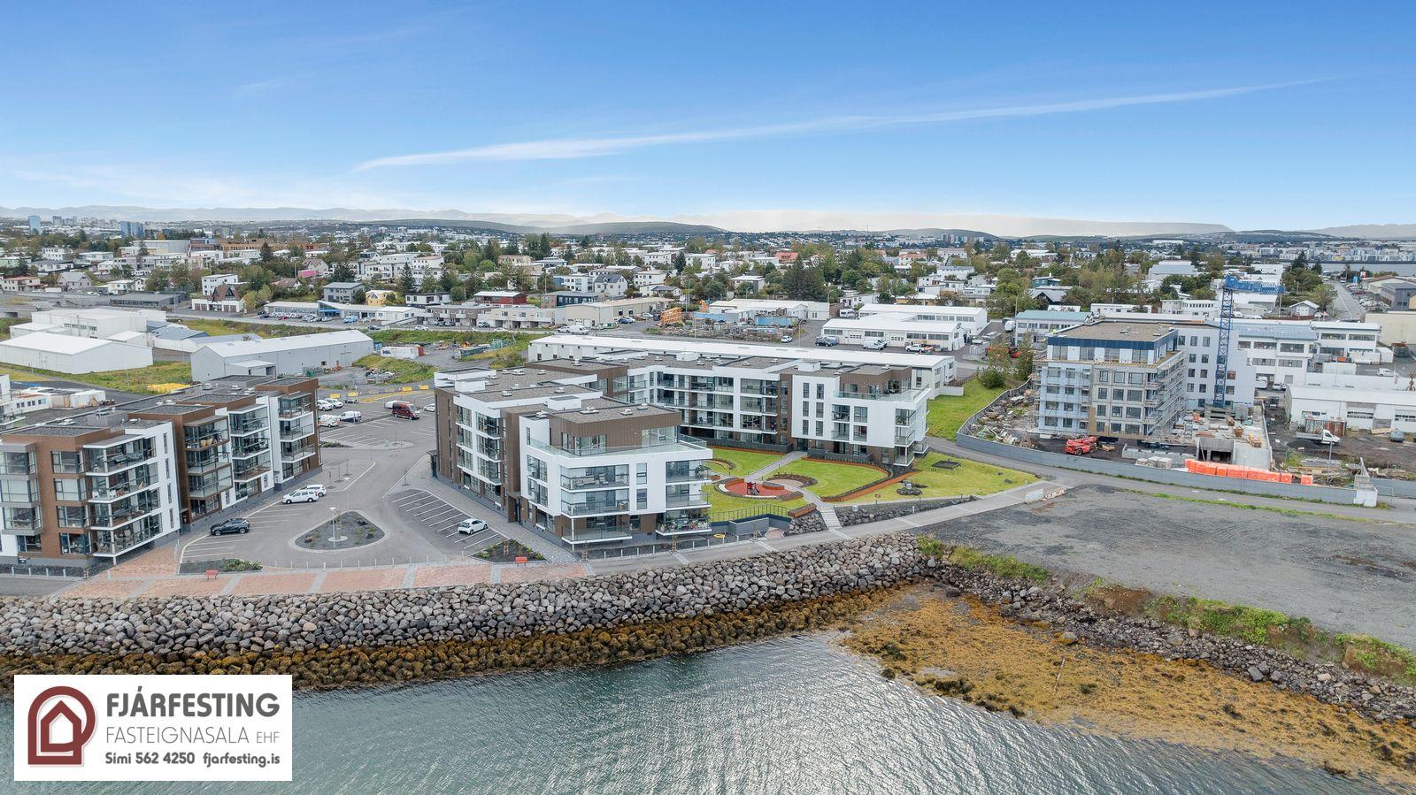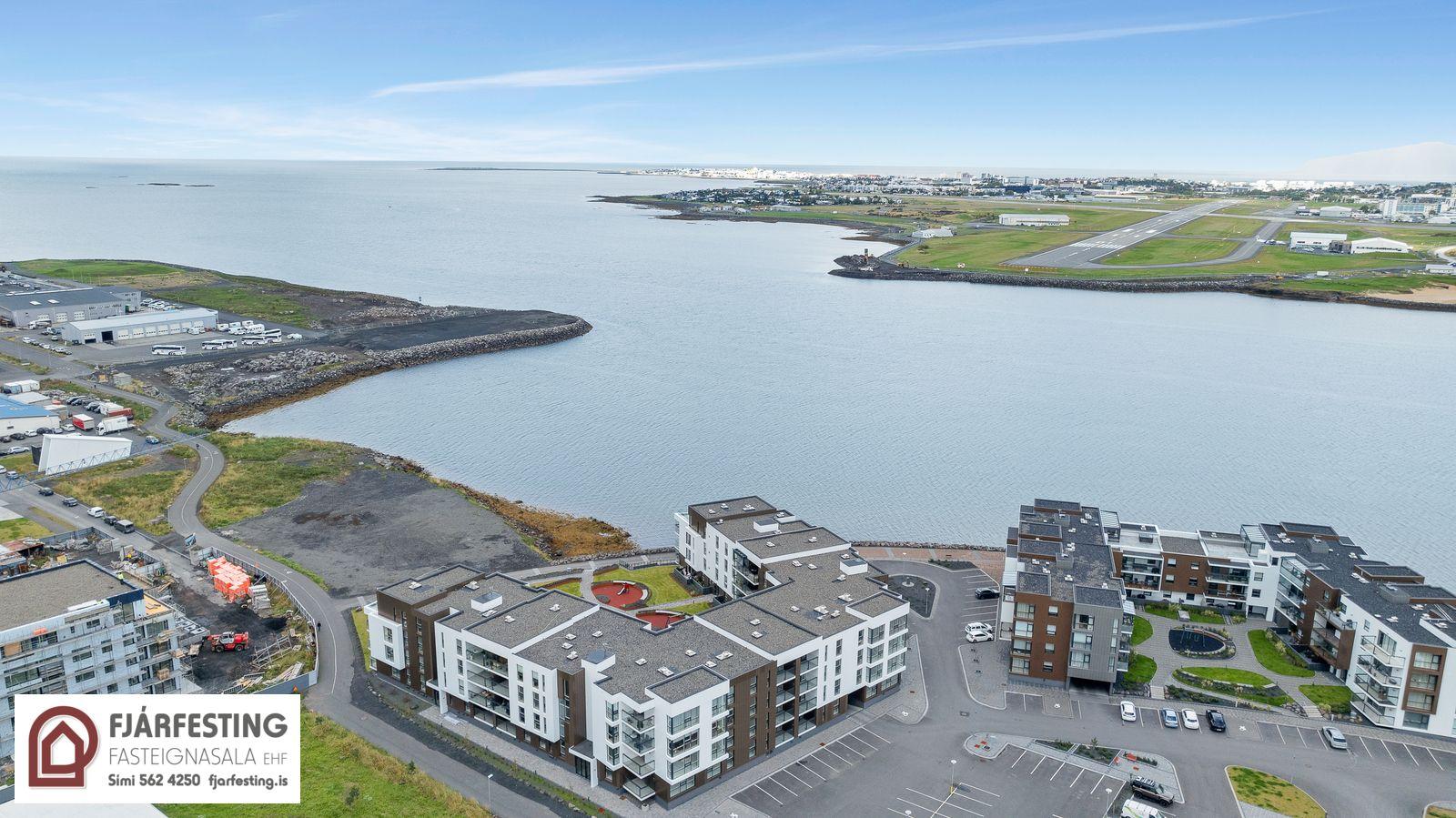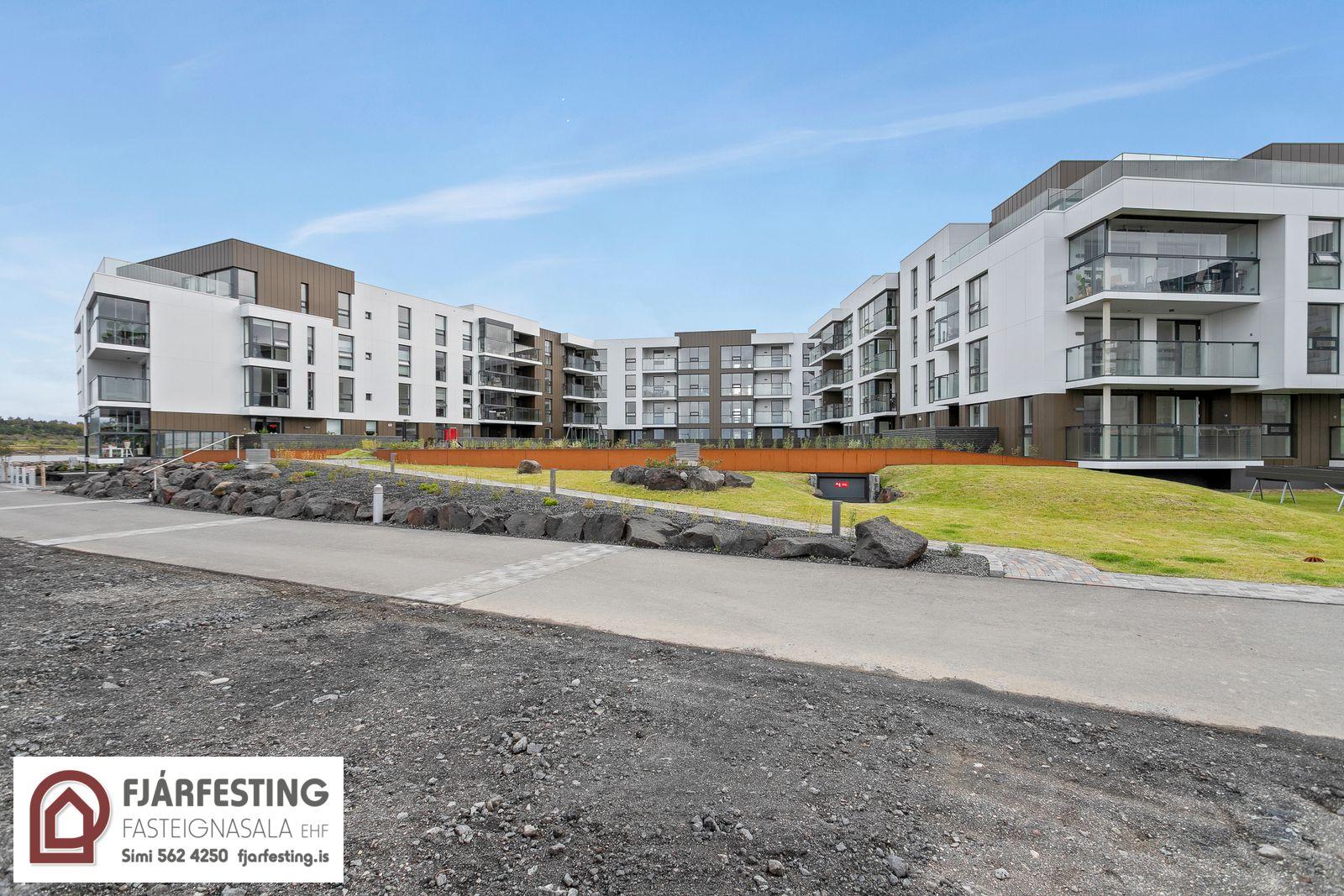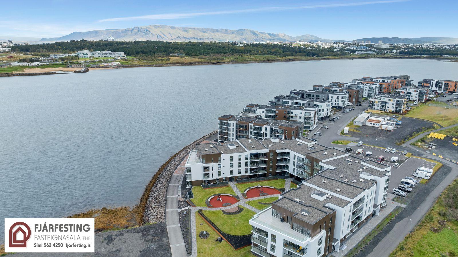 Nánari lýsing: Komið er inn í forstofu með góðum fataskáp. Eldhús með glæsilegri innréttingu og vönduðum AEG eldhústækjum. Þvottahús með flísum á gólfi og innréttingu. Mjög björt stofa og borðstofa, útgengi út á útsýnissvalir til vesturs. Einnig gengið út á rúmgóða verönd á móti norðvestri. Mikið sjávarútsýni er frá stofu. Baðherbergi með flísum á gólfi og veggjum, stórri sturtu með glerþili, innbyggðum vönduðum blöndunartækjum frá Tengi, og fallegri innréttingu frá Brúnás. Hjónaherbergi með fataherbergi og sérbaðherbergi með sturtu og innréttingu. Herbergi með fataskáp.
