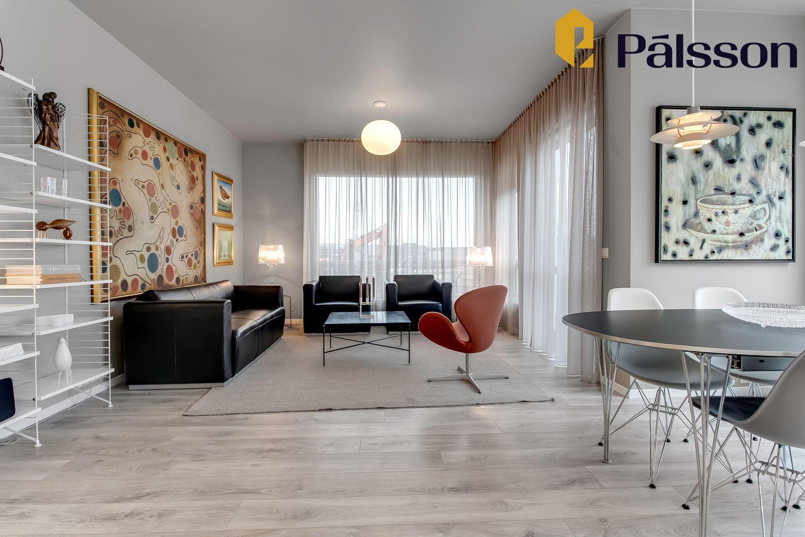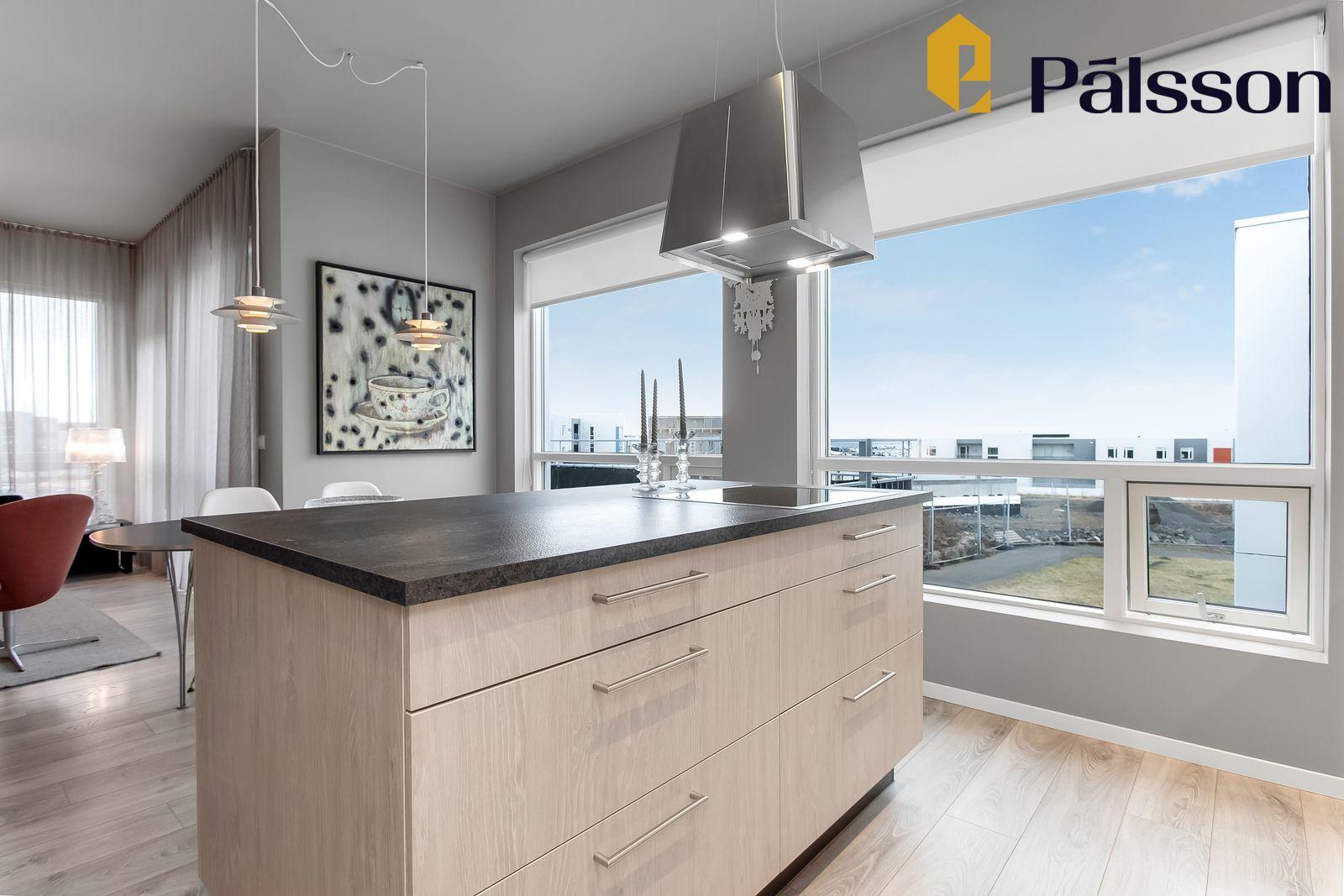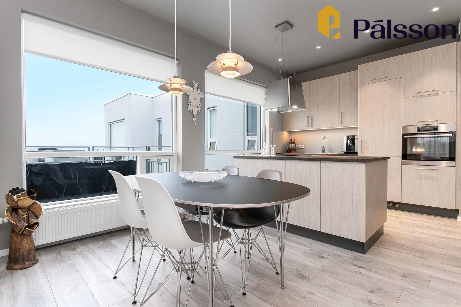 Fasteignasalan Pálsson kynnir: Glæsilega efri sérhæð á frábærum útsýnisstað efst í Urriðaholti í Garðabæ. Um er að ræða eign sem er skráð 115,4fm. Sér inngangur, vandað efnisval s.s. Brúnás innréttingar, harðparket frá Álfaborg, gardínur frá Sólargluggatjöldum og bæði baðkar og sturta á baðherbergi, þrjú svefnherbergi og mikið útsýni. Bílastæði með hleðslustöð og sameiginleg hjóla og vagnageymsla. Rúmgóðar suðvestur svalir. Mjög stutt er í leikskóla og skóla sem og út í fallega náttúru.