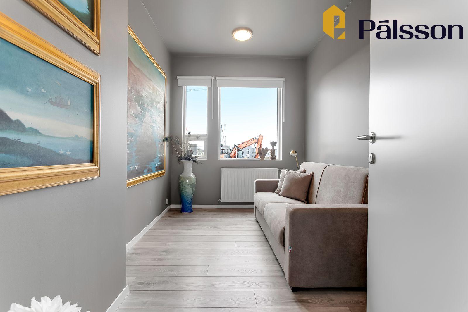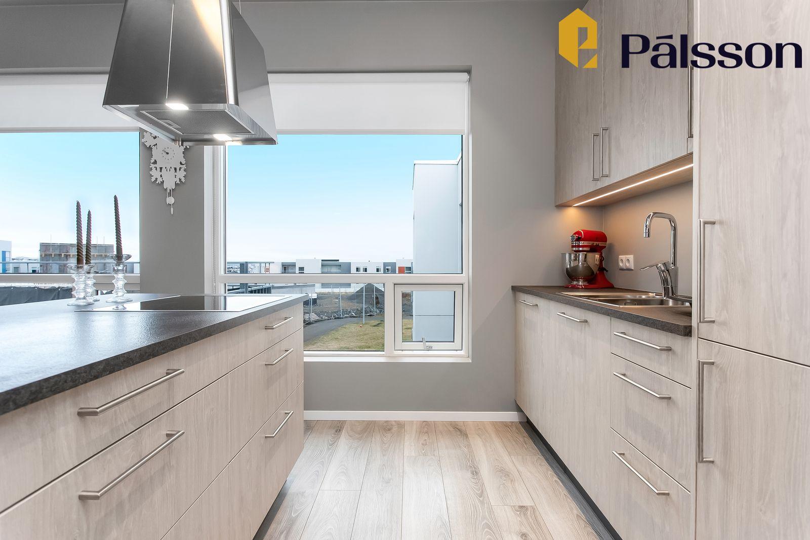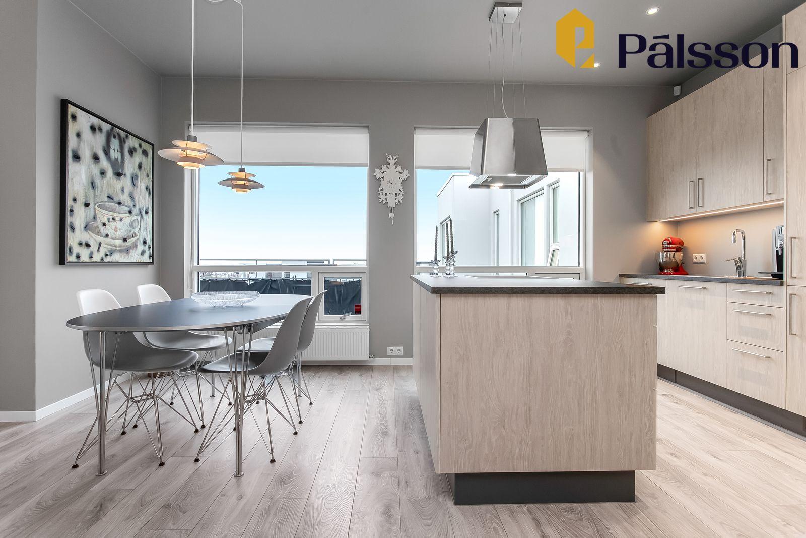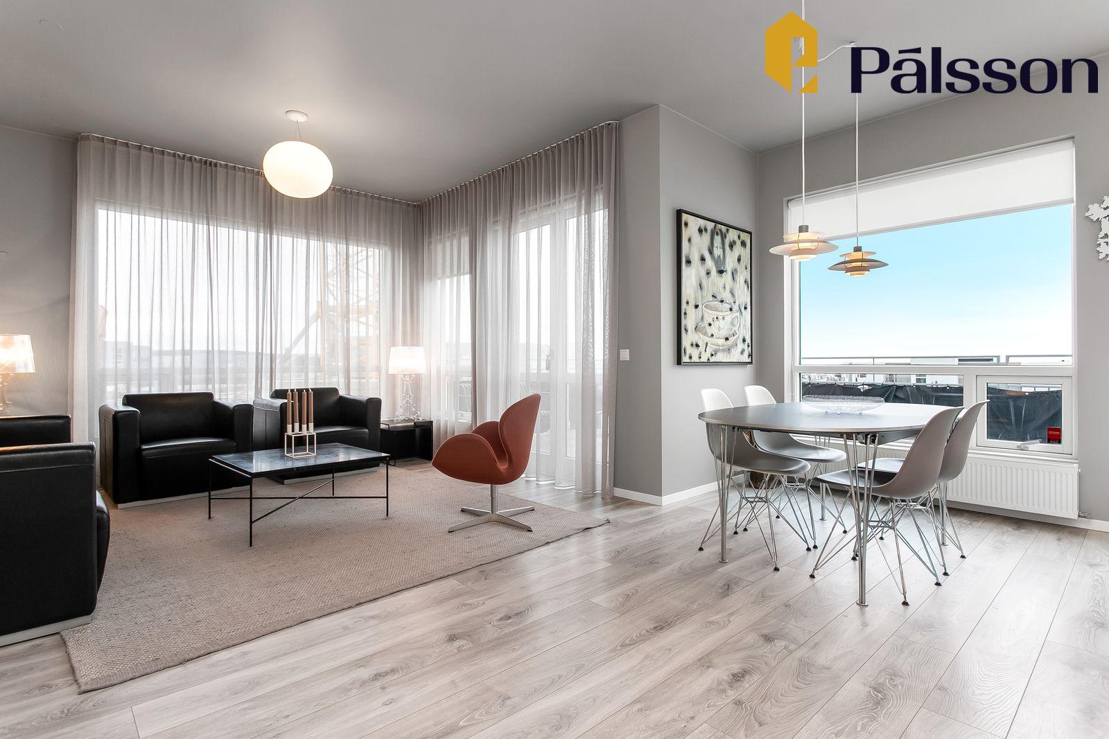 Fasteignasalan Pálsson kynnir: Glæsilega efri sérhæð á frábærum útsýnisstað efst í Urriðaholti í Garðabæ. Um er að ræða eign sem er skráð 115,4fm. Sér inngangur, vandað efnisval s.s. Brúnás innréttingar, harðparket frá Álfaborg, gardínur frá Sólargluggatjöldum og bæði baðkar og sturta á baðherbergi, þrjú svefnherbergi og mikið útsýni. Bílastæði með hleðslustöð og sameiginleg hjóla og vagnageymsla. Rúmgóðar suðvestur svalir. Mjög stutt er í leikskóla og skóla sem og út í fallega náttúru.