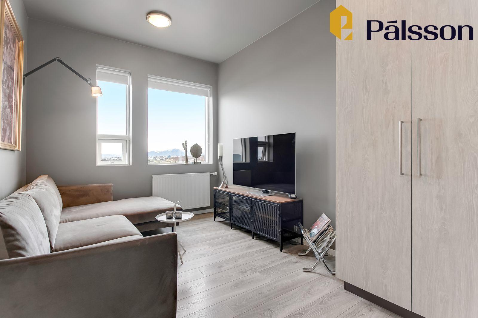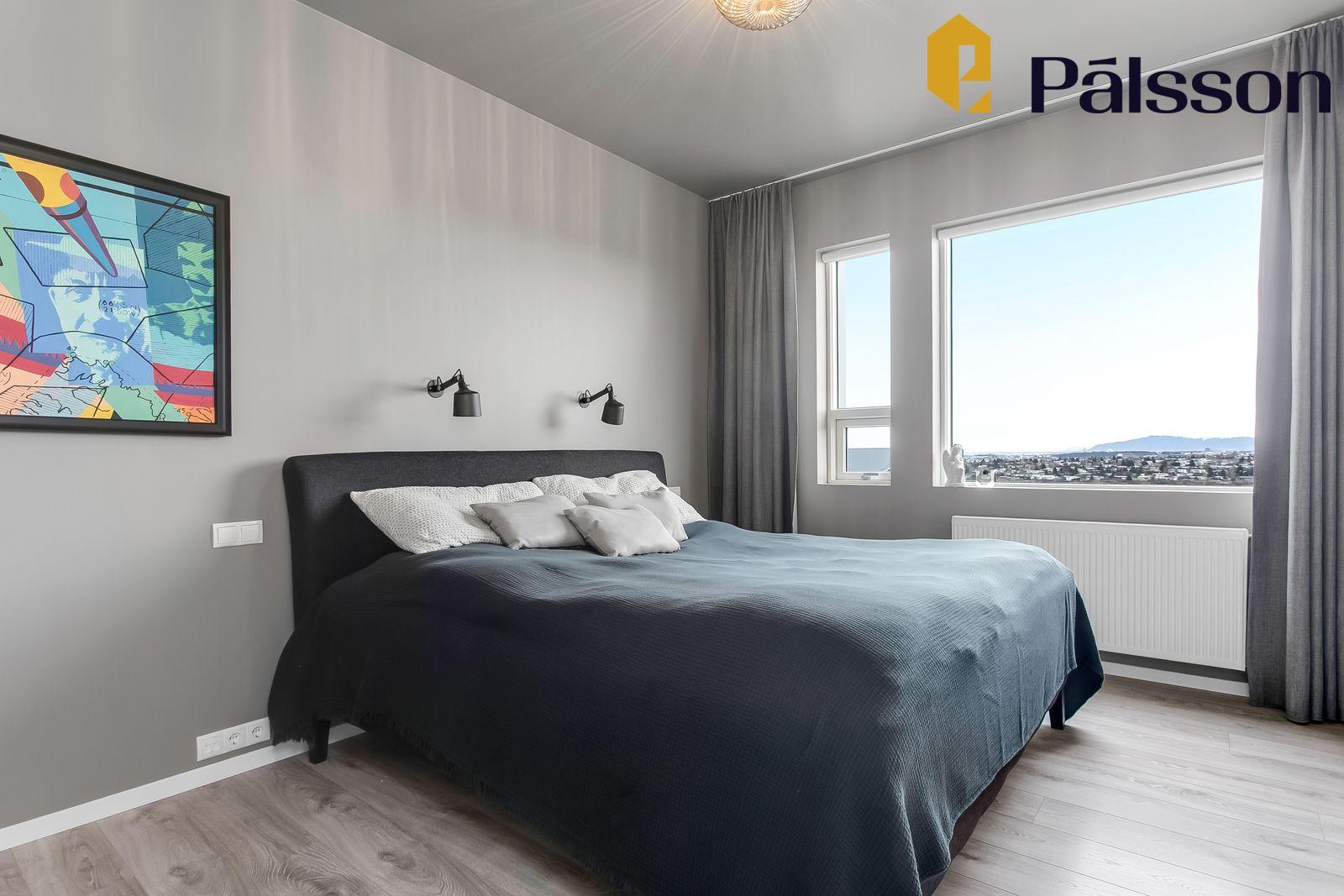 Stofa: Stofan er björt og falleg og opin við eldhús. Harðparket er á gólfi, stórir gluggar og fallegt útsýni. Útgengt er á mjög rúmgóðar s/v svalir.