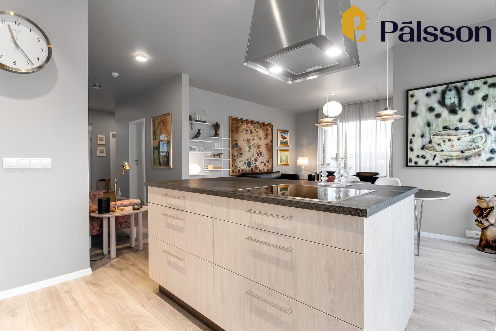 Eldhús: Eldhúsið er með fallegri ljósri innréttingu frá Brúnás, innbyggð uppþvottavél og innbyggður ísskápur sem fylgja með. Keramikhelluborð er með háf yfir. Eldhústæki eru frá AEG. Gott skápapláss og harðparket er á gólfi