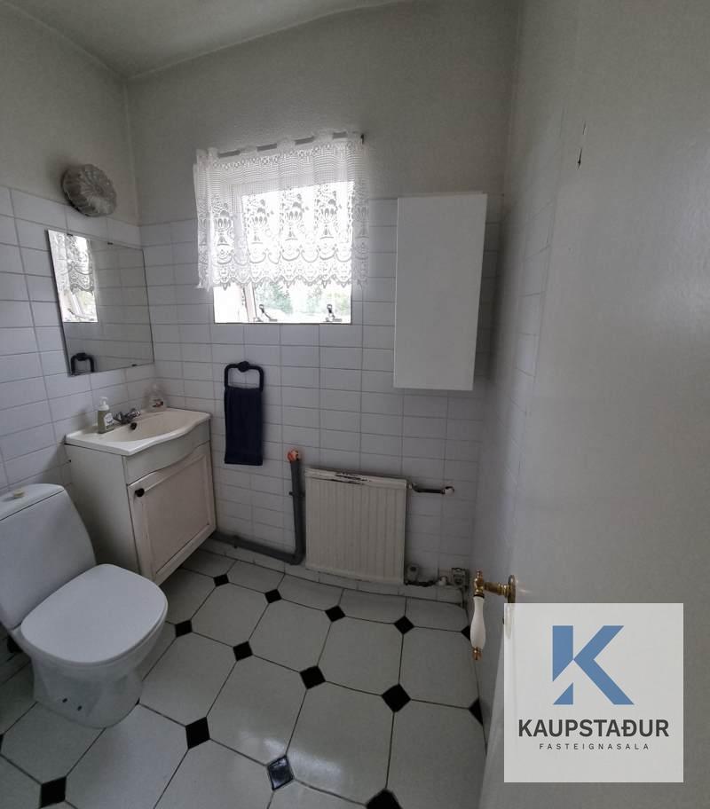 Salerni, flísalagt í hólf og gólf, vaskinnrétting, standandi salerni, gluggi.