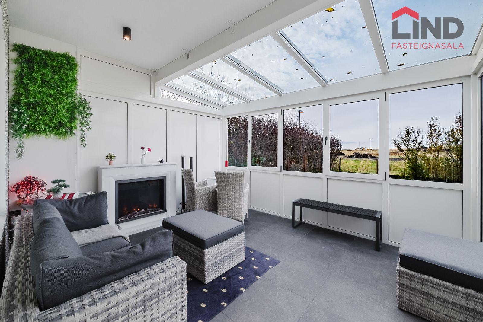 Sólskáli er bjartur með gólfita, flísum á gólfi og útgengi út í afgirtan suðurgarð.