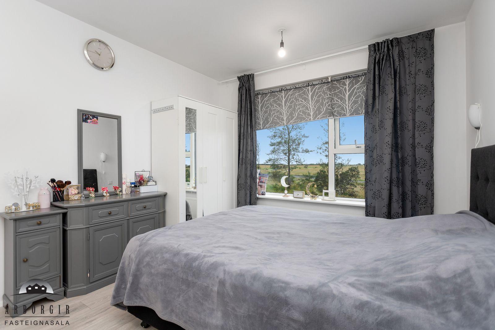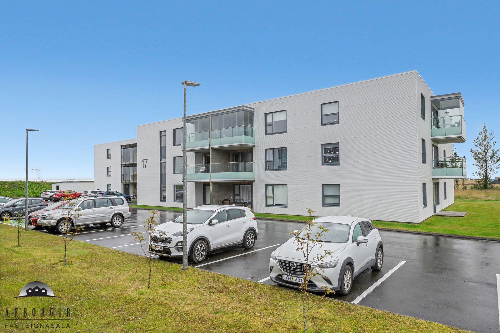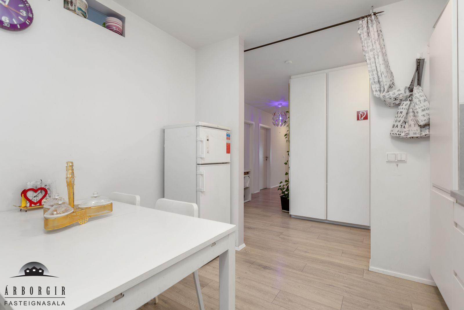 Nánari lýsing: Forstofa með fataskáp og parketer á gólfi. Fjögur svefnherbergi eru í eigninn og fataskápar í þeim öllum. Alrými er rúmgott og skiptist það í borðstofu og stofu, einnig er útgengt á rúmgóðar svalir með svalarlokun. Eldhúsið er með góðu ljósa innréttingu og er gott skápláss í henni. Einnig pláss fyrir eldhúskrók. Baðherbergi er flísalagt, upphengt salerni, rúmgóð sturta og fín innréttingu. Í þvottaherbergi er tengi fyrir þvottvél og þurrkara einnig skolvaskur. Sér geymsla í sameign hússins ásamt sameiginlegri hjóla og vagnageymslu.