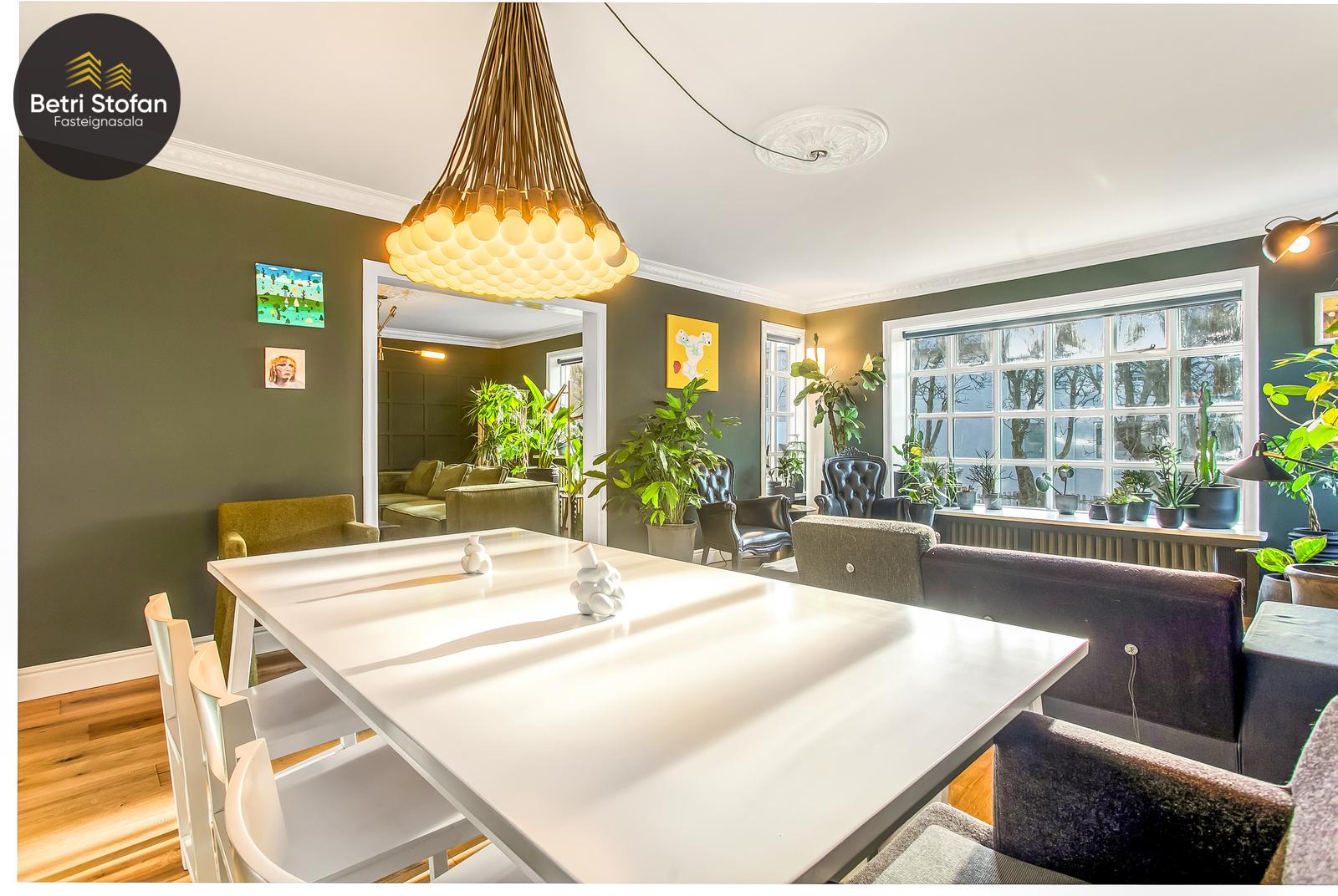 Eignin er alls 208,7 fm að stærð sem skiptist þannig að aðalhæðin er 147,2 fm, tvær geymslur/herbergi (opið á milli þeirra) 21,5 fm og bílskúr (með geymslu við endan) er 40 fm. Íbúðin hefur verið mikið endurnýjuð seinustu mánuðina.