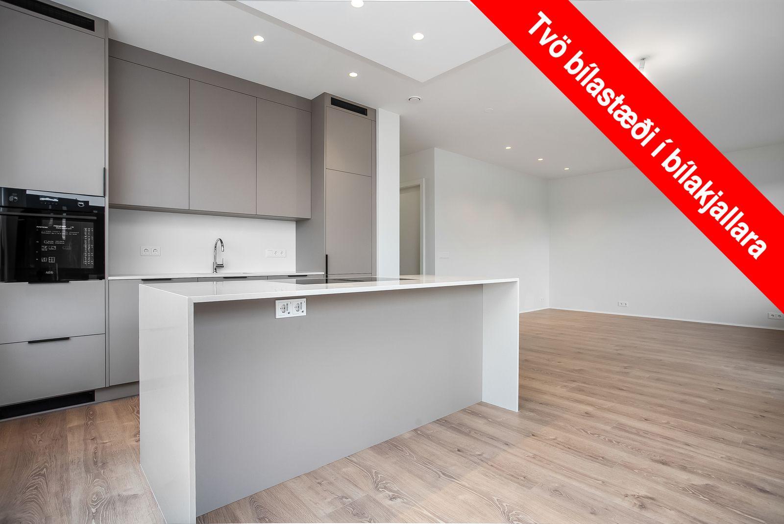 Eldhús: Parket á gólfi, gott skápa- og borðpláss, innréttingin er frá Selós, framhliðar eru matt beige, grábrúnar að lit, borðplötur eru úr 20mm Quartz steini með undirlímdum vaski úr stáli. Eldhústæki eru frá AEG. Innbyggður ísskápur, frystir og uppþvottavél fylgir. Skúffur eru með mjúklokunarbúnaði, og LED lýsing undir efri skápum. Höldur eru svartar grip höldur frá Selós.