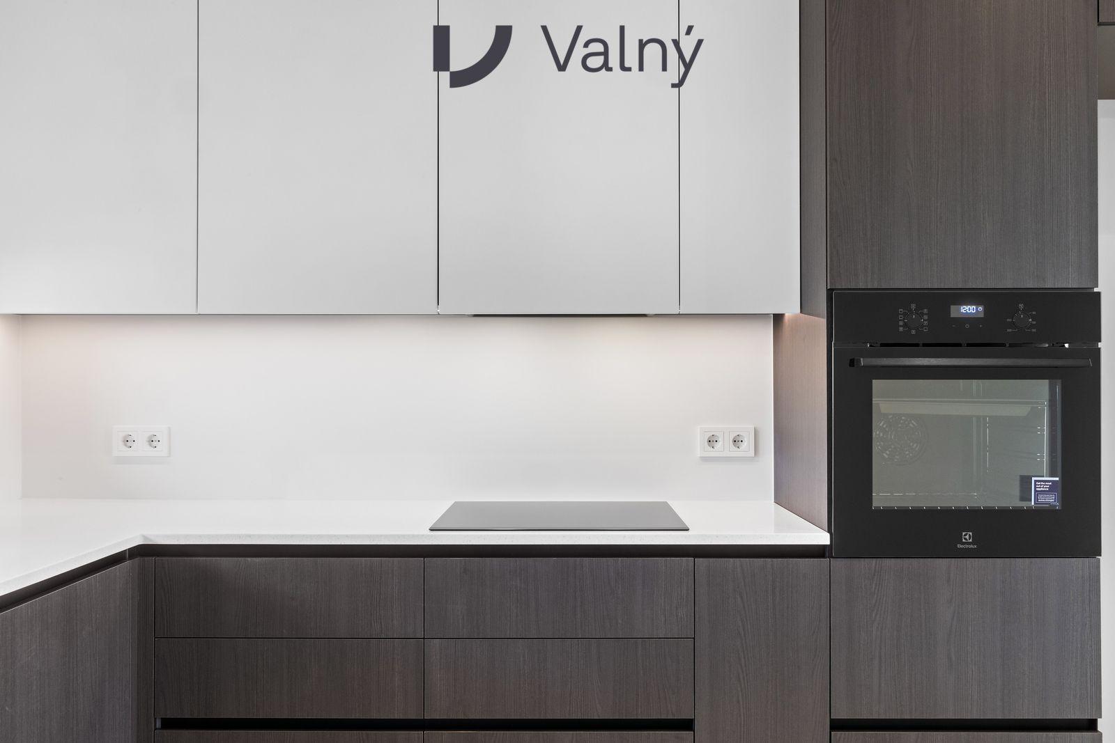 Eldhús með sérsmíðaðri innréttingu, möguleika á innbyggðri uppþvottavél, bakaraofni í vinnuhæð og helluborði. Borðplata úr ljósum Acryl-steini með vaski og innfelldri loftlýsingu. Heimilistæki frá AEG.