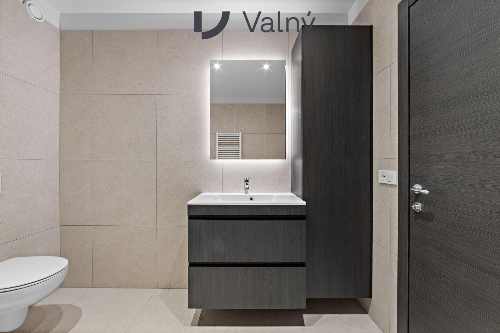 Baðherbergi með innréttingu, upphengdu salerni, handklæðaofni og sturtu með glerskilrúmi. Aðstaða fyrir þvottavél og þurrkara í sérsmíðaðri innréttingu. Gólf og veggir flísalagðir, sturta flísalögð með innfelldu niðurfalli og innfelldri lýsingu. Blöndunartæki Grohe.