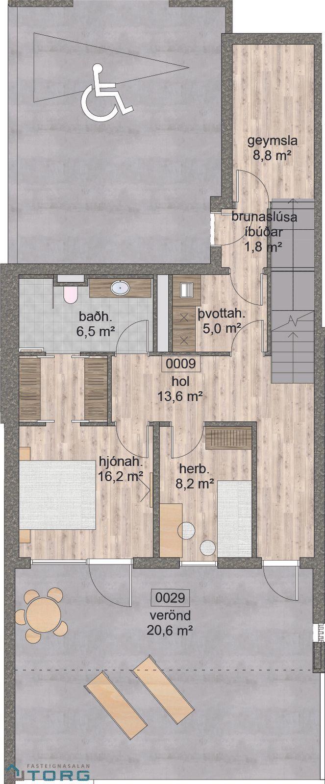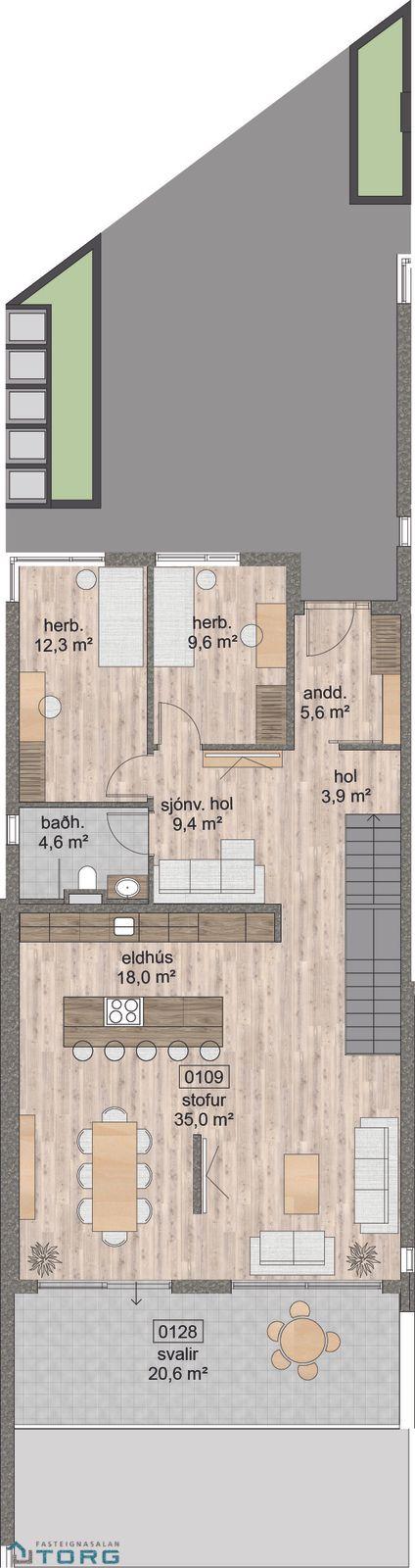 Fossvogsvegur 14 (íbúð 109) Glæsileg og vel skipulögð 5 herbergja íbúð á tveimur hæðum með sérinngangi í fallegu nýju álklæddu húsi. Birt stærð er 190,8 fm. Stæði íbílageymslu merkt B-11. Íbúðinni fylgir bæði svali og verönd Íbúðin er öll hin glæsilegasta með fallegum innréttingum frá Brúnás. Borðplötur verða úr Virgo Quartz steini frá S.Helgasyni. Vönduð AEG eldhústæki þ.m.t. innbygður frystiskápur, innbyggður kæliskápur, innbyggð uppþvottavél, vínkælir, bakarofn og örbylgjuofn. Baðherbergi verður flísalagt gólf og veggir. Íbúðin er með gólfhita. Rúmgóðar svalir út frá stofu á efri hæð og góð verönd útfrá neðri hæð. Allar nánari upplýsingar veitir Sigríður Rut lgfs. í gsm. 699-4610 eða siggarut@fstorg.is og Gunnar Patrikur lgfs. í gsm. 822-9415 eða gunnar@fstorg.is og Helgi lgfs. í gsm 780-2700 eða helgi@fstorg.is