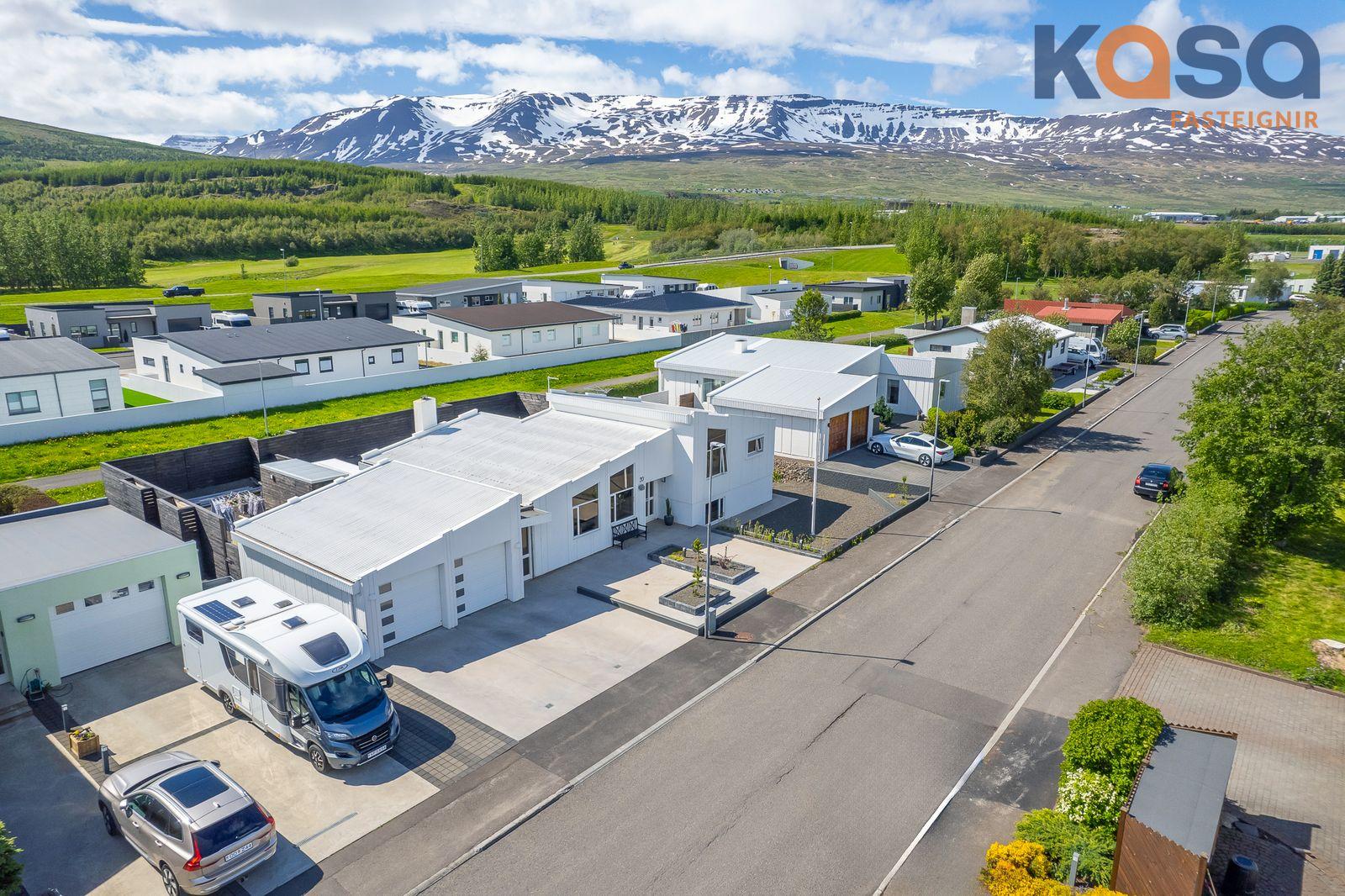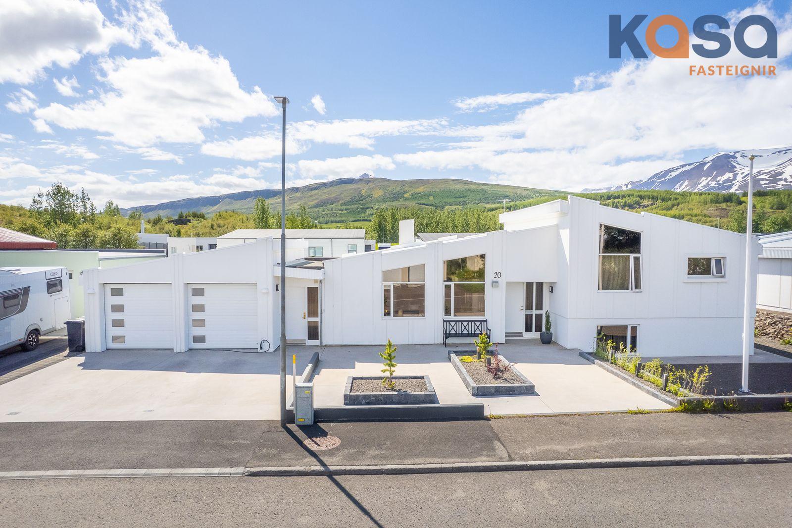 Eikarlundur 20 - Glæsilegt 288,9 fm 8 herbergja einbýlishús á pöllum með tvöföldum bílskúr ásamt stórum steyptum palli með heitum potti, vaðlaug, sauna, sturtuaðstöðu og útieldhúsi.