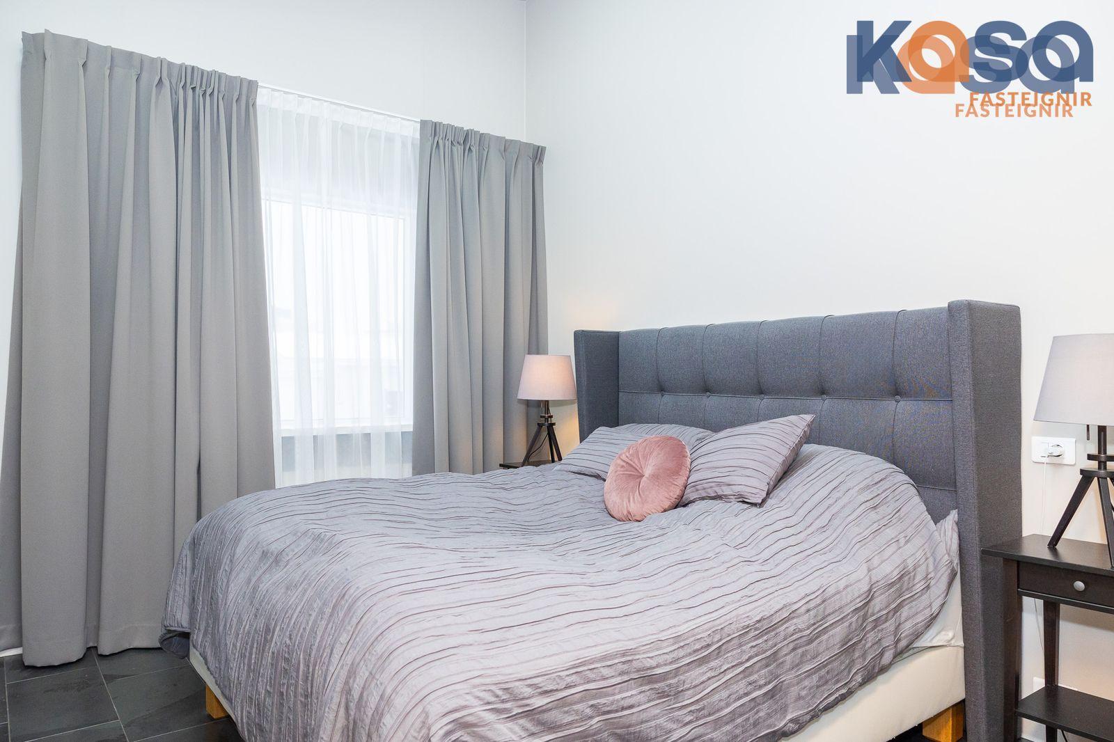Baðherbergi: Flott innrétting með stein plötu. Borðvaskur er á plötunni. Stór sturta með sturtugleri. Vegghengt salerni og handklæðaofn. Flísalagt í hólf og gólf.