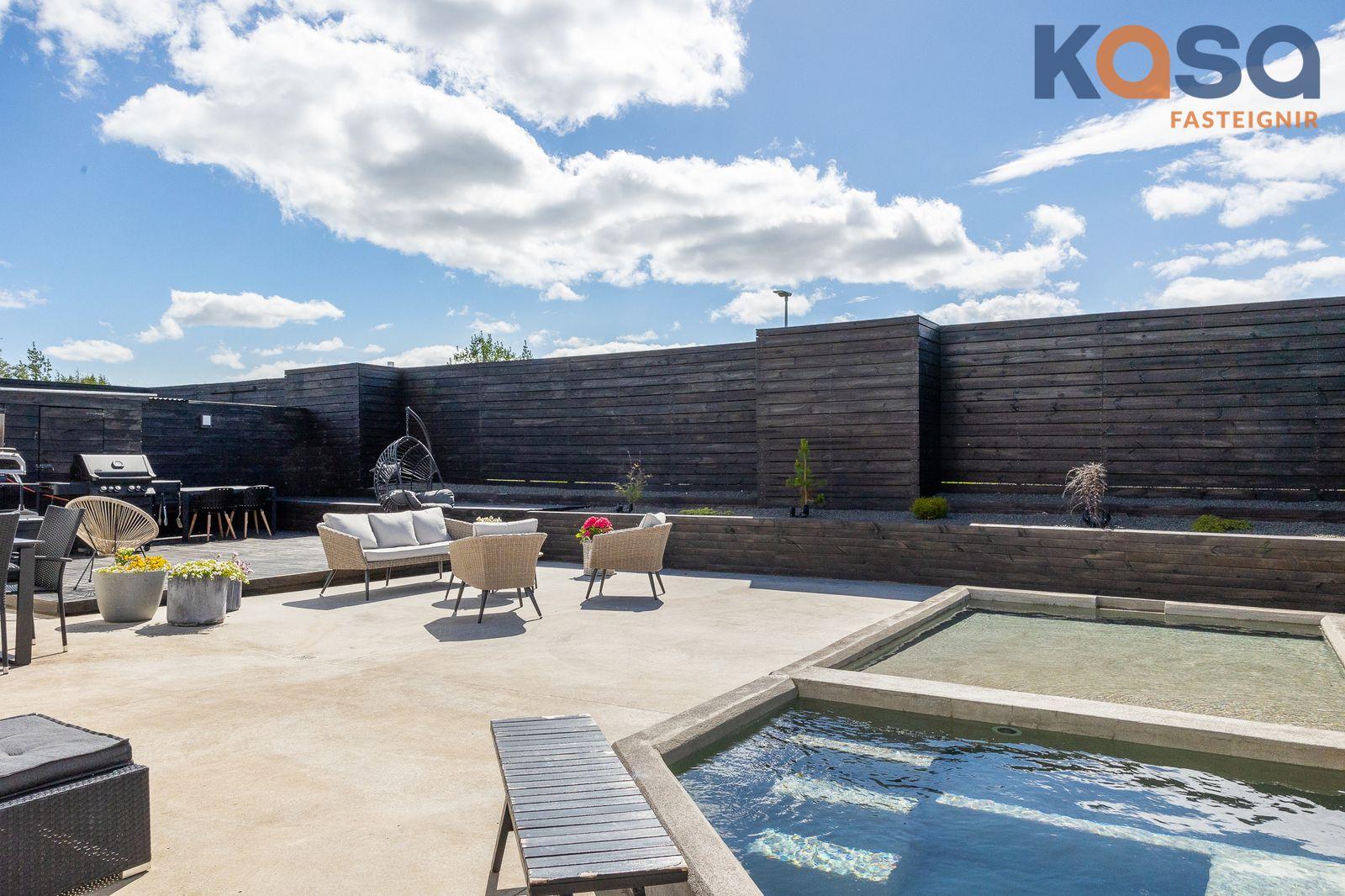 Sólpallur: Út frá aðalhæð er gengið á mjög stórann steyptan sólpall með steyptum heitum potti ásamt vaðlaug. Einnig er útihús sem er einangrað, þar er stórt sauna, salerni og sturtuaðstaða. Búið er að gera aðstöðu fyrir útieldhús á pallinum og gera góðan geymsluskúr.