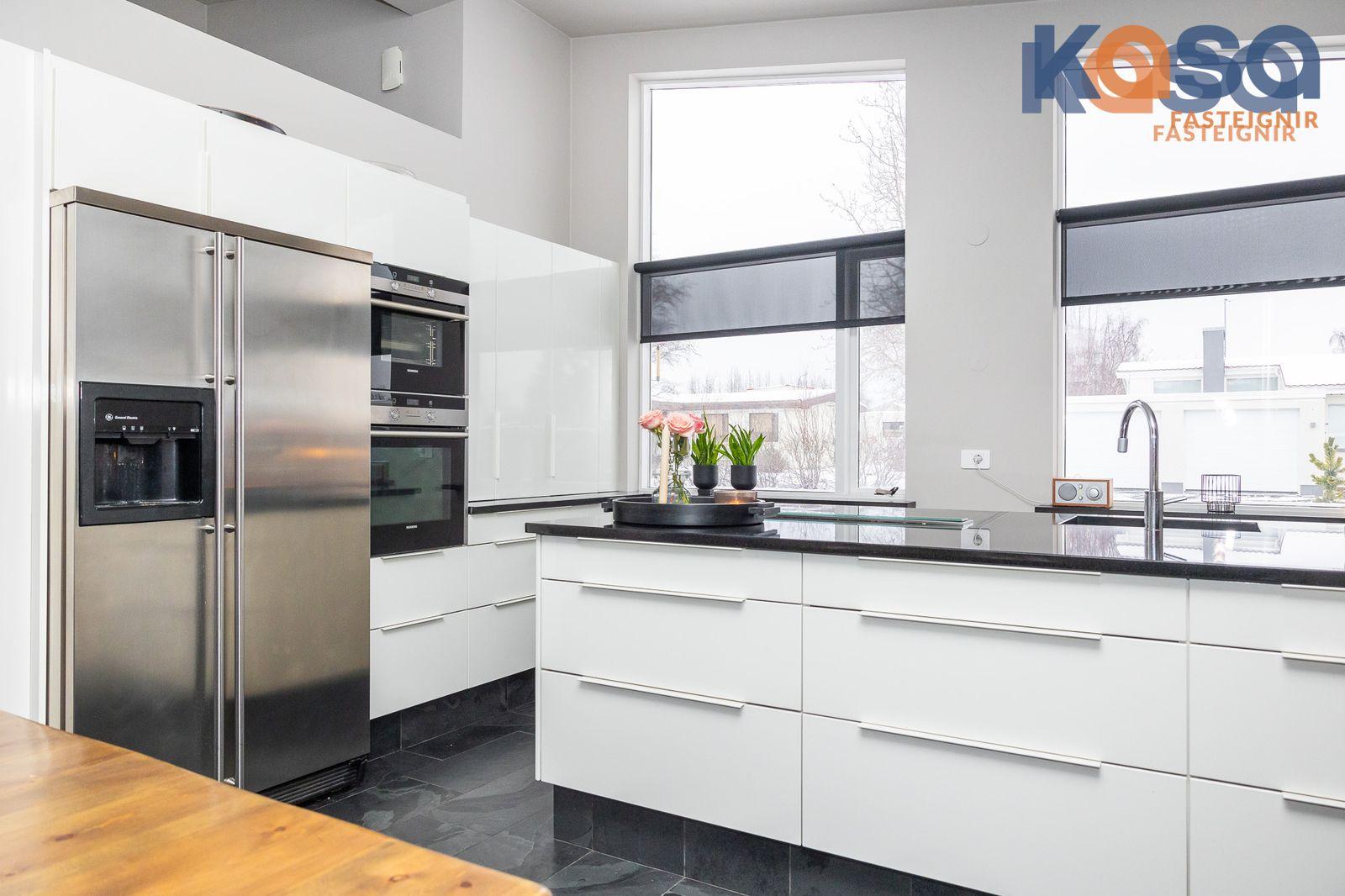 Eldhús: Rúmgóð innrétting með góðu skápa og skúffuplássi. Pláss er fyrir tvöfaldan ísskáp í innréttingu. Bakara- og örbylgjuofn í vinnuhæð. Tækjaskápur. Eyjan er með skúffum beggja vegna, stórt