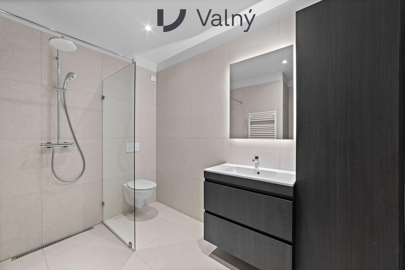 Baðherbergi með innréttingu, upphengdu salerni, handklæðaofni og sturtu með glerskilrúmi. Aðstaða fyrir þvottavél og þurrkara í sérsmíðaðri innréttingu. Gólf og veggir flísalagðir, sturta flísalögð með innfelldu niðurfalli og innfelldri lýsingu. Blöndunartæki Grohe.